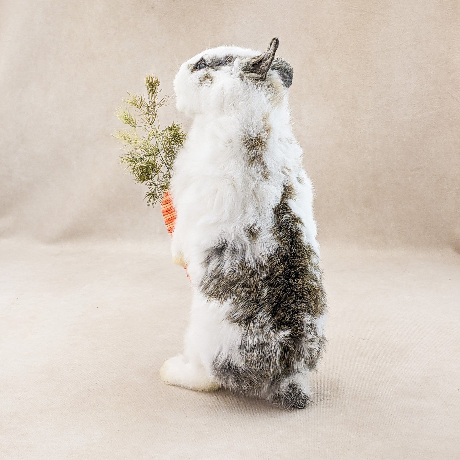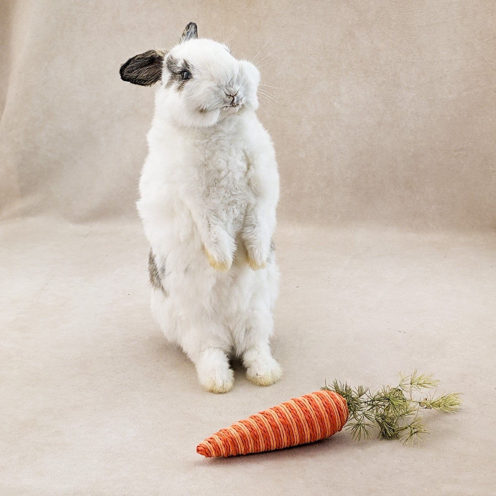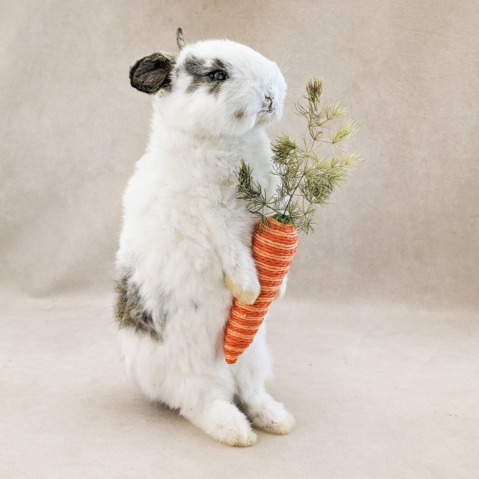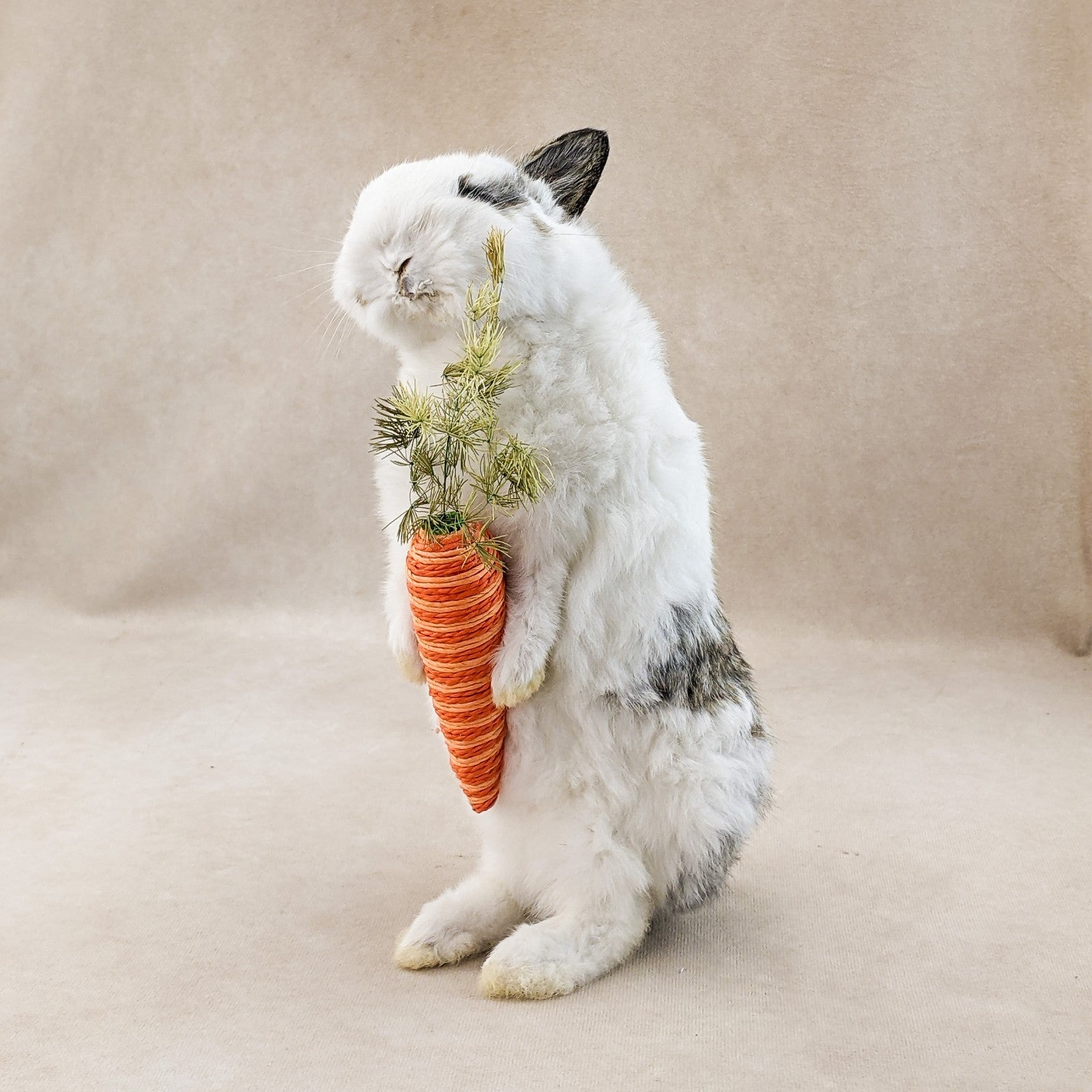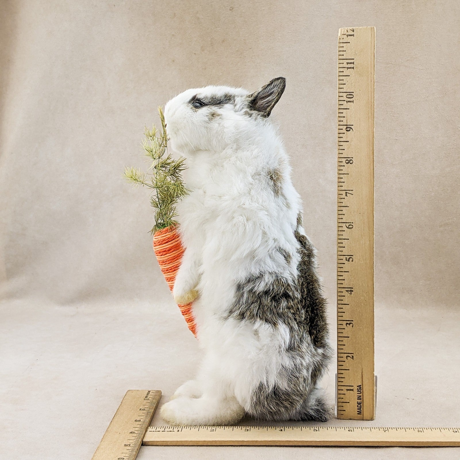 T20n  #6 "Puddin" the Adorable Baby Bunny!  Aww,  These little rabbits are beautiful!  There are several of these listed so please see pictures for particulars on each one.   These Baby Bunnies really do need a forever home!  This little one would look great in any collection!  They are all natural death and where not killed for this purpose. "Puddin" is standing at approx. 6 x 11 x 4".  Last picture will show bunny with ruler for size. The carrot is a removable prop and does come with the rabbit.