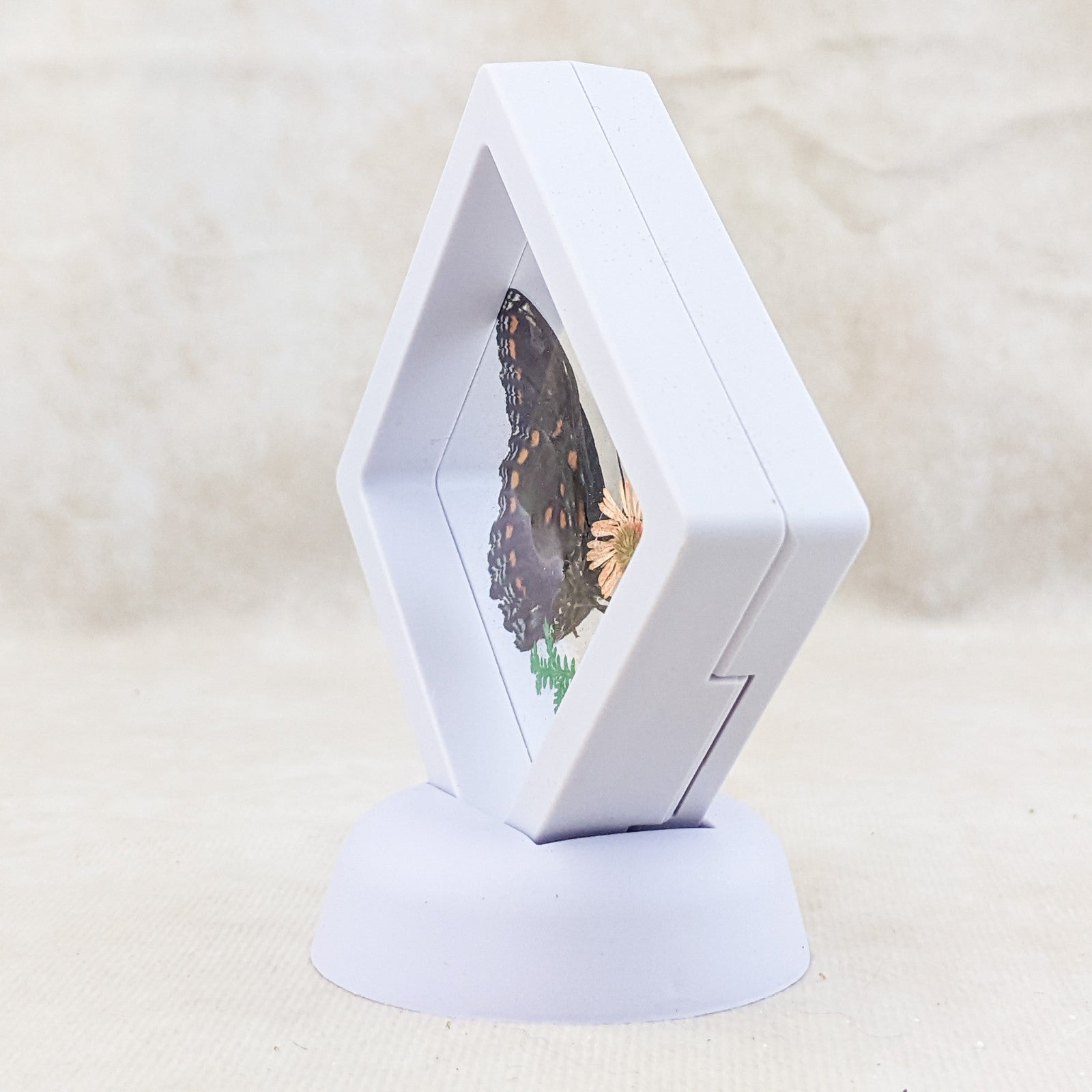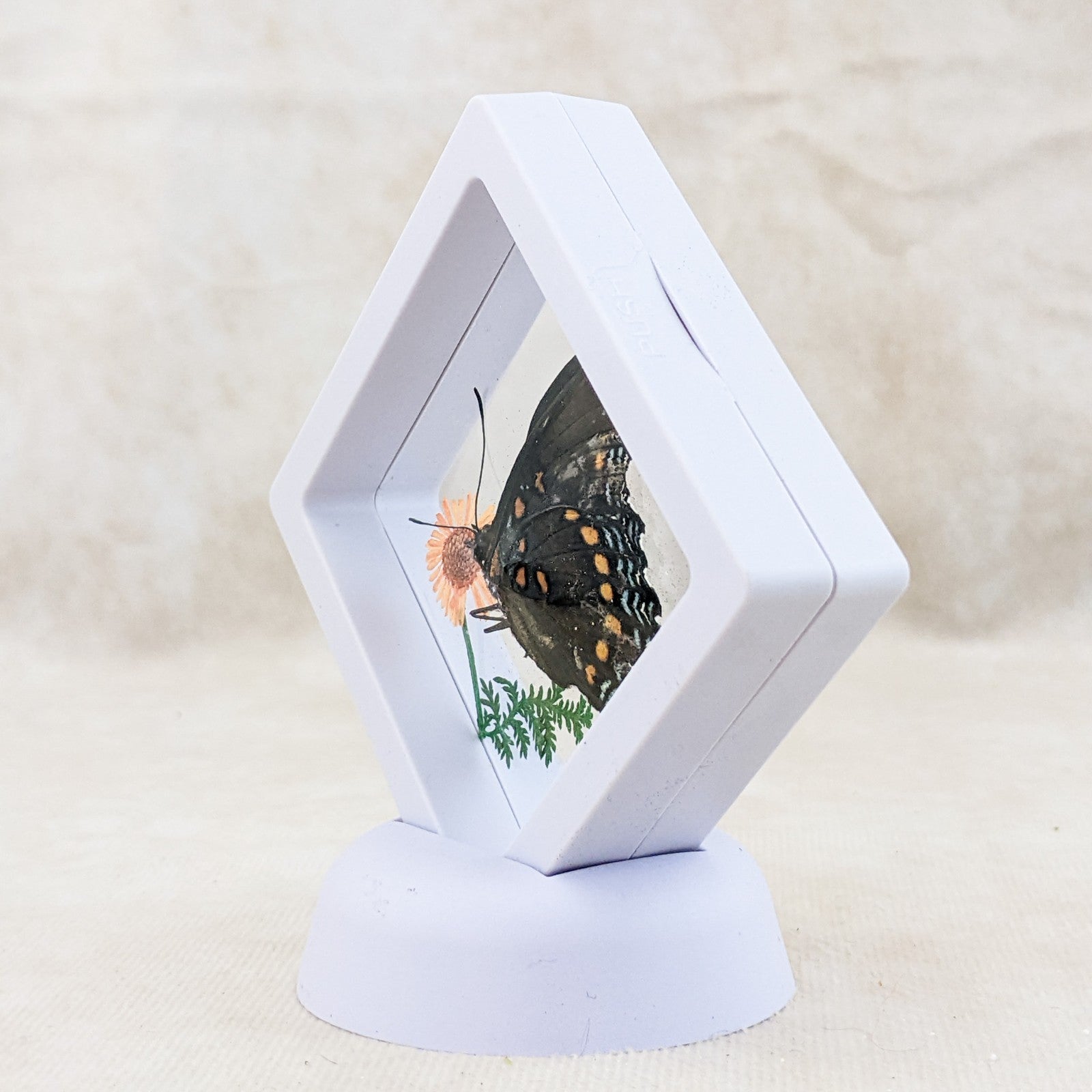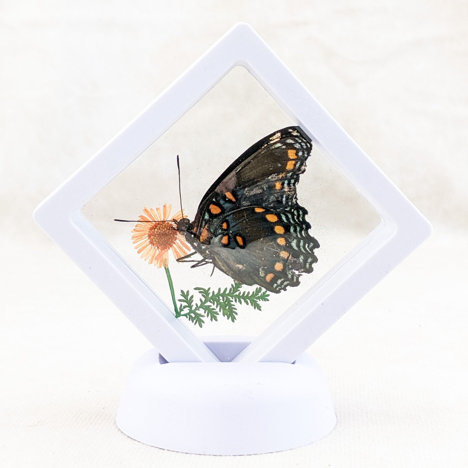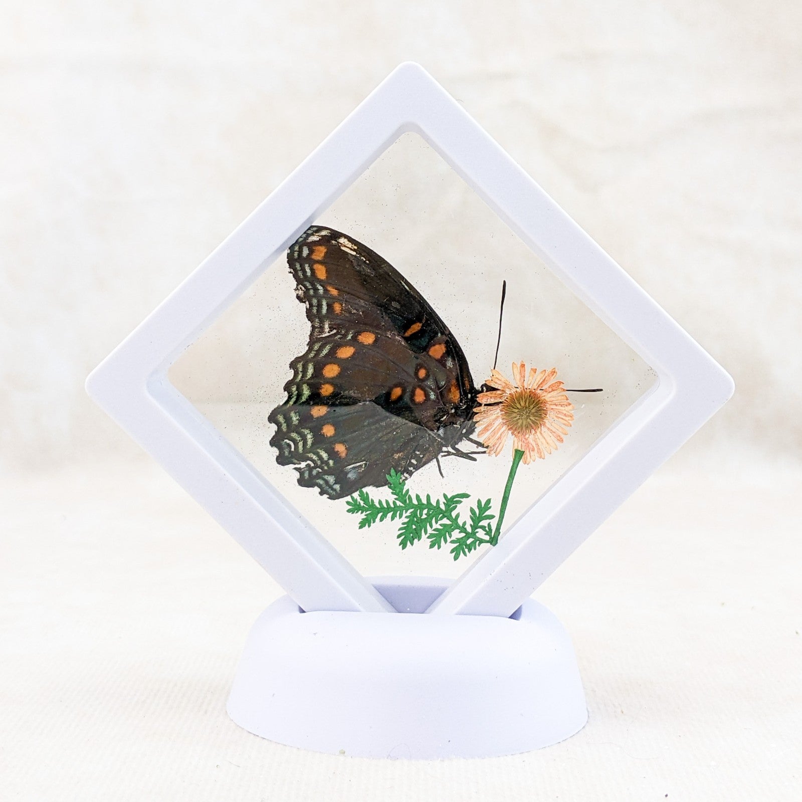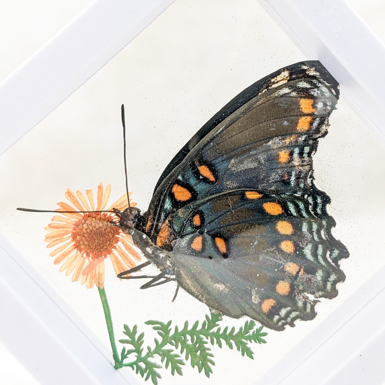 BF11a # 9 This is a very nice Display with a beautiful butterfly. This would look great in any collection and also a great gift for those that love Butterflies! This display is approx. 4 x 3 3/4" He is surrounded by preserved fern.