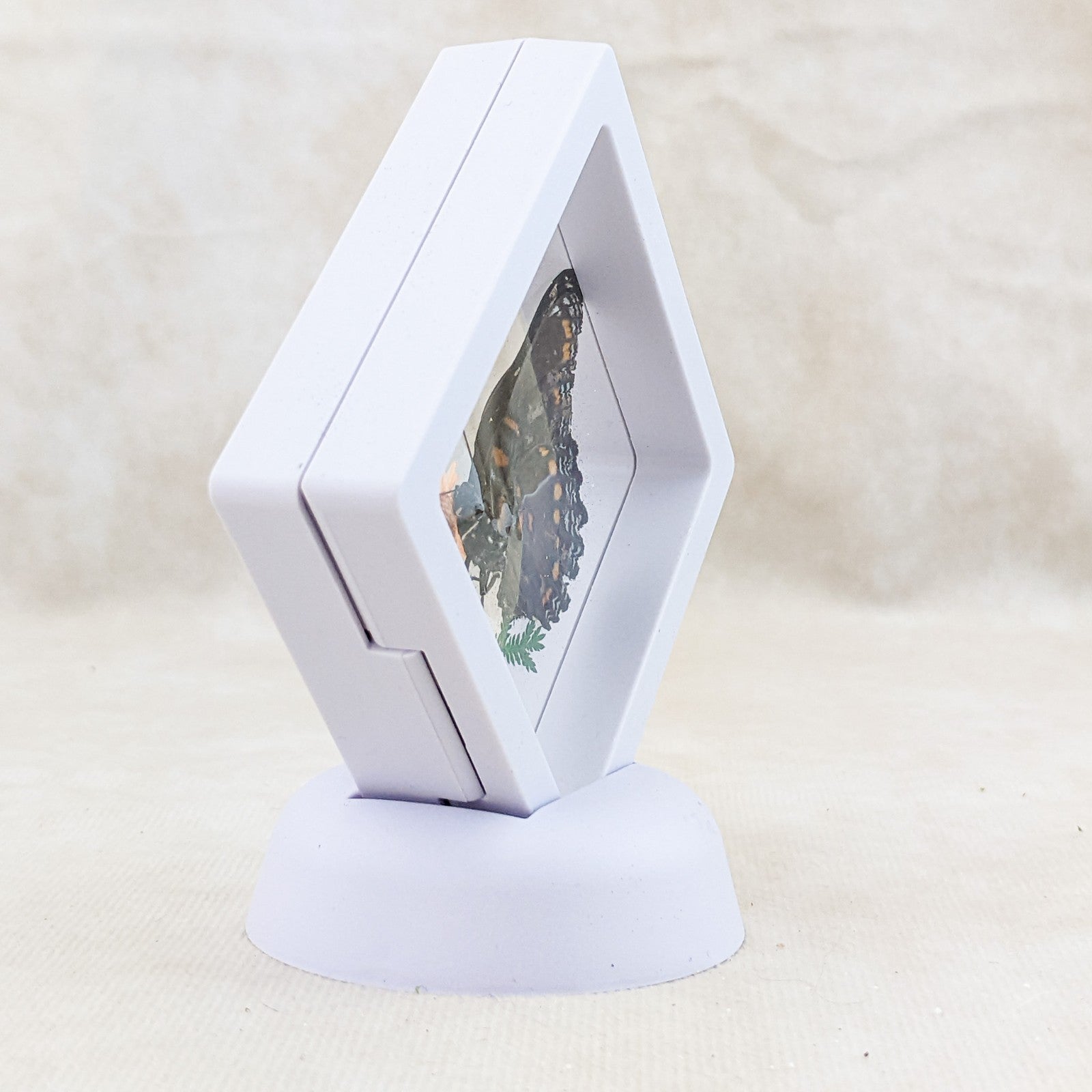 This is nicely showcased in a shadowbox type frame that suspends him in a clear elasticity film so both sides may be viewed unobstructed and also gives the specimen the illusion of "floating"! This can be opened but I advise against it as the specimens or the elasticity strip usually are damaged when you open the display. If the film in your display starts to stick together or gets some bubbles in it you can open the case very slowly so the film releases from both side and close again very slowly and the problem should be resolved. If the film gets touched or is in a hot area this can happen but it is a very easy fix also sometimes in shipping the specimen can shift a little in the display. If this happens please contact us and we will direct you on a quick and easy fix. Once the display has been opened returns are no longer accepted.