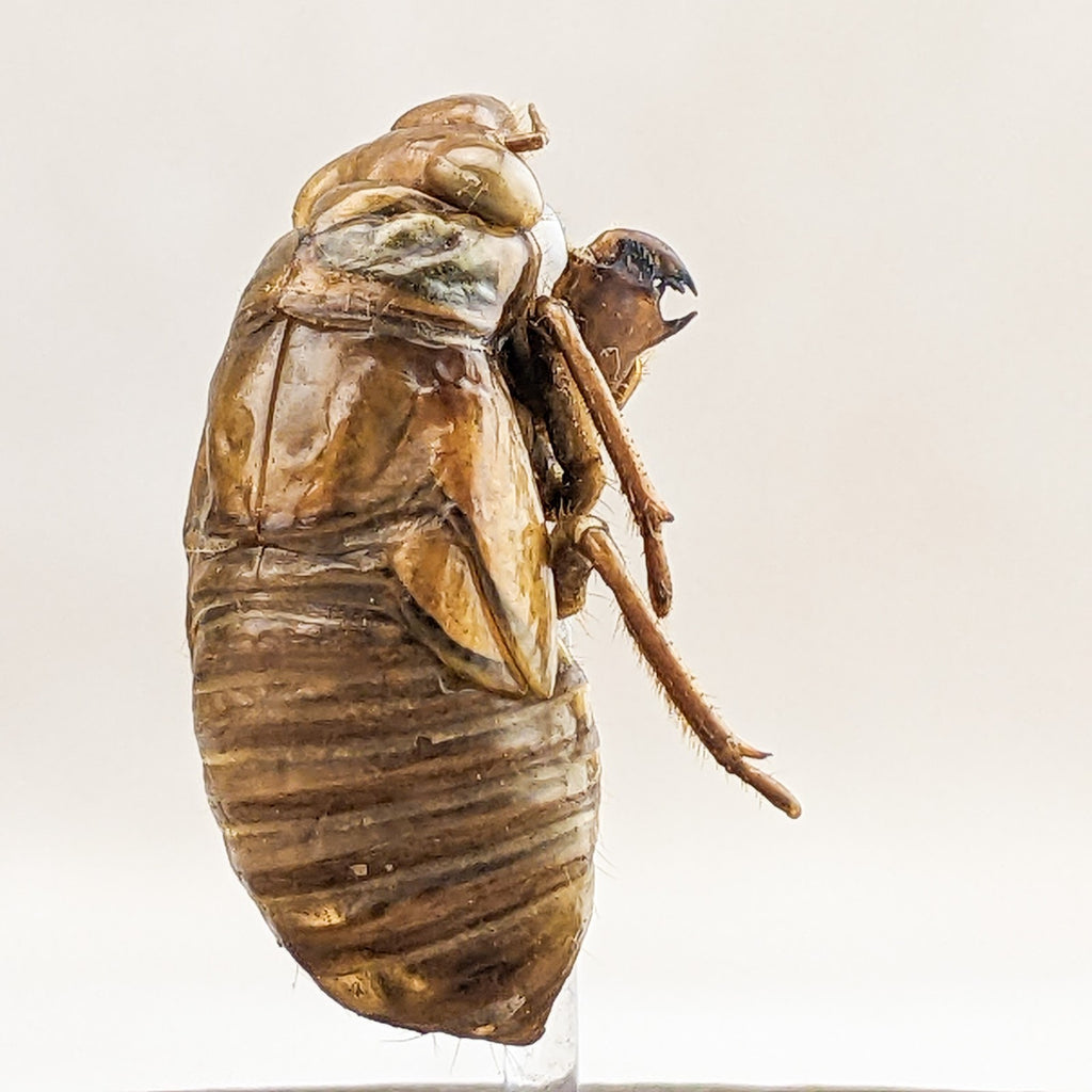 When the eggs hatch, the newly hatched nymphs drop to the ground and burrow. Cicadas live underground as nymphs for most of their lives at depths down to about 2.5 metres (8 ft). Nymphs have strong front legs for digging and excavating chambers in close proximity to roots where they feed on xylem sap. In the process, their bodies and interior of the burrow become coated in anal fluids. In wet habitats, larger species construct mud towers above ground in order to aerate their burrows. In the final nymphal instar, they construct an exit tunnel to the surface and emerge.They then moult (shed their skins) on a nearby plant for the last time, and emerge as adults. The exuviae or abandoned exoskeletons remain, still clinging to the bark of the tree.