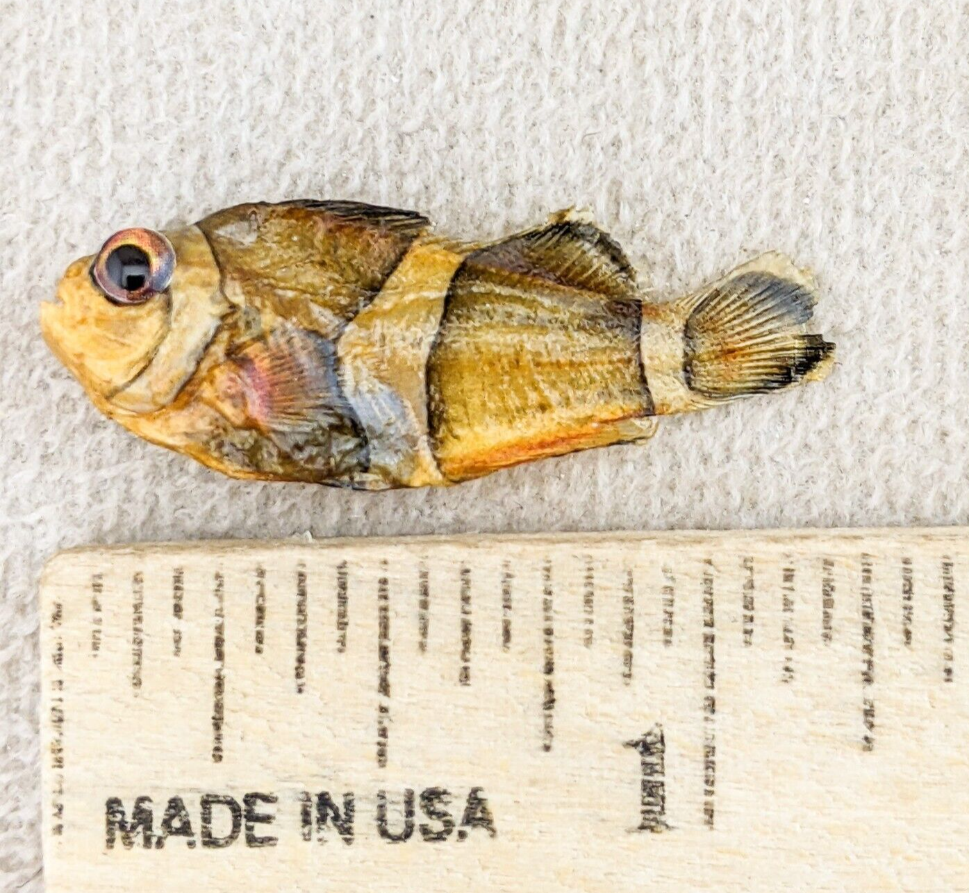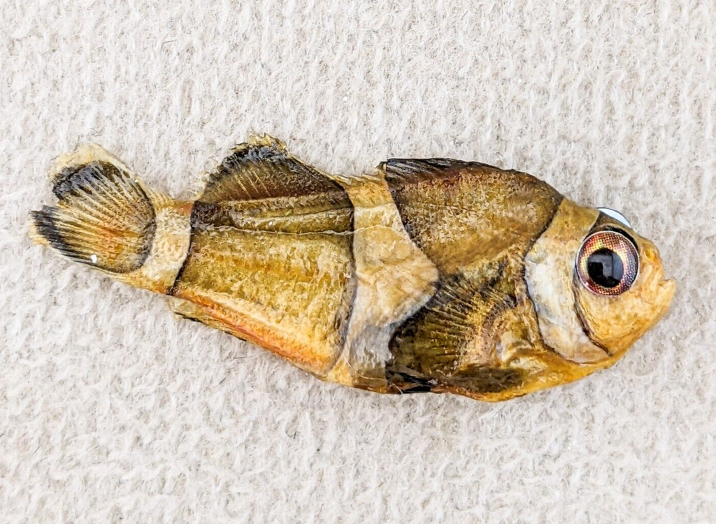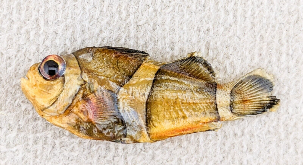 We are offering some aquarium fish that did not make it. They have been dried, preserved and covered with a sealer. Some will have a slight bit of a fishy smell that should dissapate over time. Please make sure you study pictures carefully as the pictures will show the one you are receiving. Each one of these will have the size and species listed.