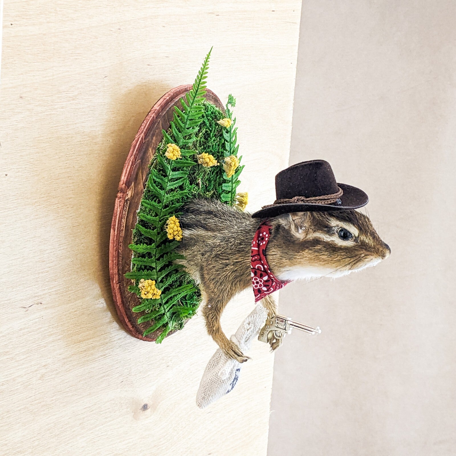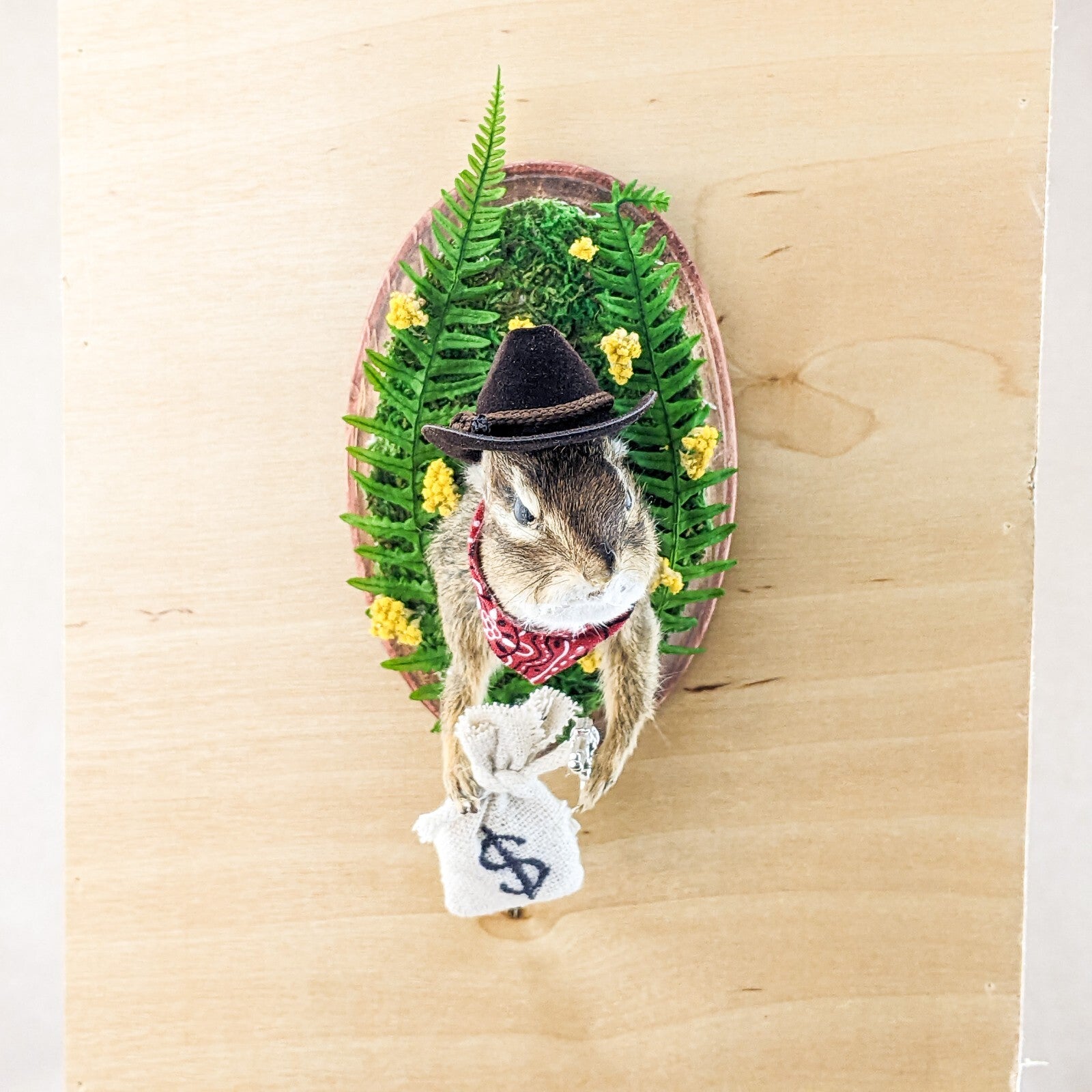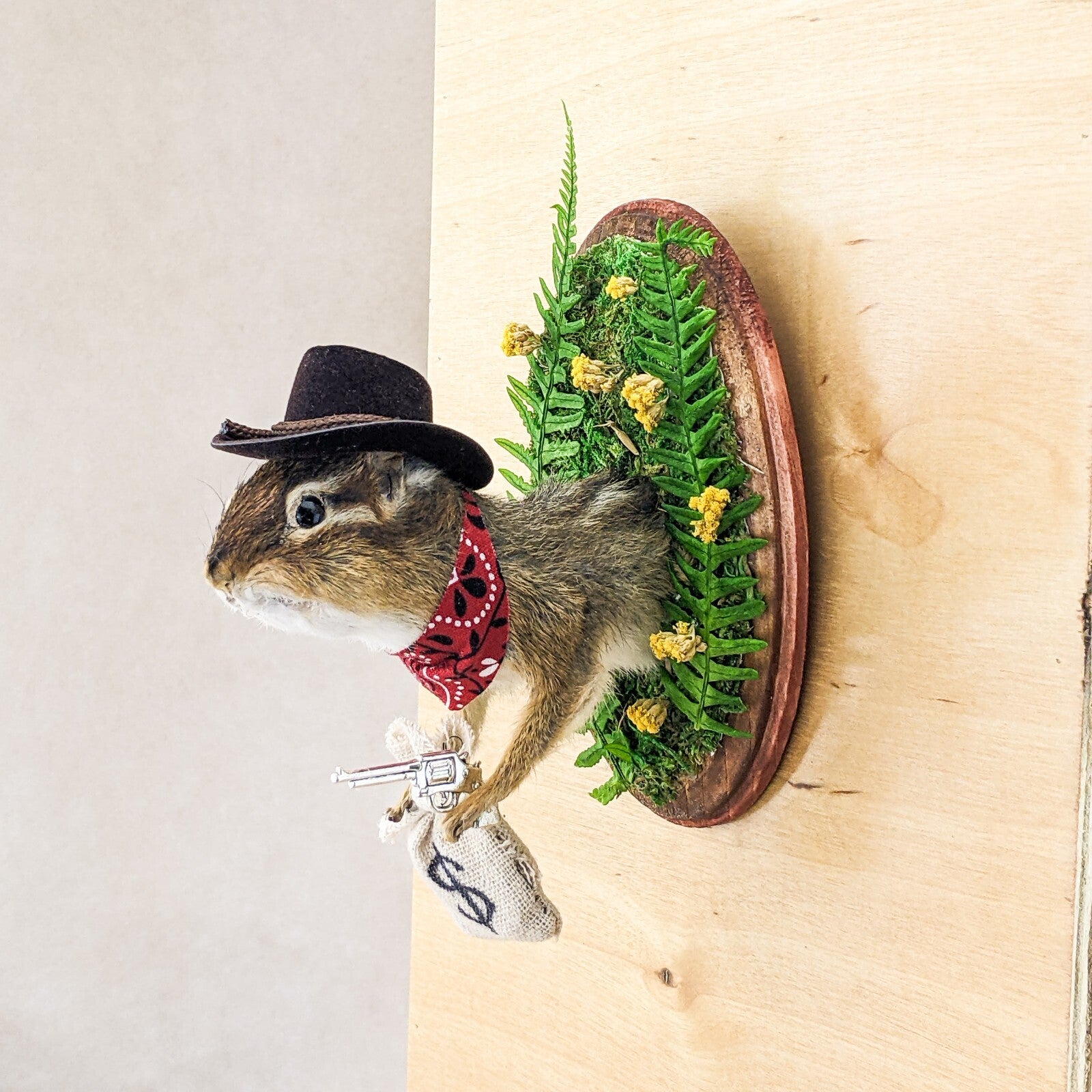 Add some western charm to your home with this unique taxidermy piece - a cowboy ground squirrel! This one-of-a-kind creation features the top half of a chipmunk dressed in classic cowboy attire, complete with a red bandana, black cowboy hat, silver gun, a bag full of "cash" and is surrounded by real preserved fern and florals. Perfect for adding a touch of whimsy to your decor, this cowboy ground squirrel is sure to be a conversation starter. Easily mountable with a wall hook attached to its wooden base, this piece is a must-have for any animal lover or quirky collector. Make a statement in your home with this cowboy chipmunk today! This piece measures approx. 5 1/2 x 5 x 3 1/2"