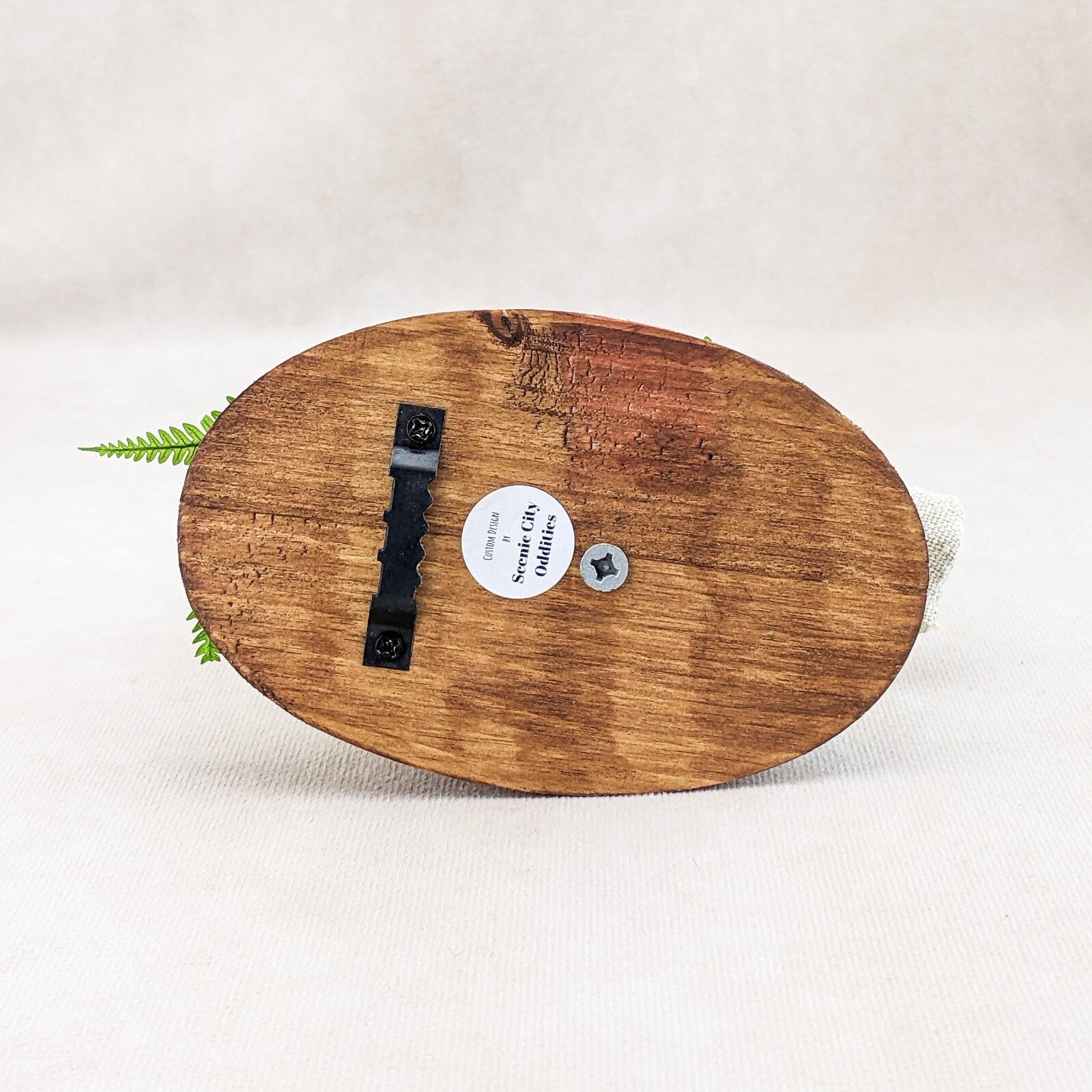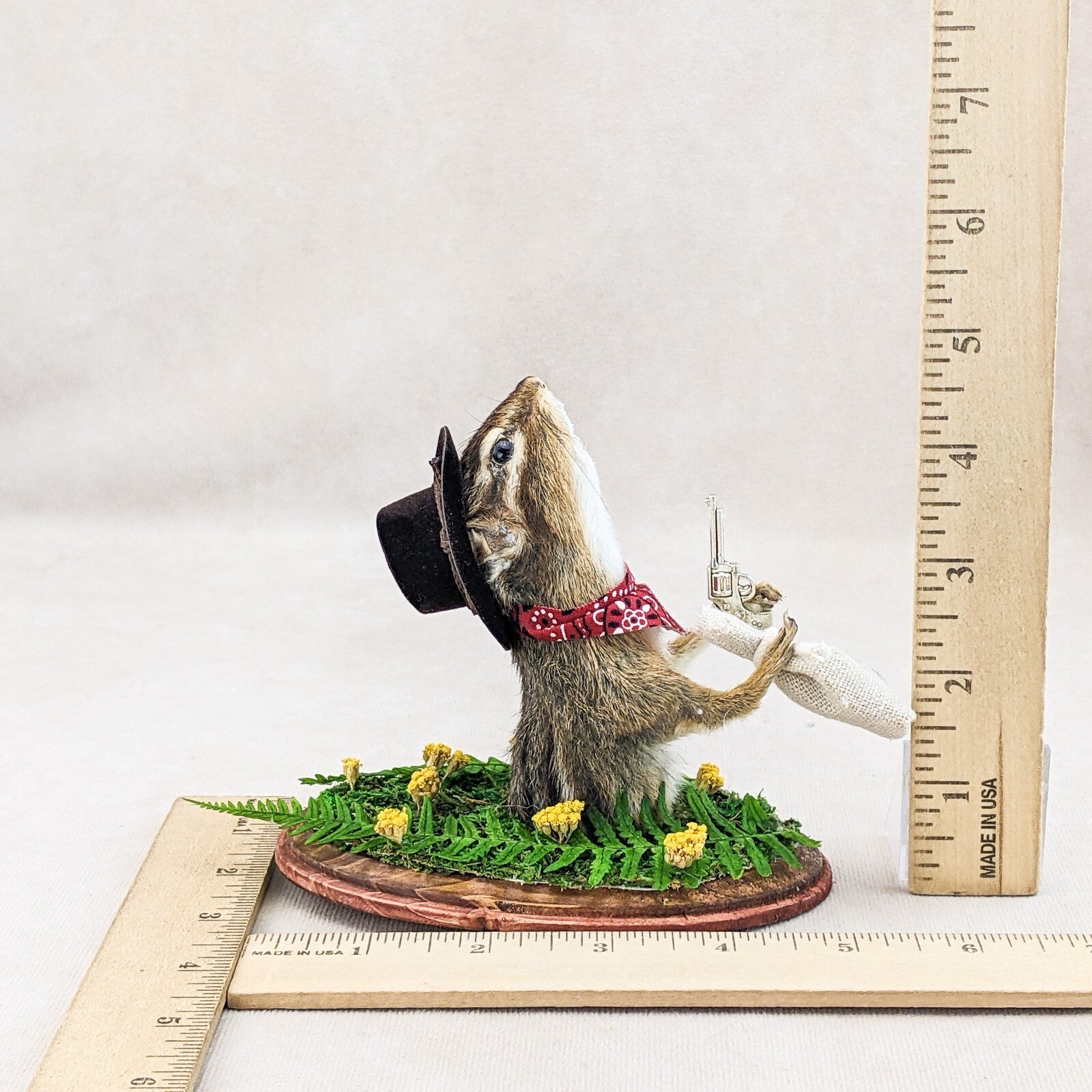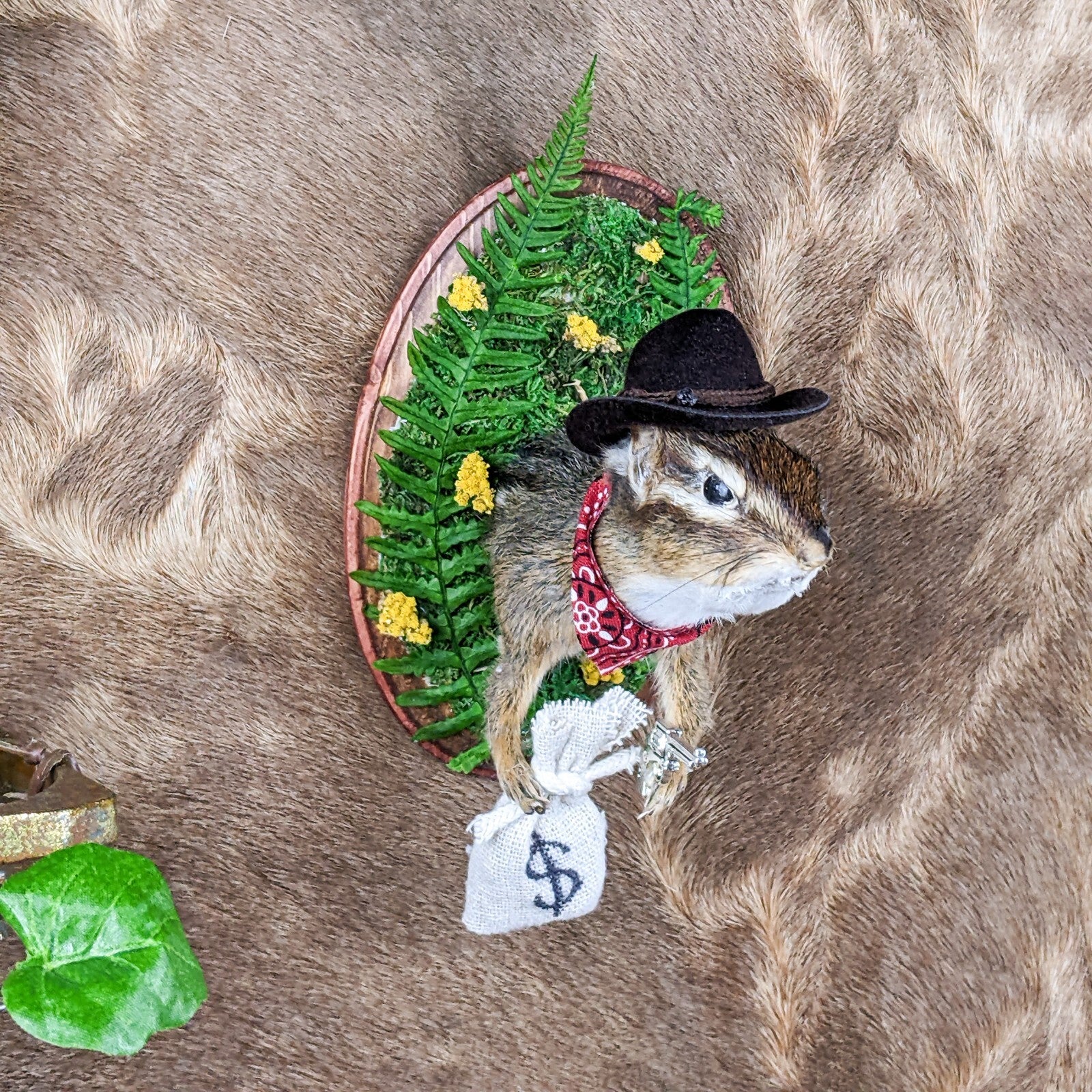 Add some western charm to your home with this unique taxidermy piece - a cowboy ground squirrel! This one-of-a-kind creation features the top half of a chipmunk dressed in classic cowboy attire, complete with a red bandana, black cowboy hat, silver gun, a bag full of "cash" and is surrounded by real preserved fern and florals. Perfect for adding a touch of whimsy to your decor, this cowboy ground squirrel is sure to be a conversation starter. Easily mountable with a wall hook attached to its wooden base, this piece is a must-have for any animal lover or quirky collector. Make a statement in your home with this cowboy chipmunk today! This piece measures approx. 5 1/2 x 5 x 3 1/2"