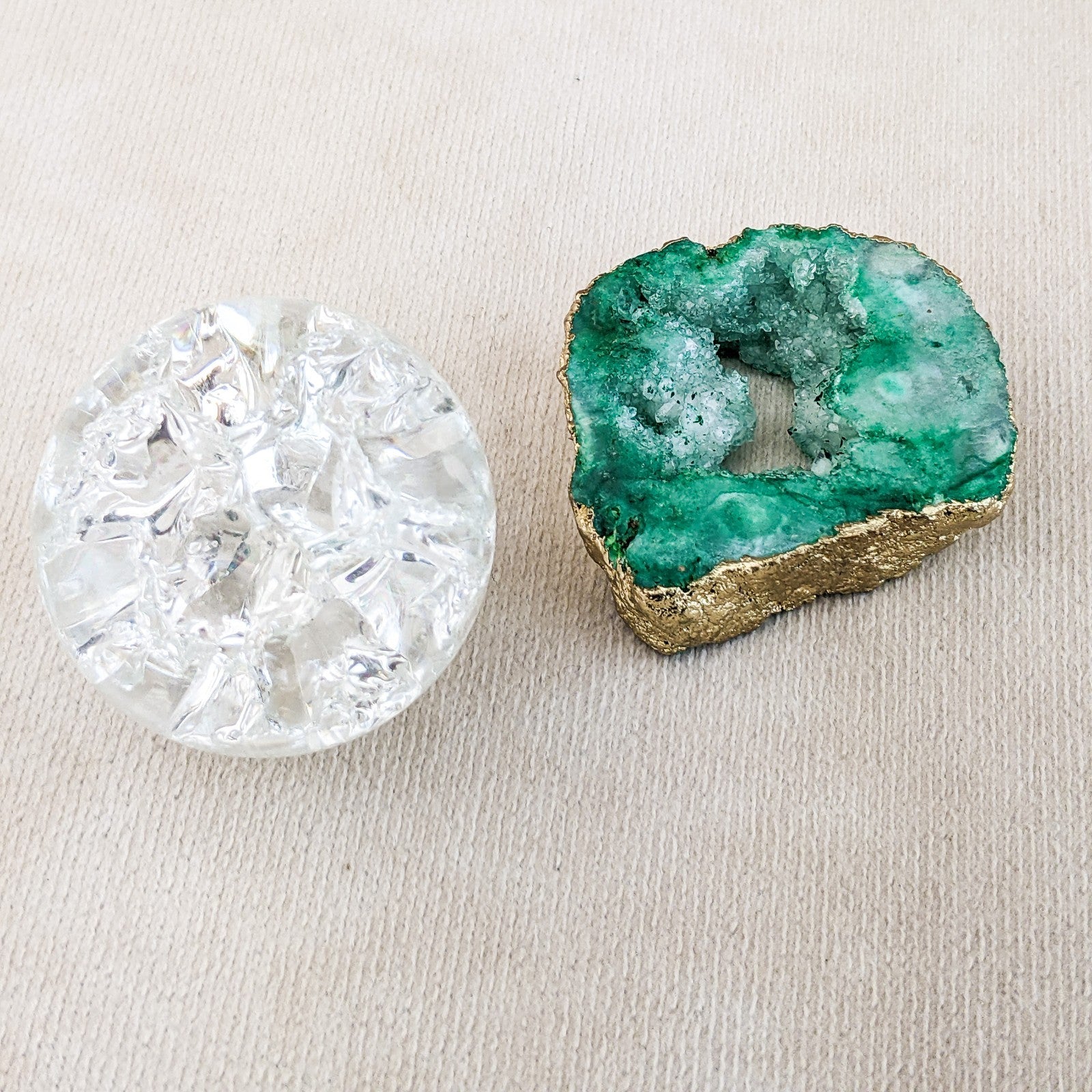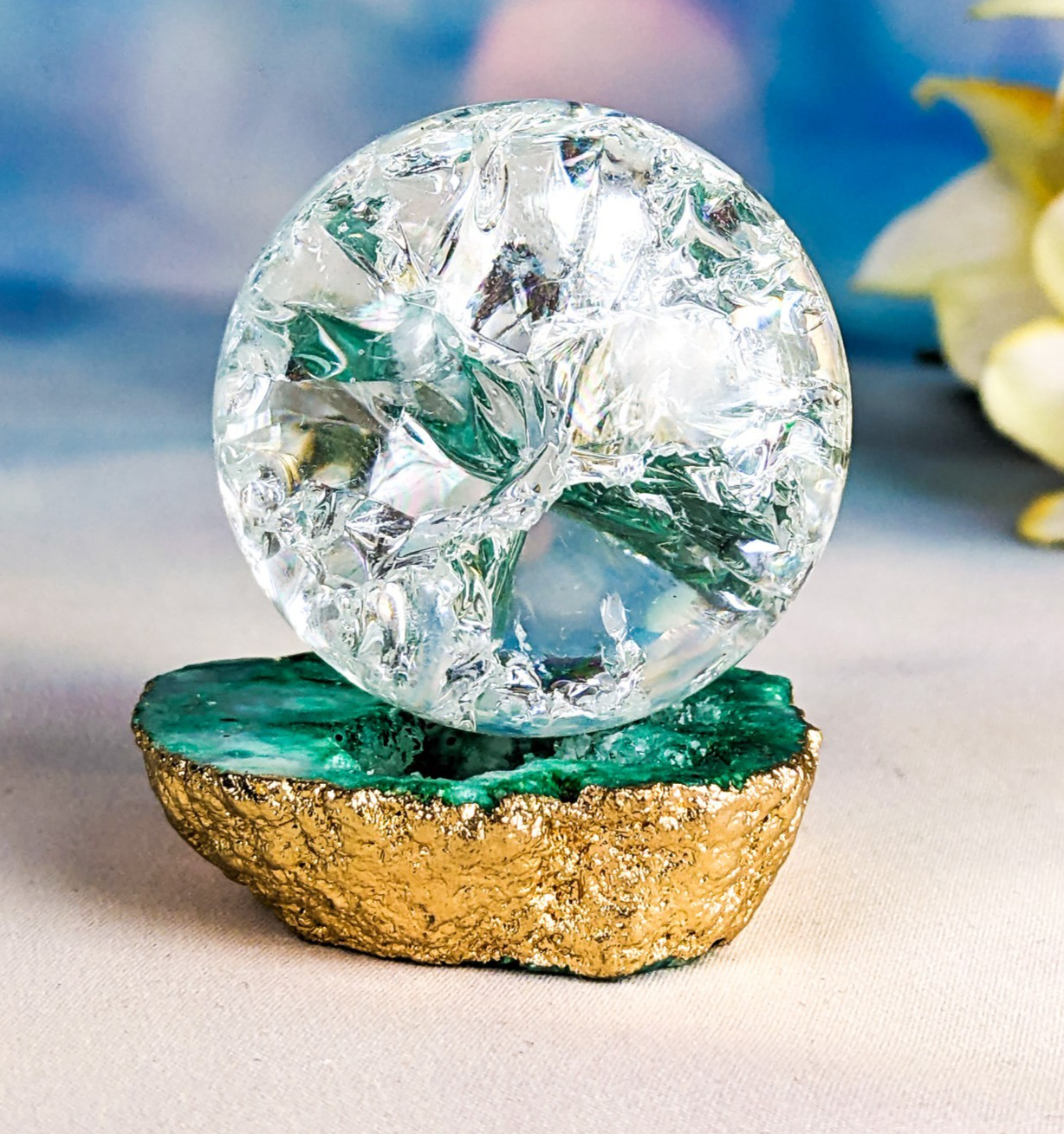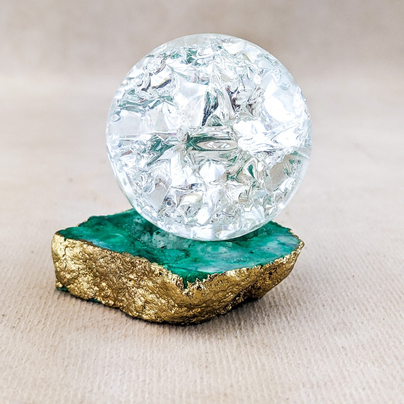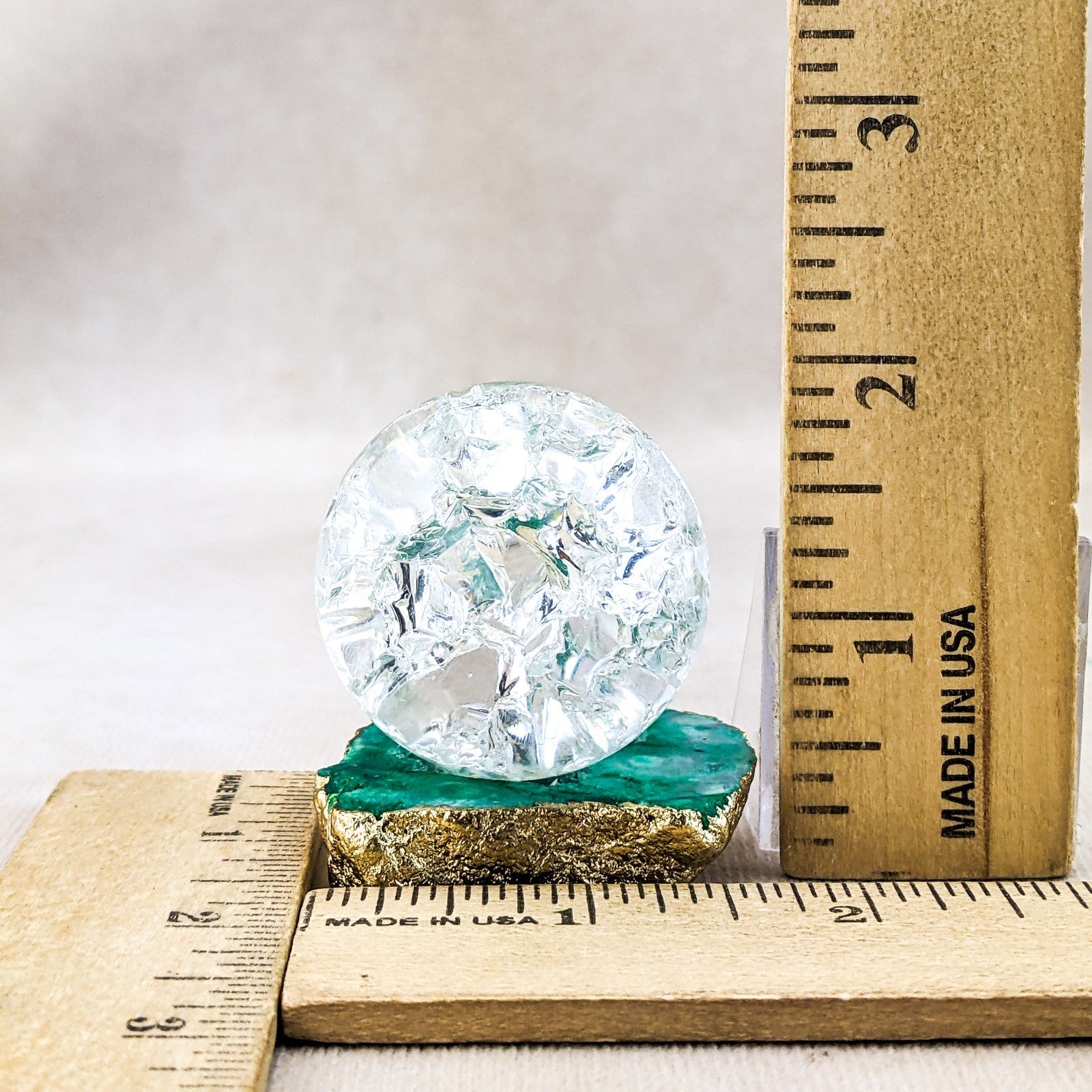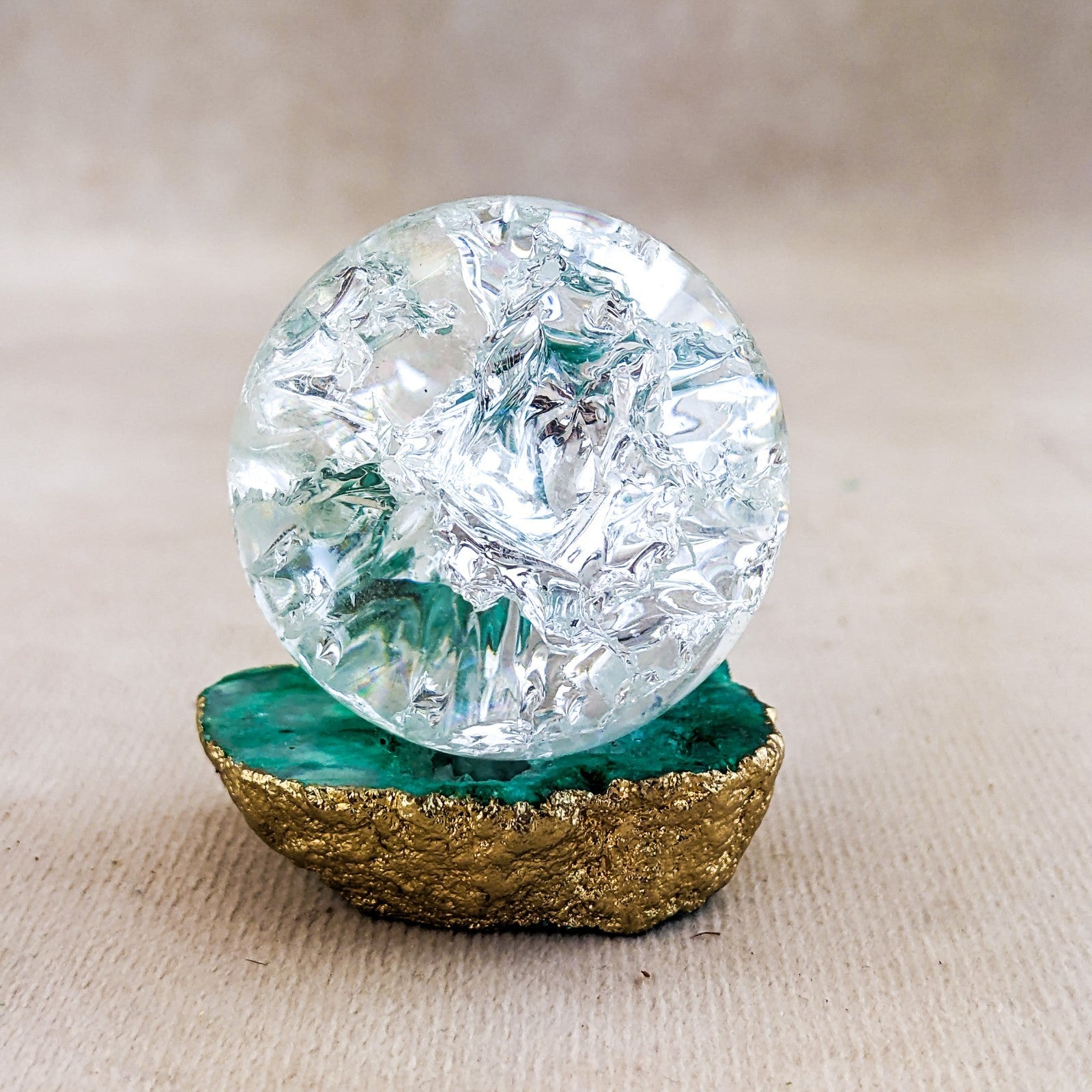 j47o #4 This is a beautiful Crackle art crystal ball on a Quartz Crystal geode stone.  This crystal ball display is sure to make you smile!  Stone base is approx. 1 3/4 x 3/8 at widest points.  There is a metal silver ring attached to the stone to hold the Crystal ball in place and the Crystal ball is approx. 1 1/2" in diameter.  Total Height is approx 1 3/4".   The Crystal ball is removable from the stone.   THIS WOULD BE GREAT SIZE FOR AN 18" DOLL.