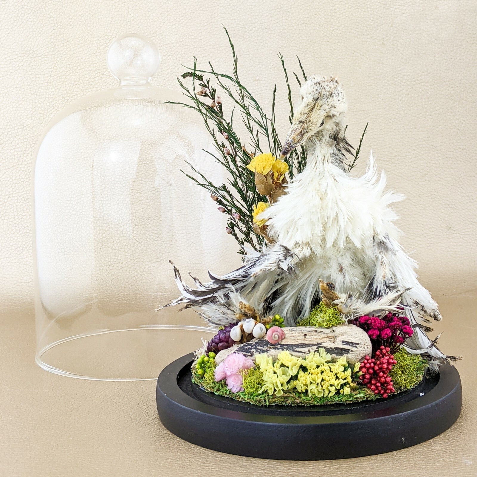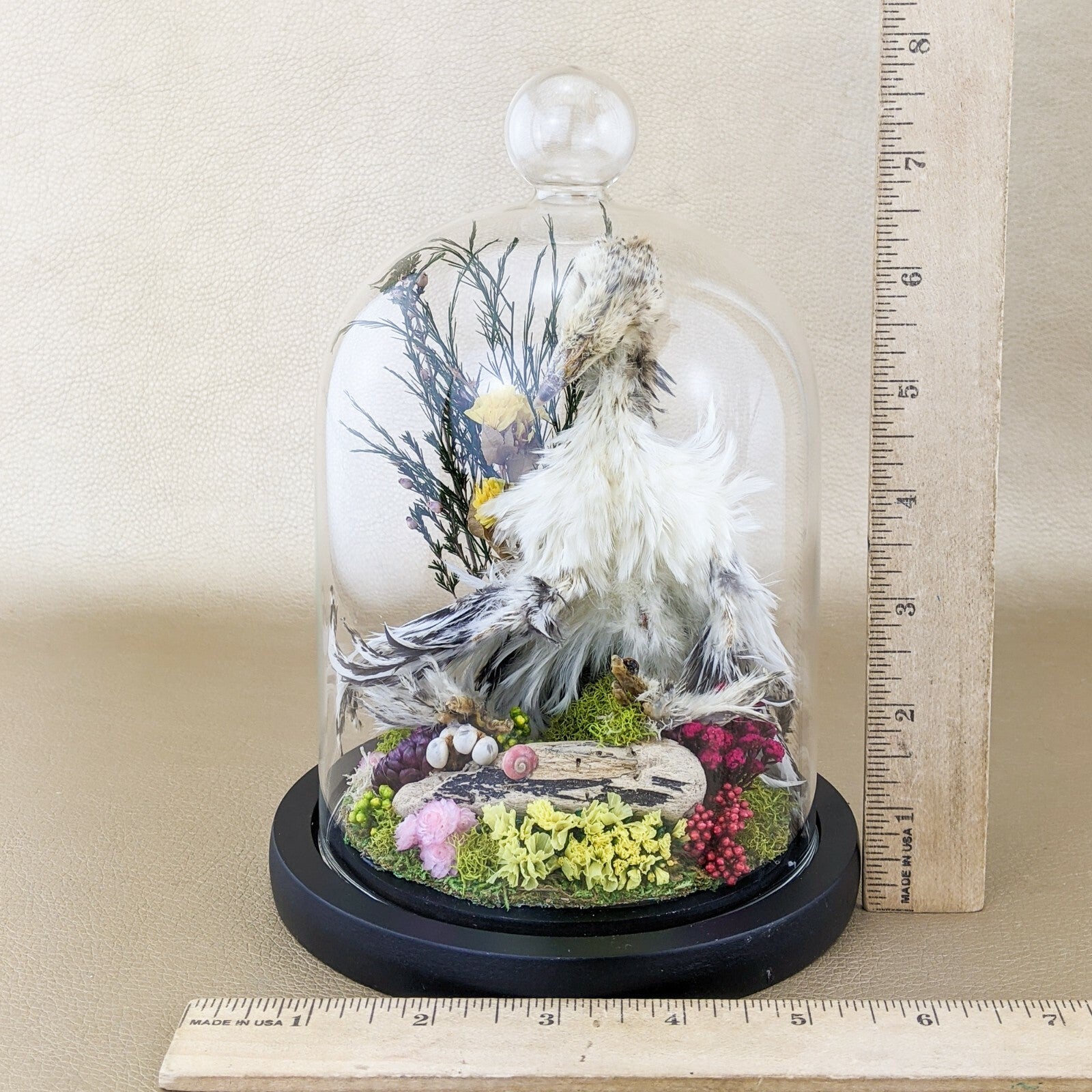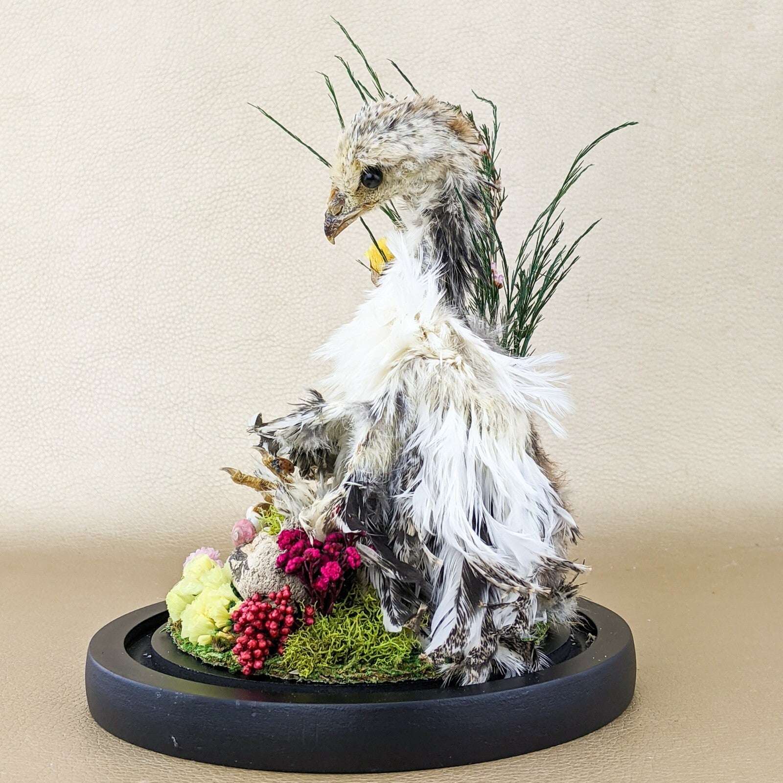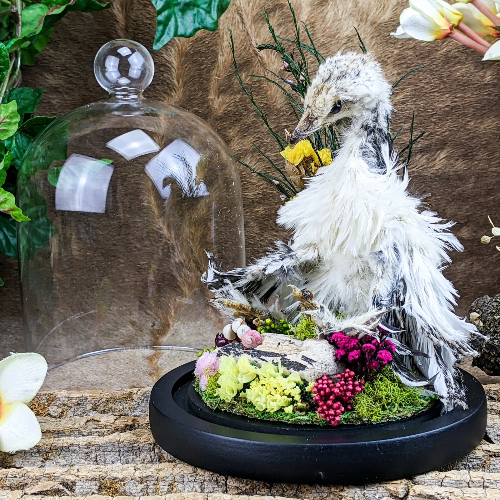 d49b #1.2      This is a taxidermy Frizzle Baby chick chicken beautifully displayed in a glass dome display.  The little guy seems to be checking out the lady bug on his foot!   It is surrounded by preserved flowers, fern, and other preserved elements including a real snail and lady bug.  It is approx. 8 x6" and is under a glass dome on a wood base.   As the pictures show the dome is removable.  Great addition to any collection and will stay safe and clean for years to come!