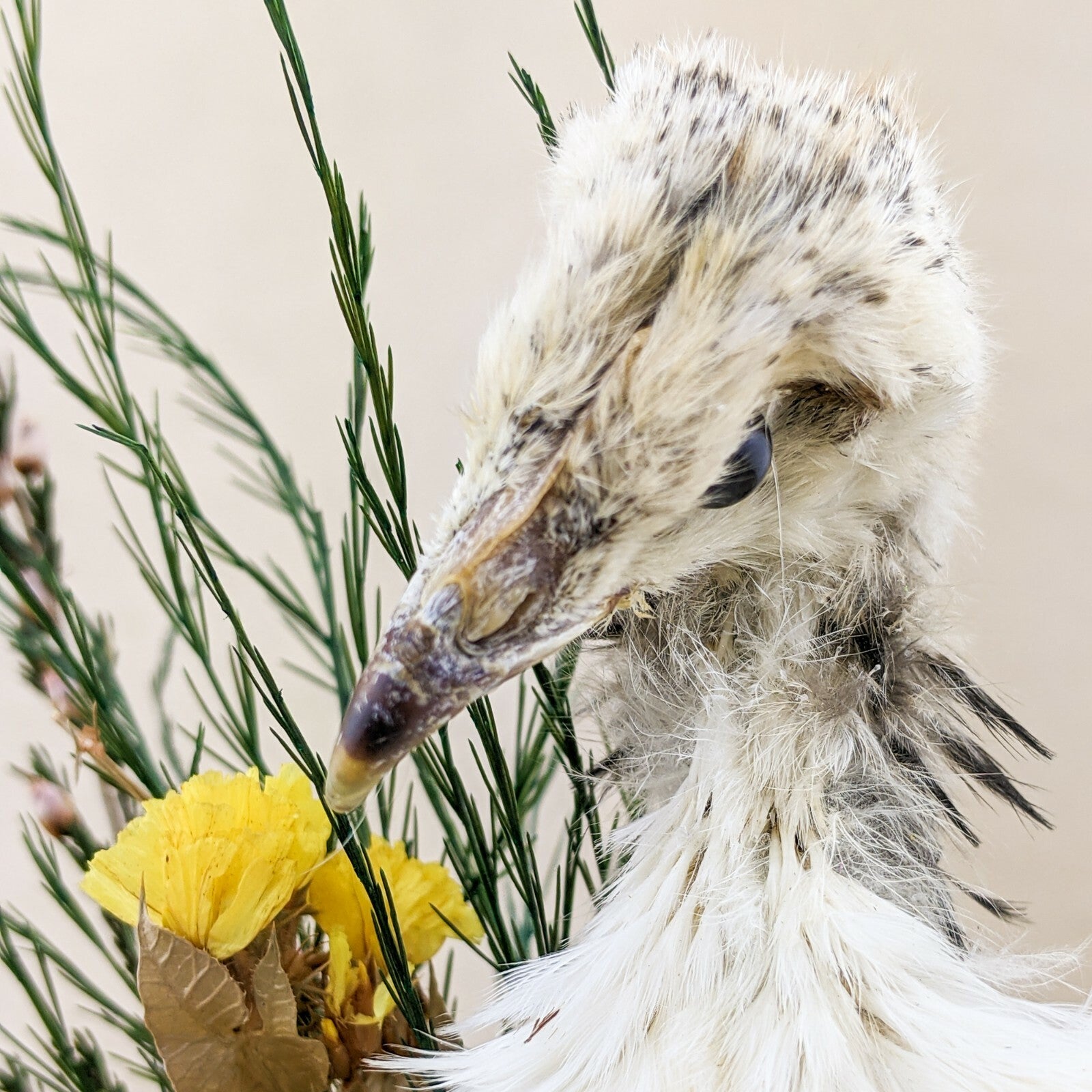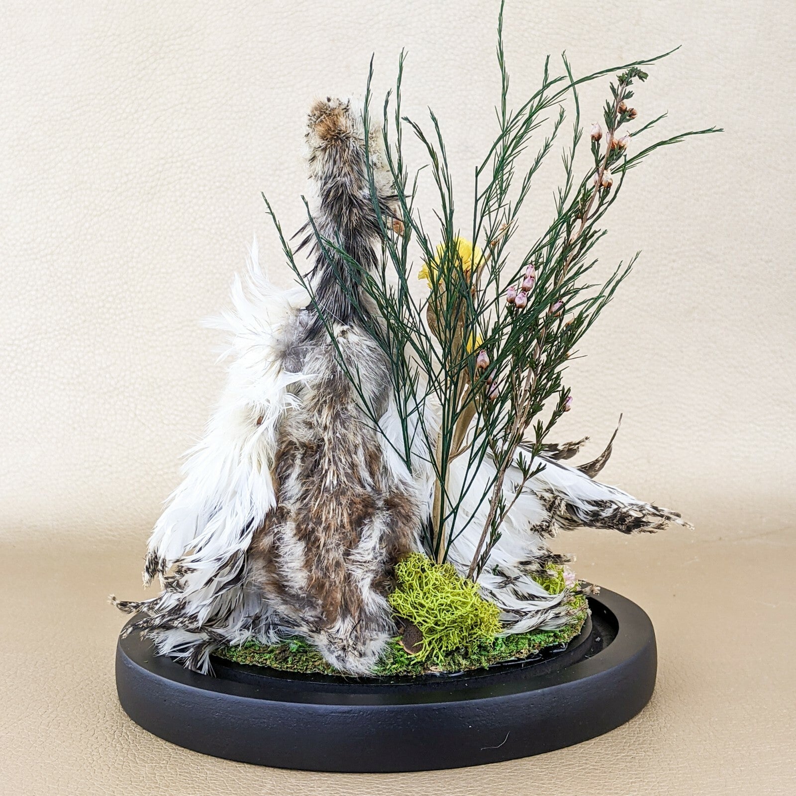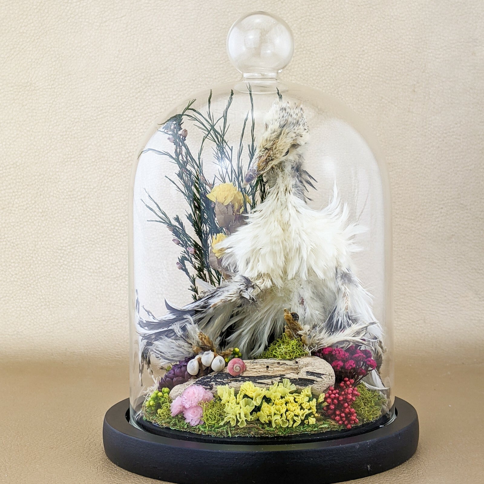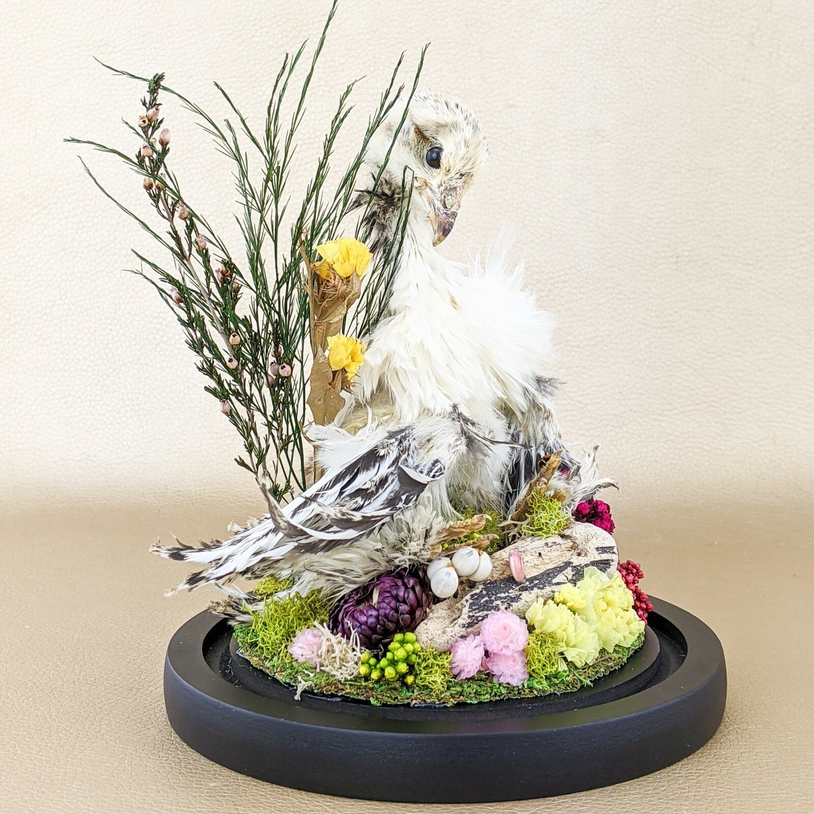 d49b #1.2      This is a taxidermy Frizzle Baby chick chicken beautifully displayed in a glass dome display.  The little guy seems to be checking out the lady bug on his foot!   It is surrounded by preserved flowers, fern, and other preserved elements including a real snail and lady bug.  It is approx. 8 x6" and is under a glass dome on a wood base.   As the pictures show the dome is removable.  Great addition to any collection and will stay safe and clean for years to come!