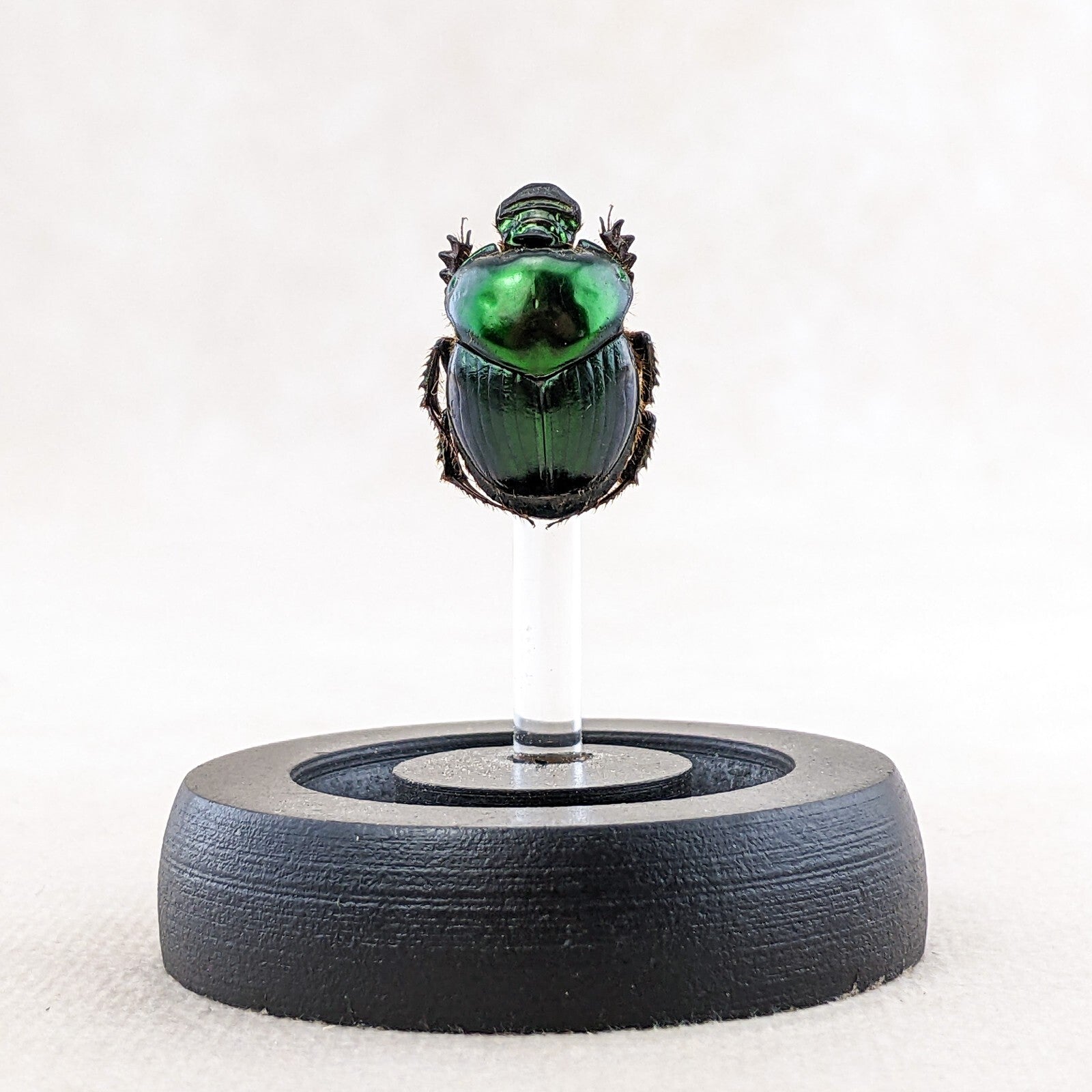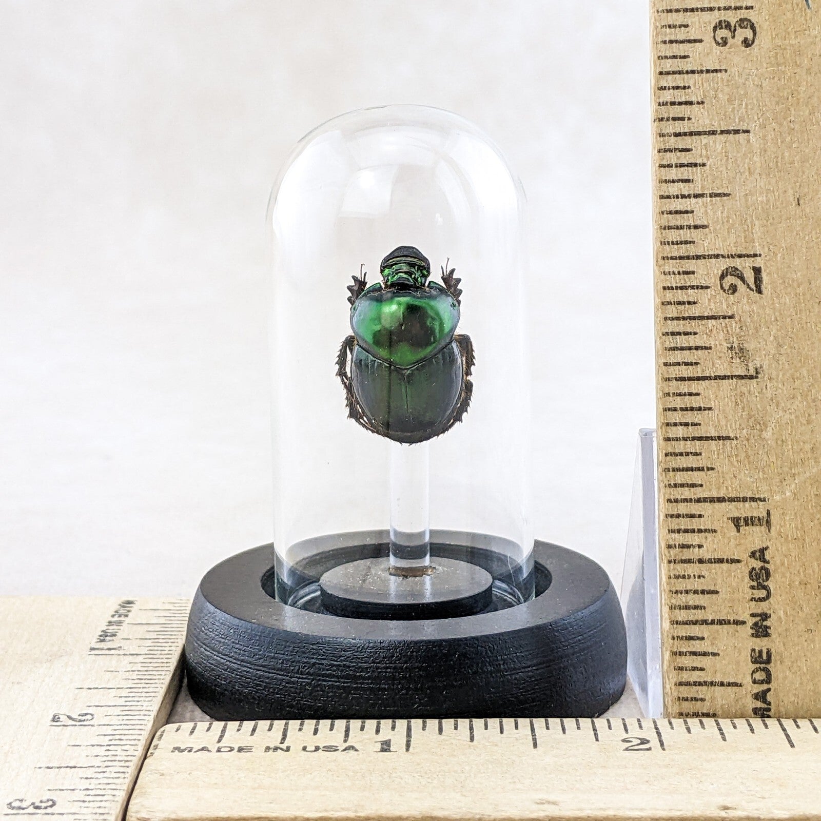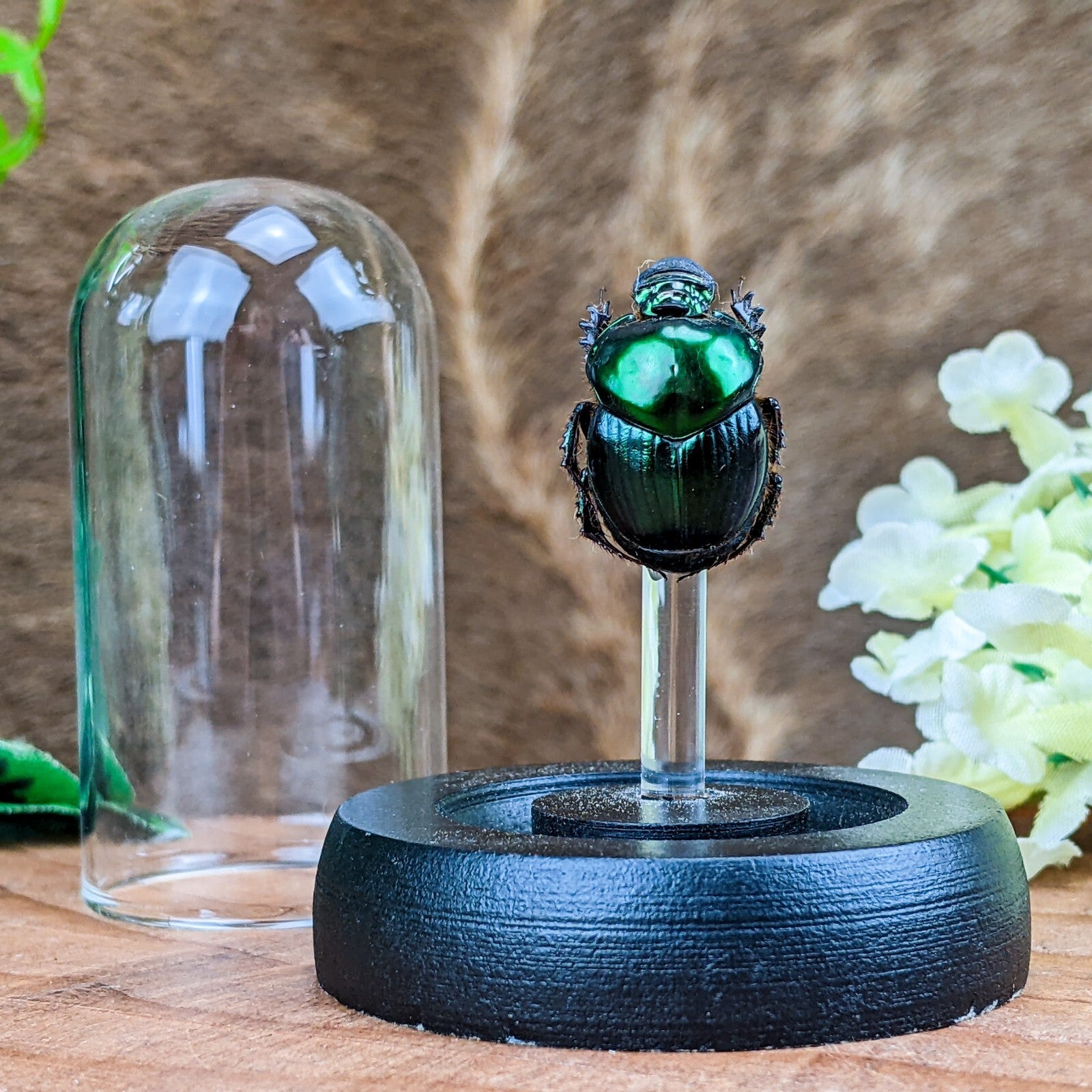 d55a #   This large Dung beetle  is a great starter for your collection!  Inexpensive and nice looking!  This little lady is displayed on an acrylic post under a glass dome with a wood base.  The display is approx. 2 5/8"  x 2"  and is also a great educational piece.