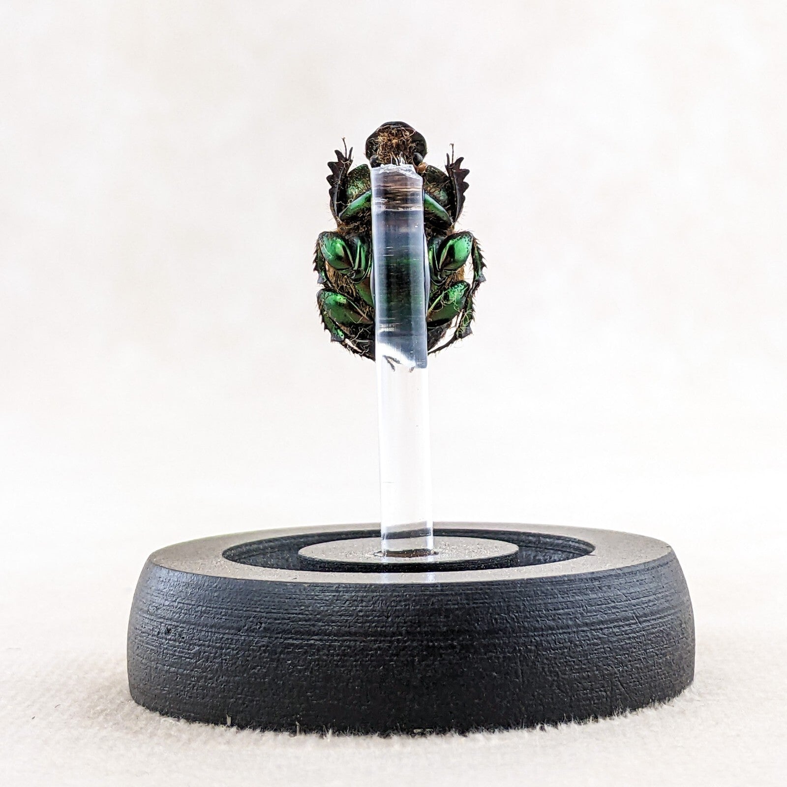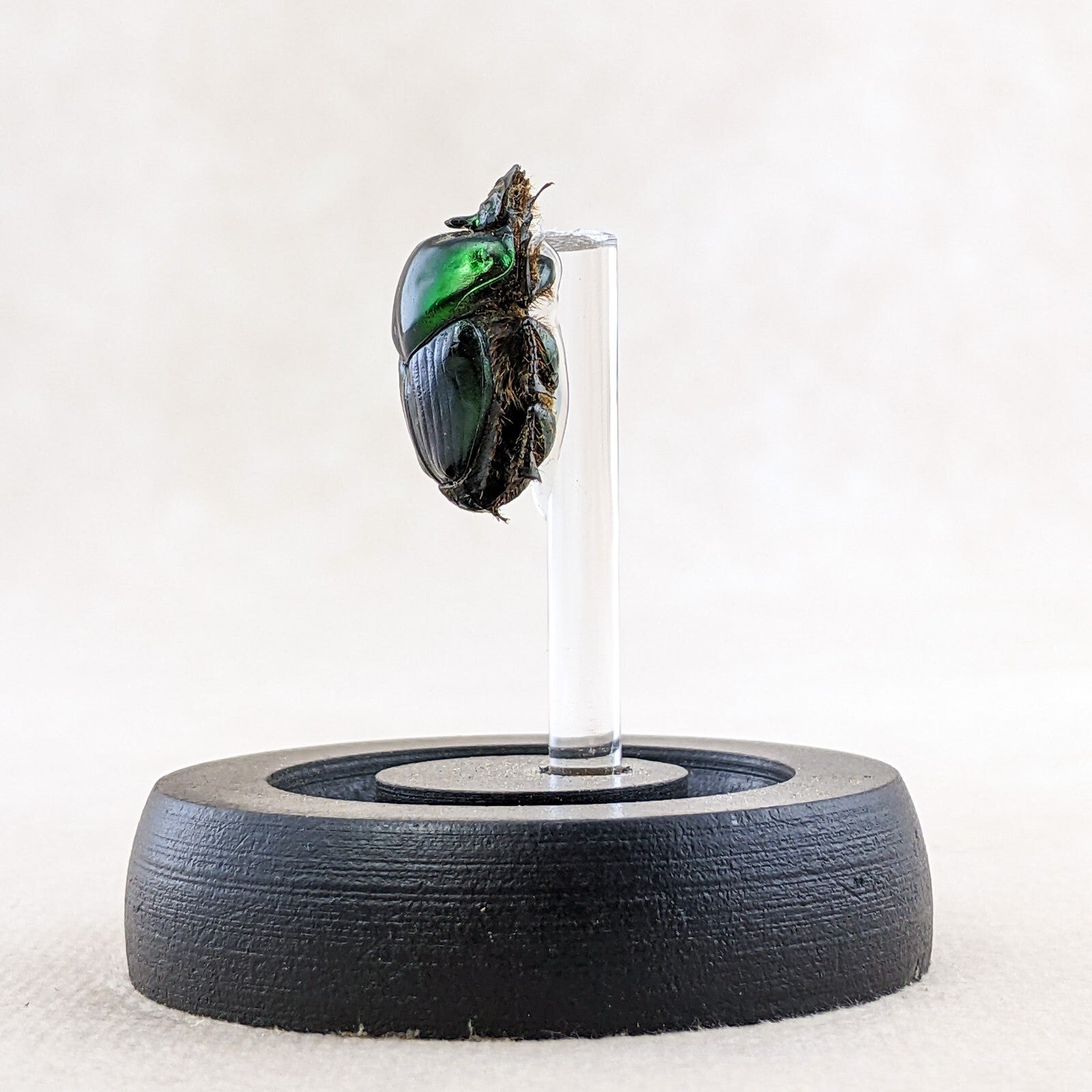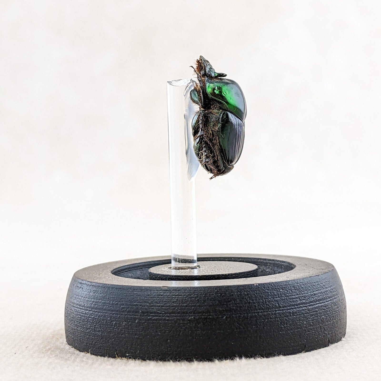 d55a #   This large Dung beetle  is a great starter for your collection!  Inexpensive and nice looking!  This little lady is displayed on an acrylic post under a glass dome with a wood base.  The display is approx. 2 5/8"  x 2"  and is also a great educational piece.