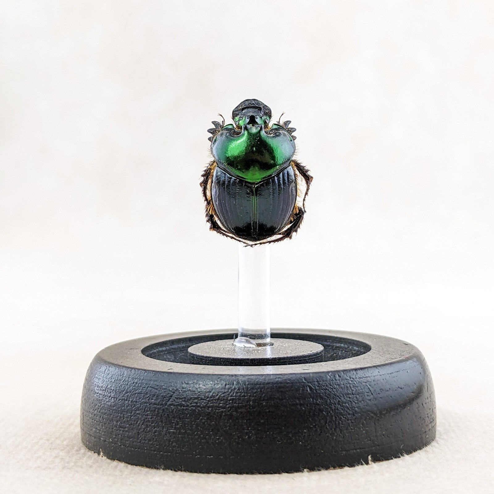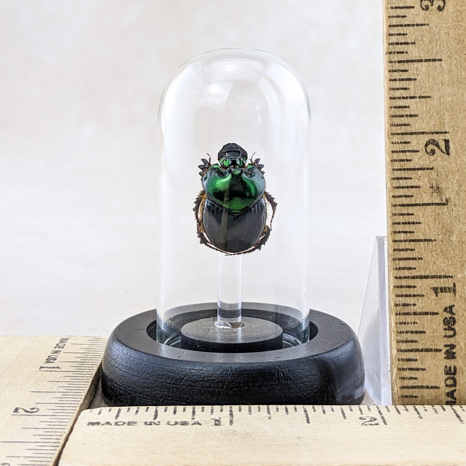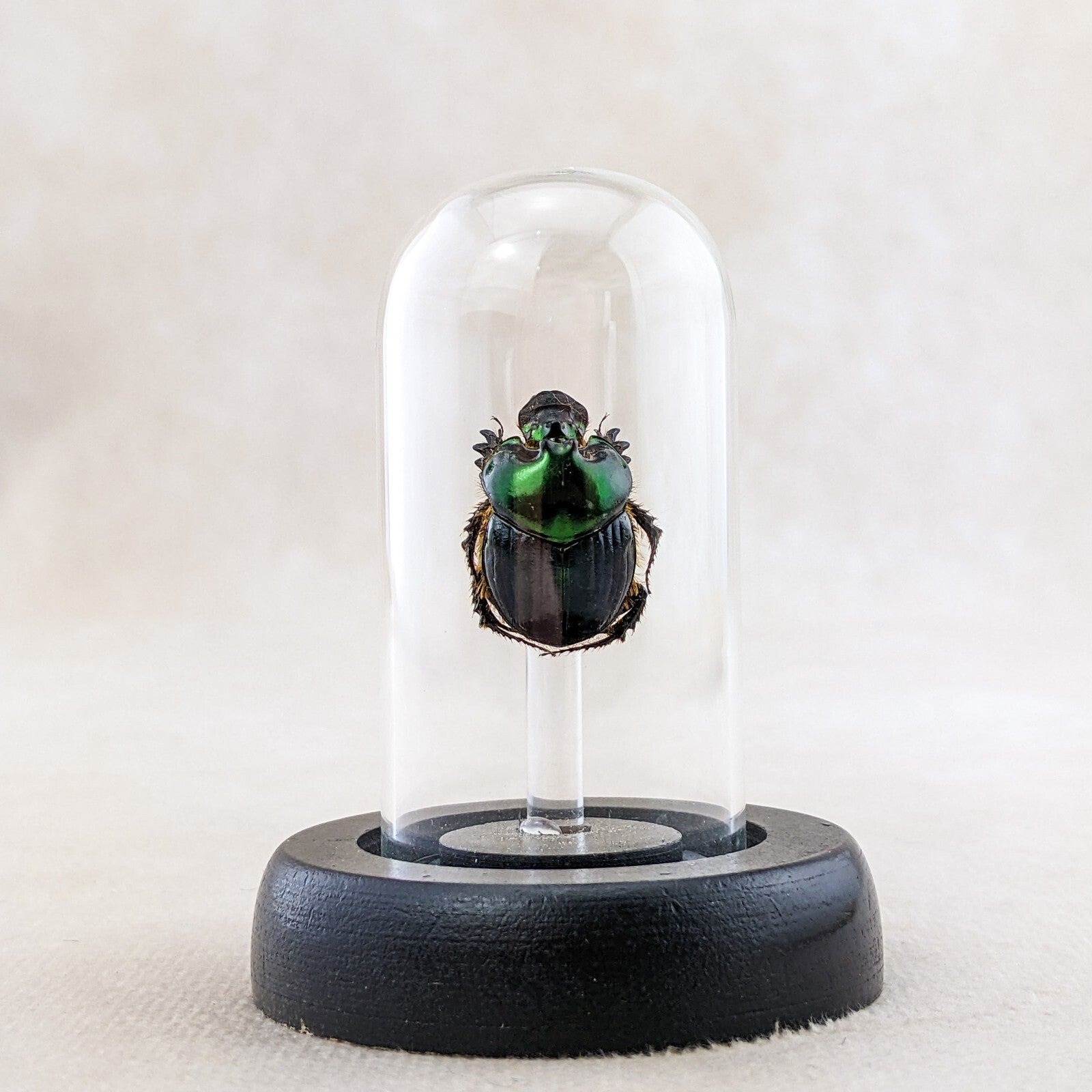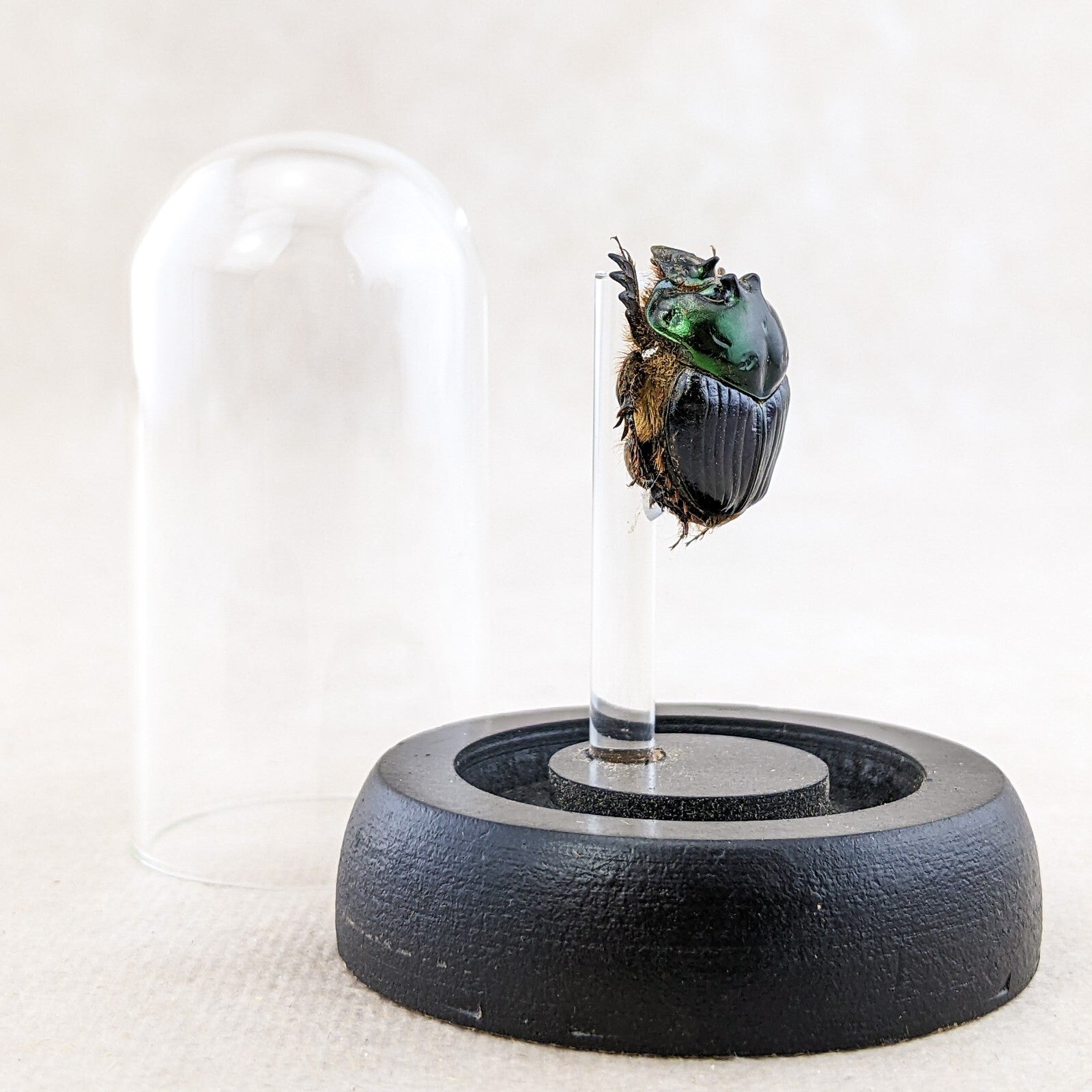 d55b #   This large Dung beetle  is a great starter for your collection!  Inexpensive and nice looking!  This little guy is displayed on an acrylic post under a glass dome with a wood base.  The display is approx. 2 5/8"  x 2"  and is also a great educational piece.