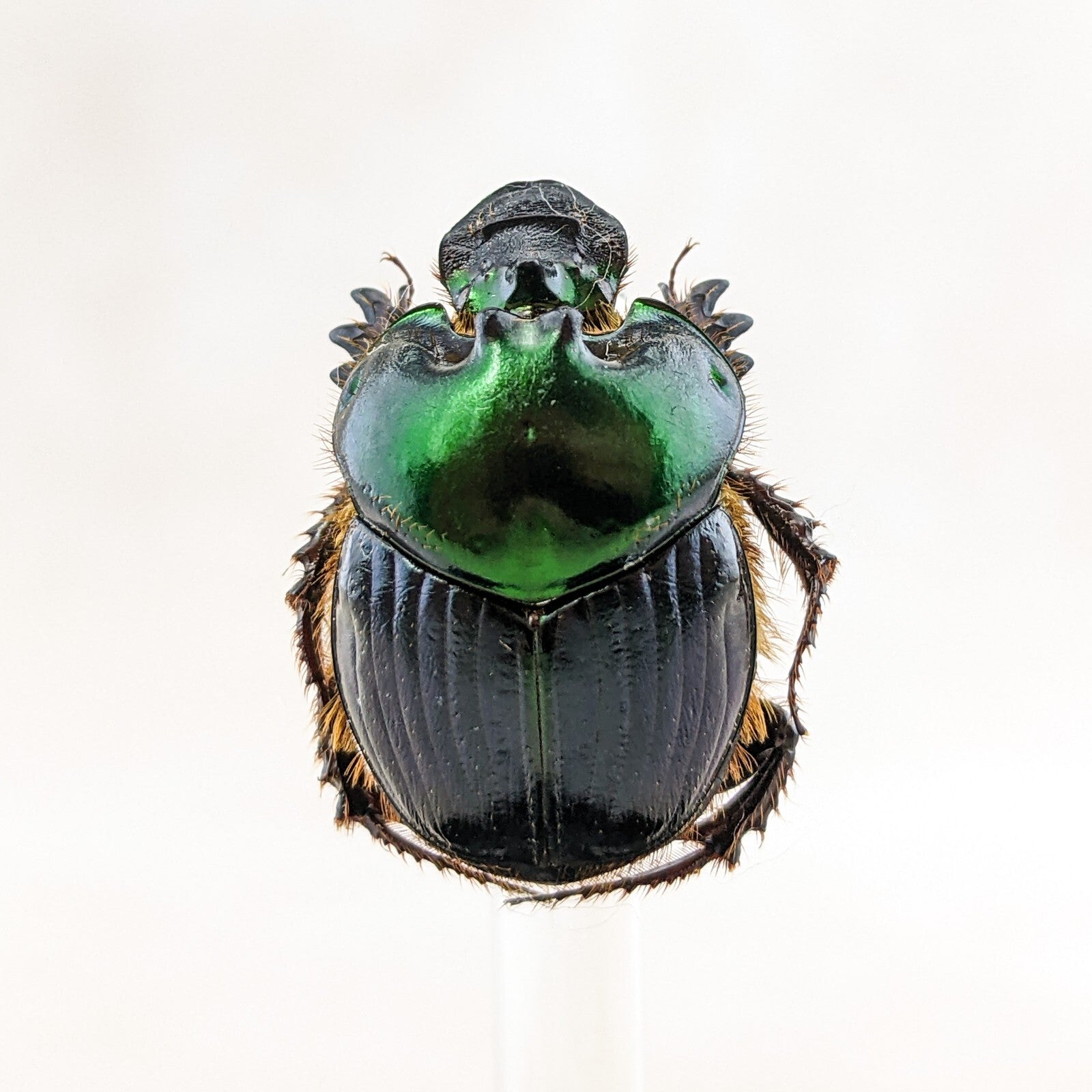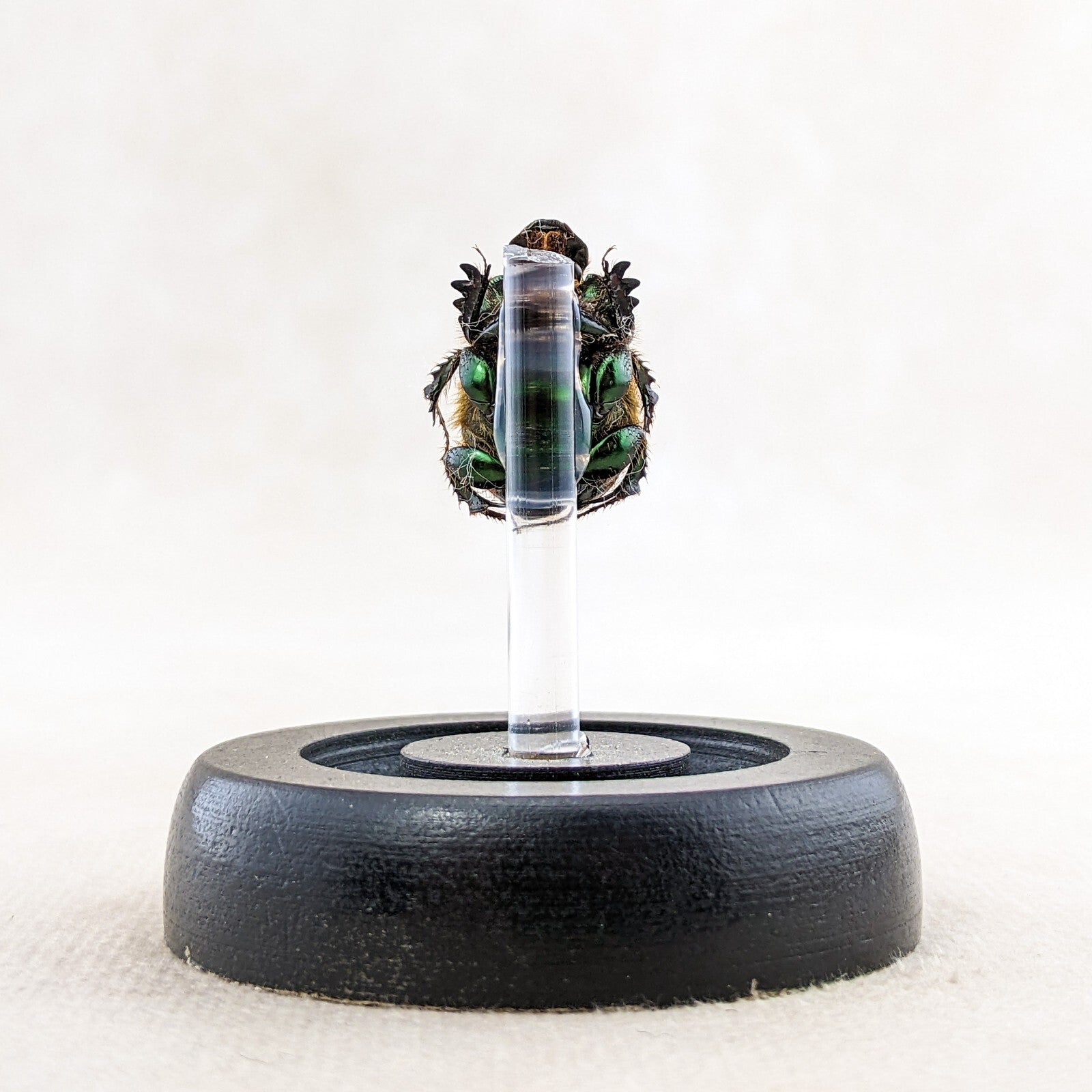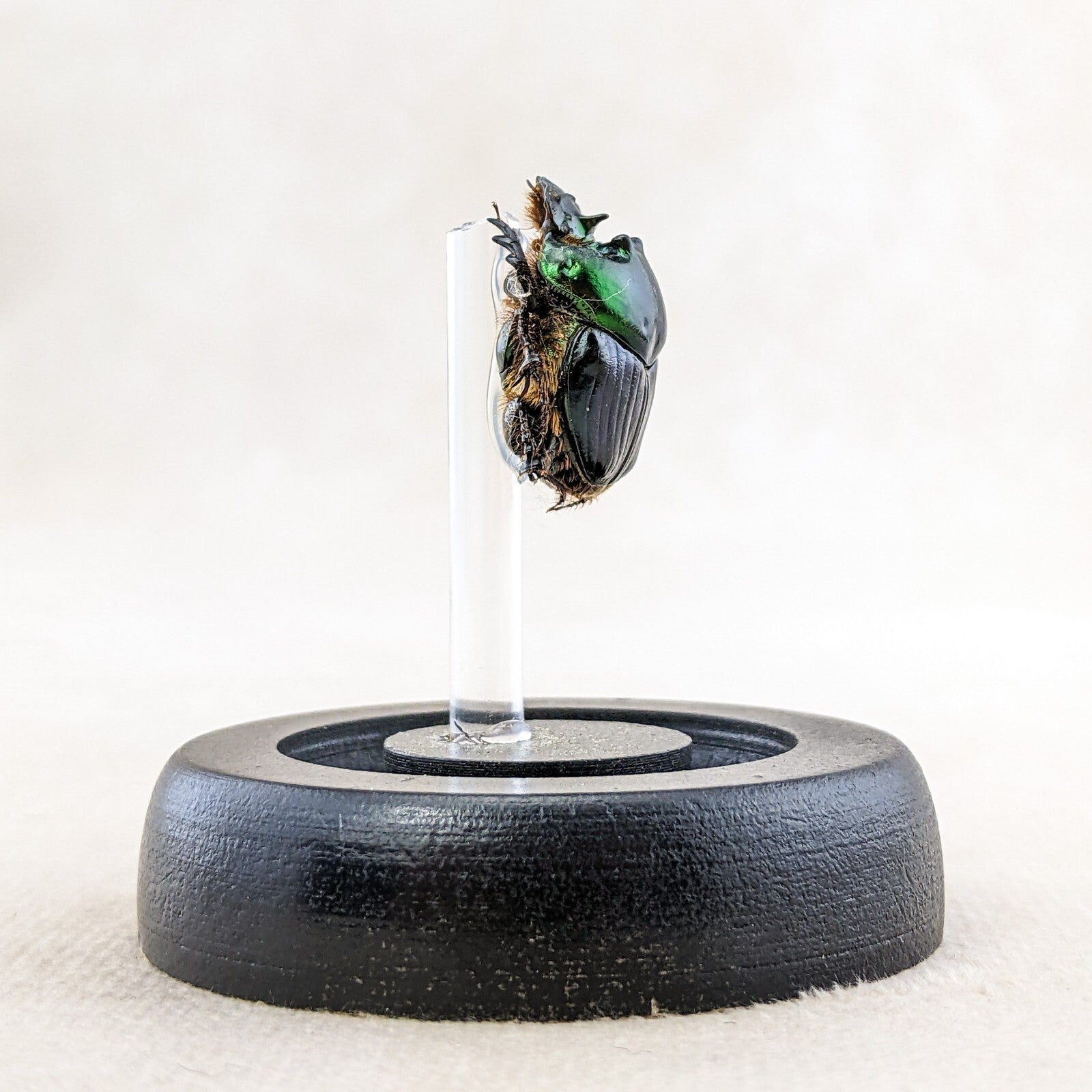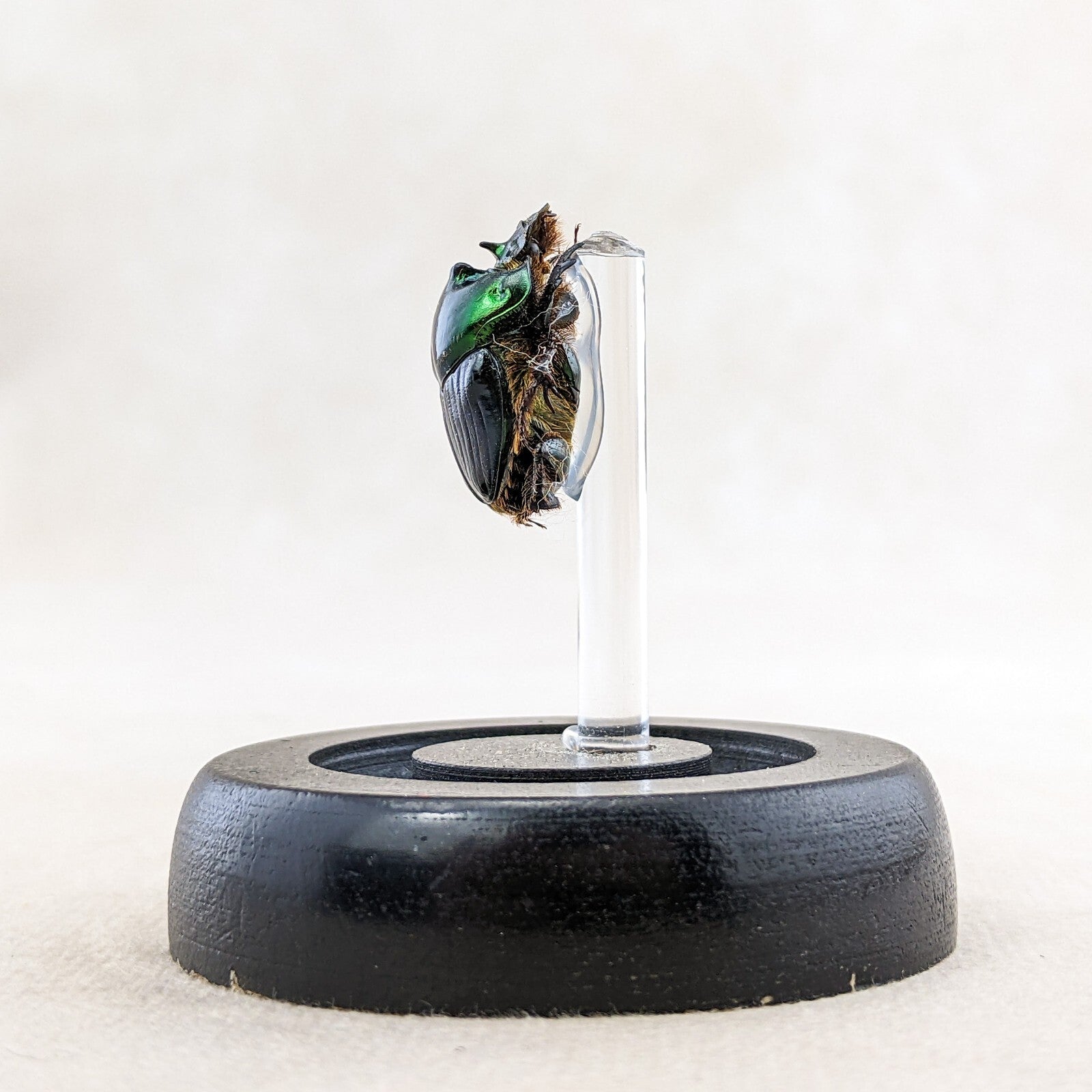 d55b #   This large Dung beetle  is a great starter for your collection!  Inexpensive and nice looking!  This little guy is displayed on an acrylic post under a glass dome with a wood base.  The display is approx. 2 5/8"  x 2"  and is also a great educational piece.