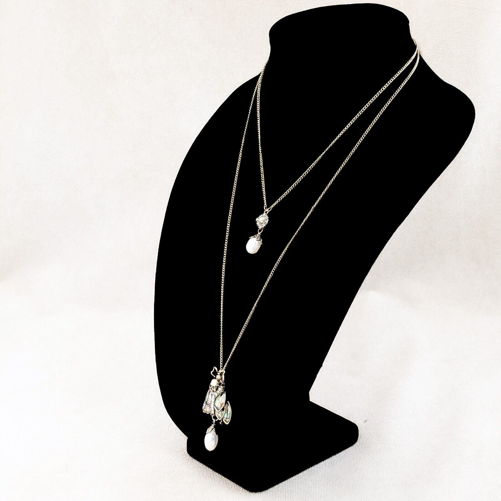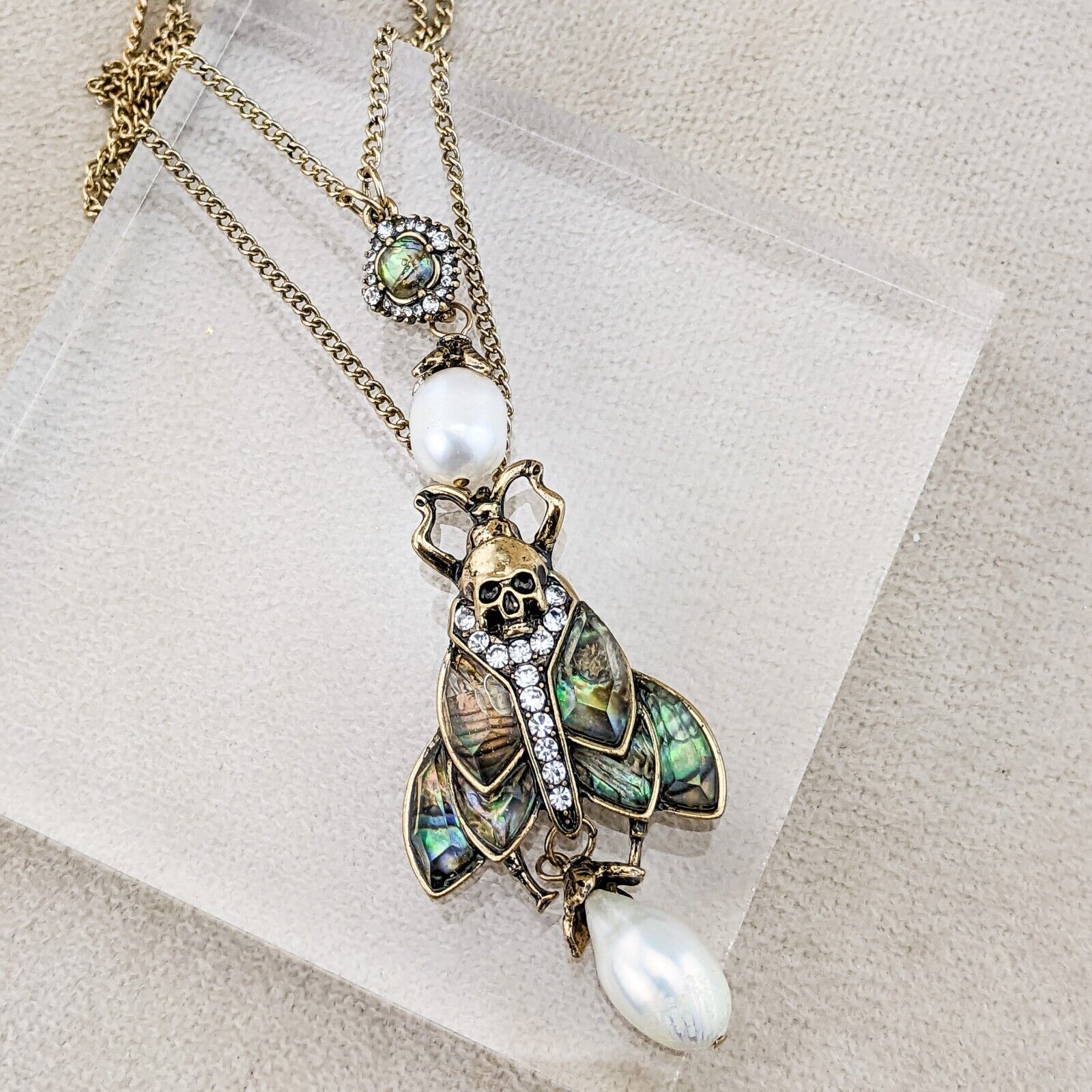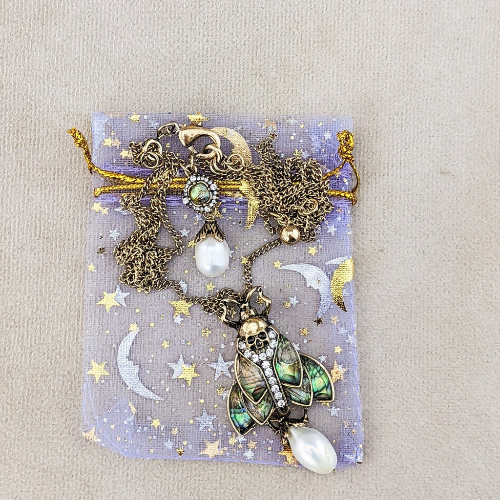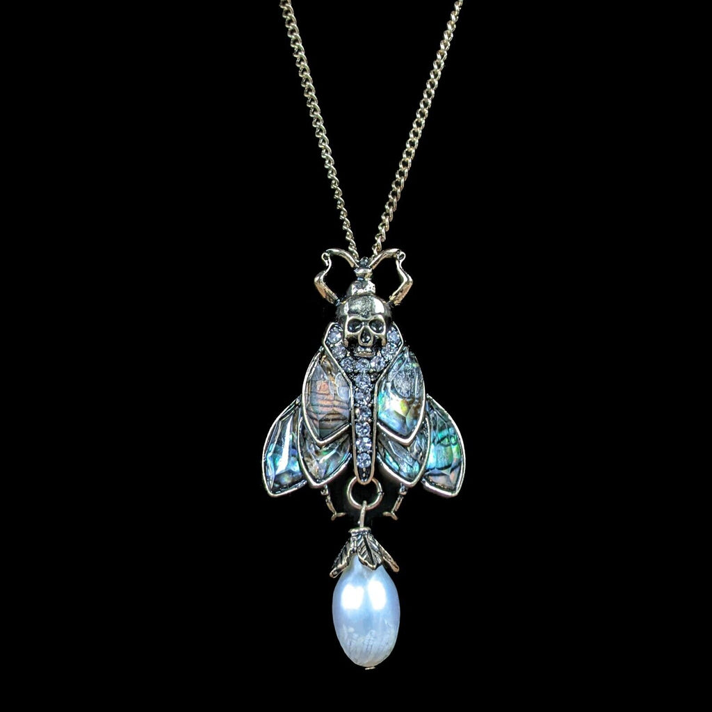 This piece is sure to enchant!  This is a very Rich looking Multi colored Deaths Head Moth Necklace, the wings look like they are abalone shell, there are also round rhinestones on the body and fresh water pearl hanging down.   Please see pictures for further description.  This is on a black leather 16" cord with a lobster claw latch and a 2" extender. This comes with a jewelry bag so it may be presented as a gift.