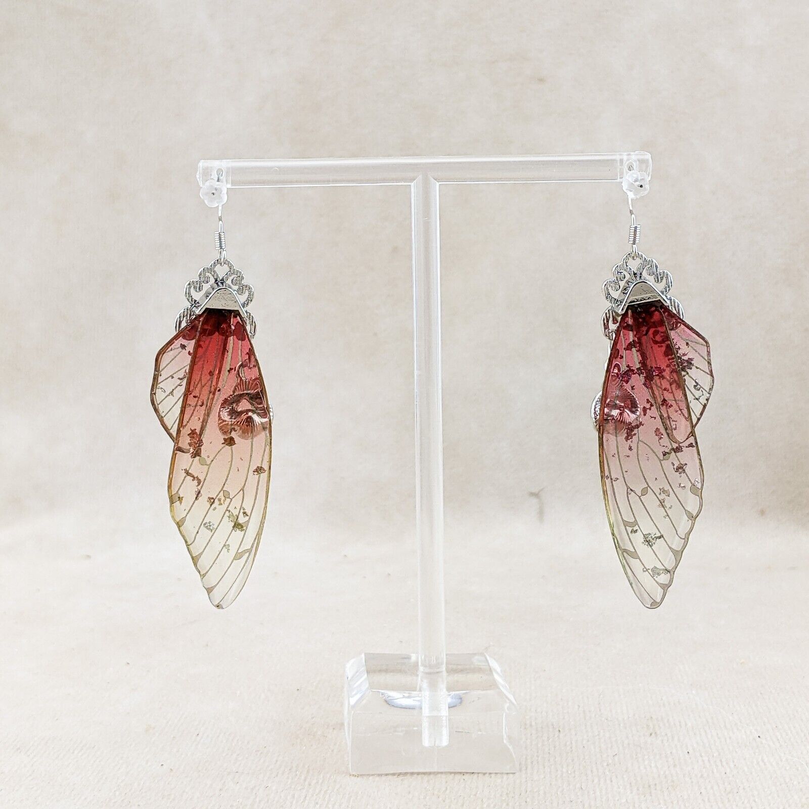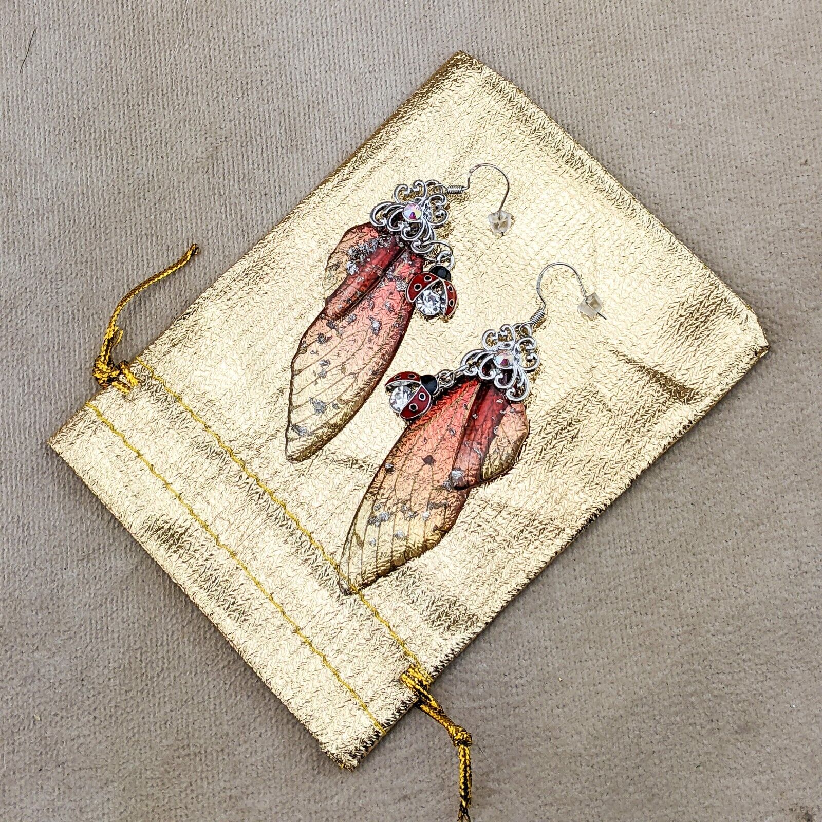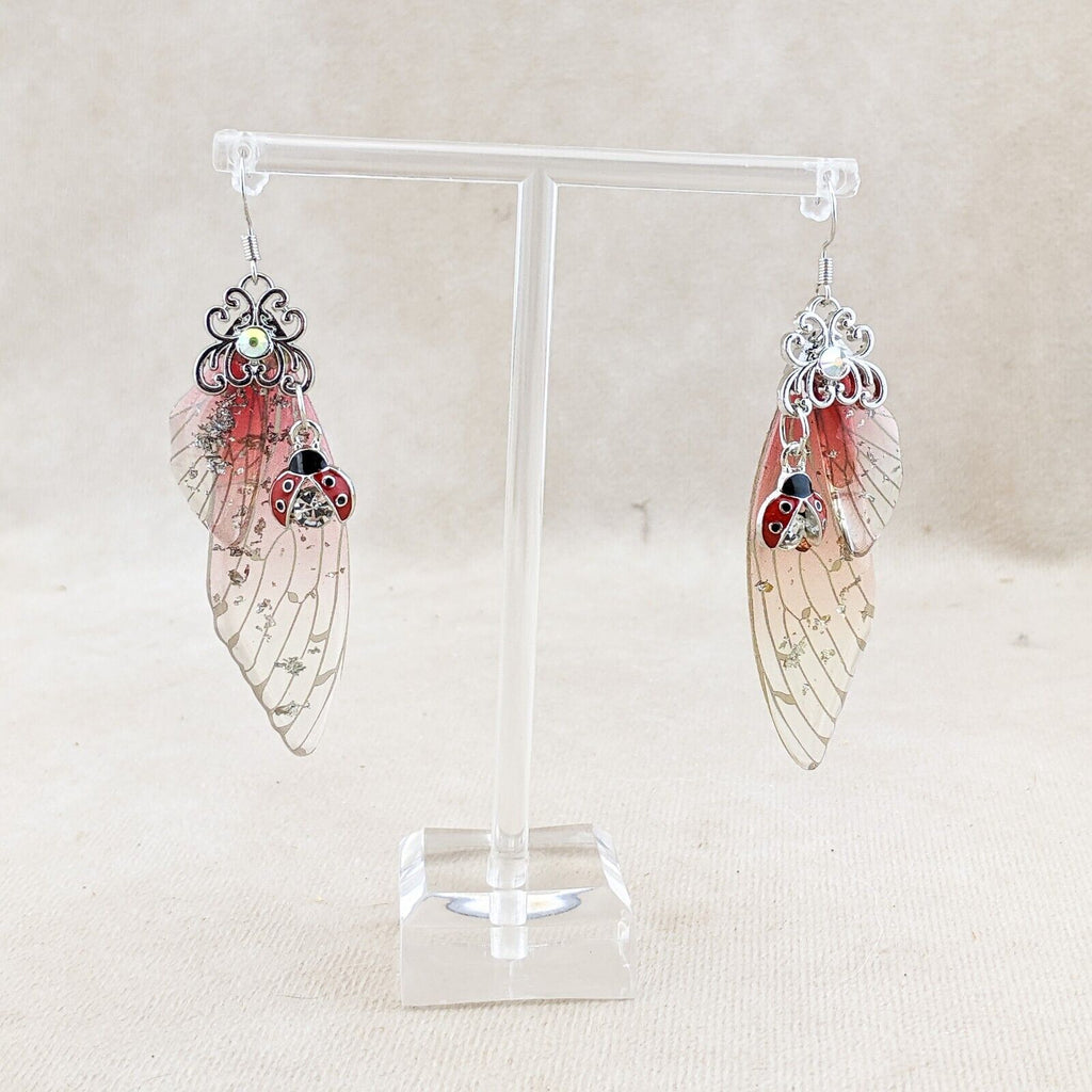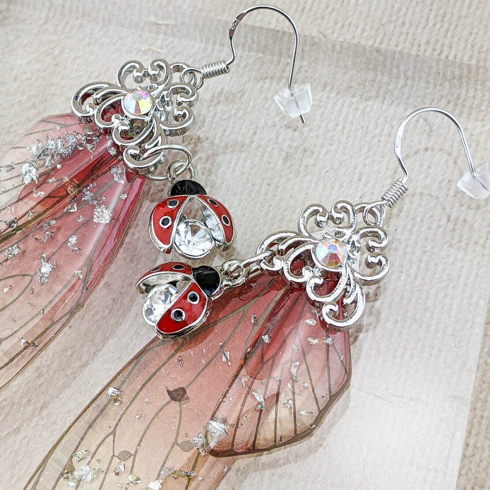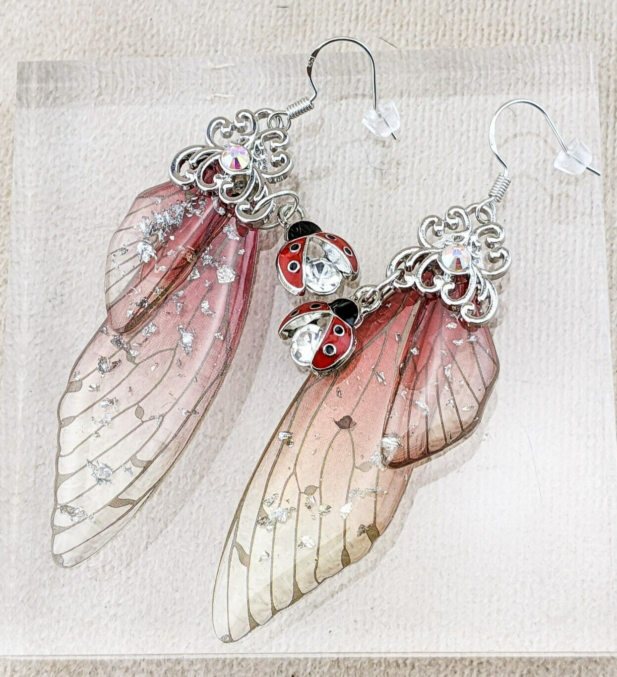 E14Eb Beautiful, fairylike, whimsical Cicada wing earrings with a Ladybug and rhinestone charm, perfect for a cute, unique gift for any occasion. They measure approximately 3" x 3/4". Silver 925 hook with a Magenta, pink and yellow tinged clear acrylic Cicada wing with silver flecks and a Ladybug silver charm.