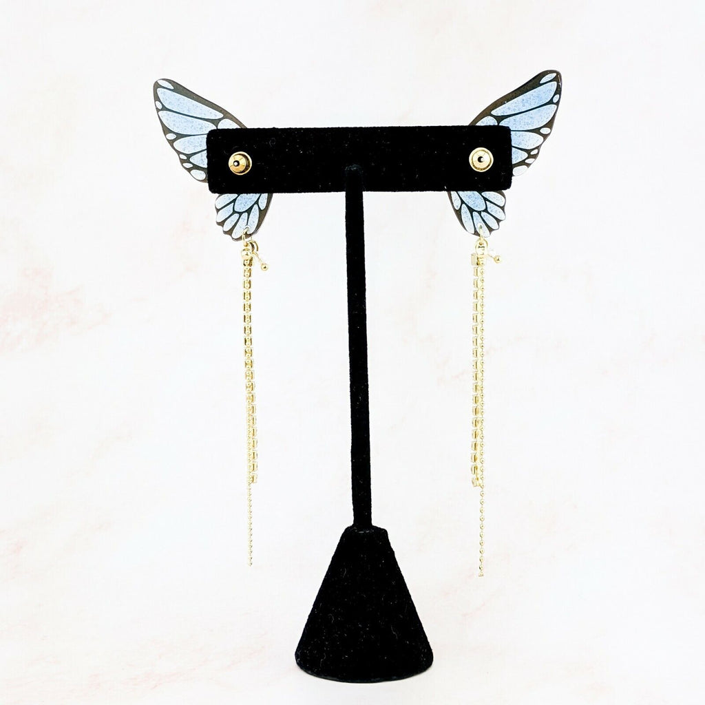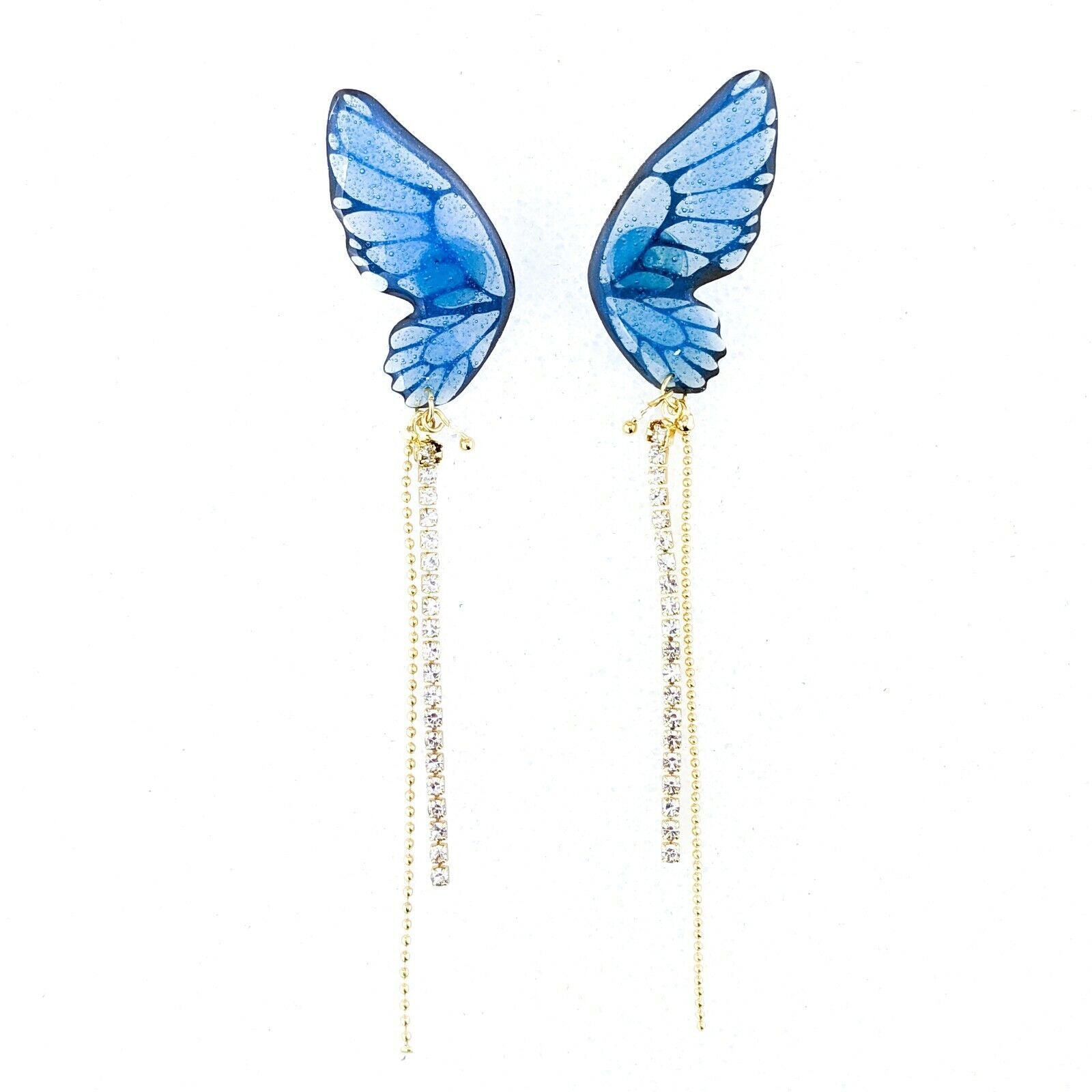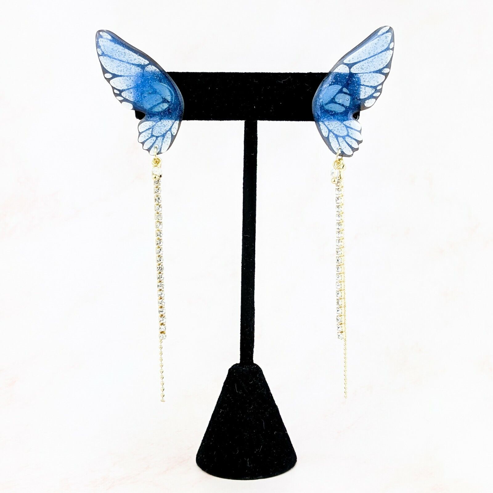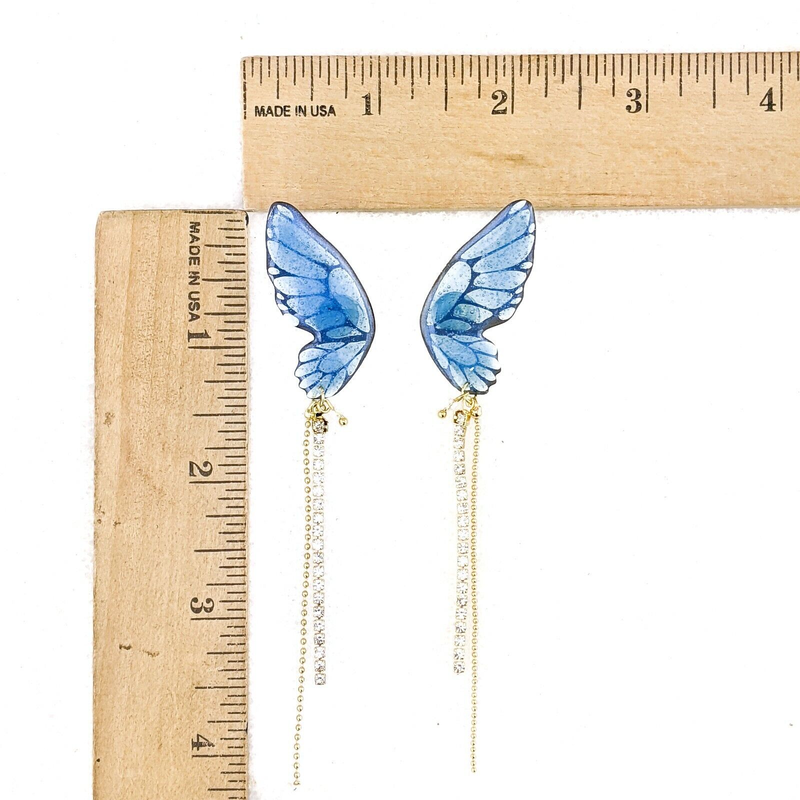 E14i  Beautiful, fairylike, whimsical Butterfly wing earrings, perfect for a cute, unique gift for any occasion. They measure approximately 4" x 3/4".  Gold tone post with a blue wing and sparkly rhinestone on one side and gold chains on the other, beautiful!.