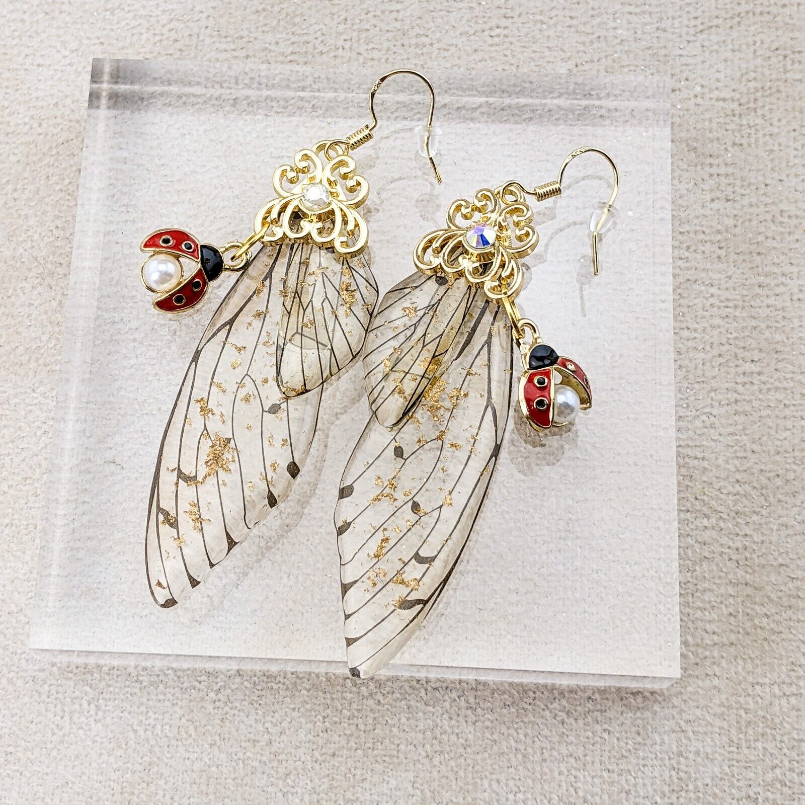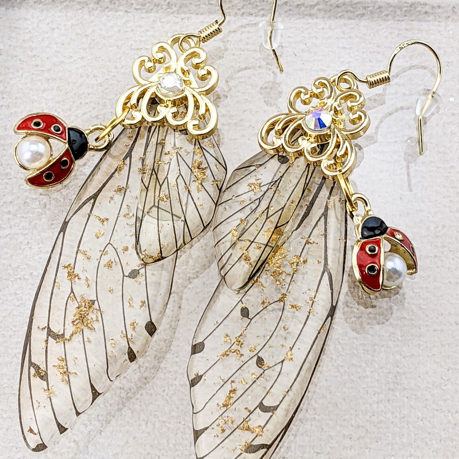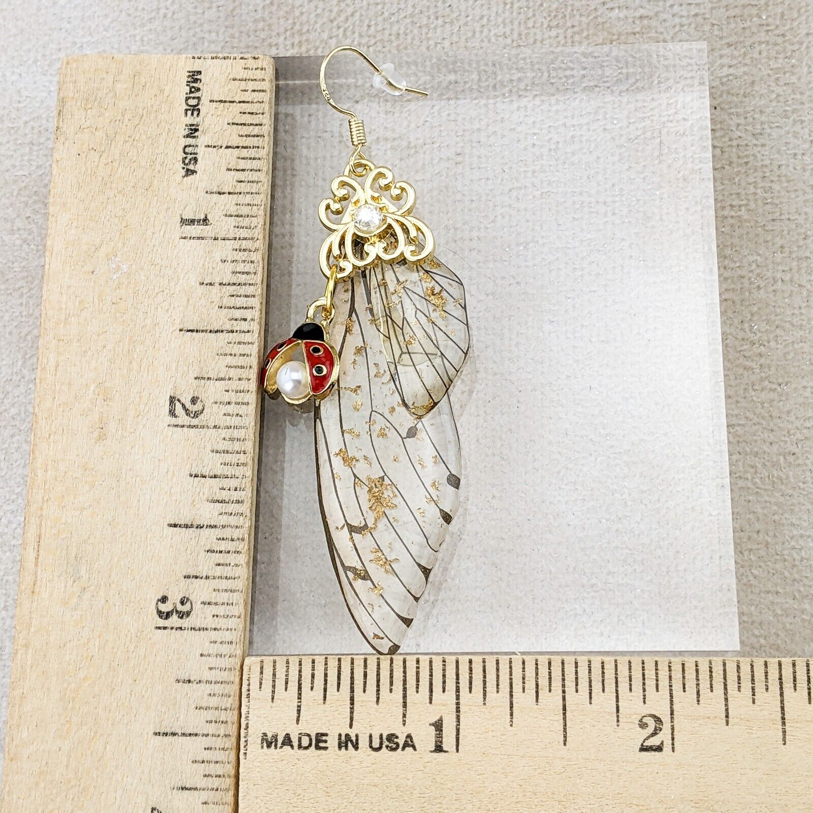 E14Lb Beautiful, fairylike, whimsical resin Cicada wing earrings with a Ladybug and Pearl charm, perfect for a cute, unique gift for any occasion. They measure approximately 3" x 3/4". Silver 925 fold plated hook with a Gold flecks in clear wings and a Ladybug Gold charm.