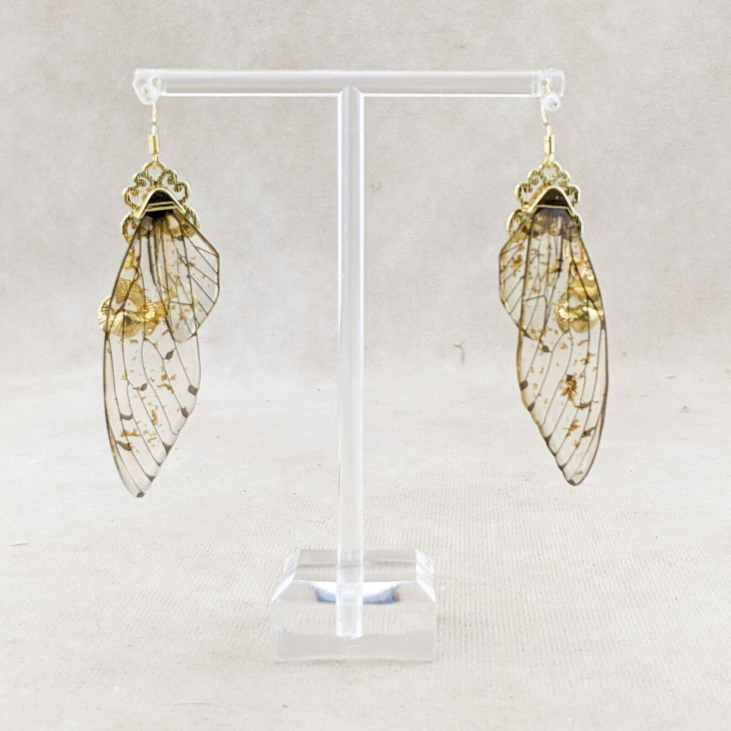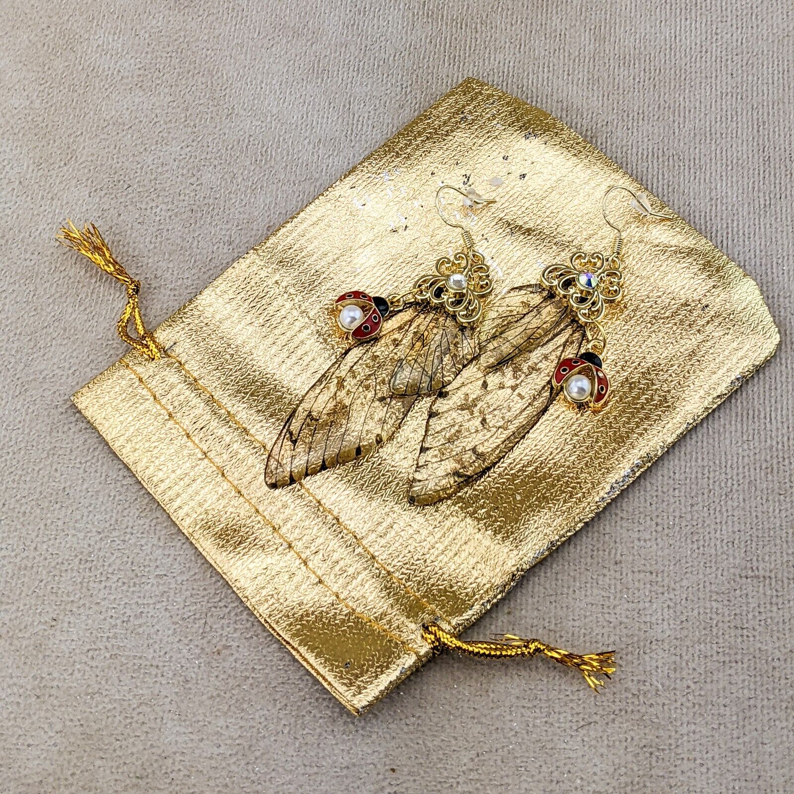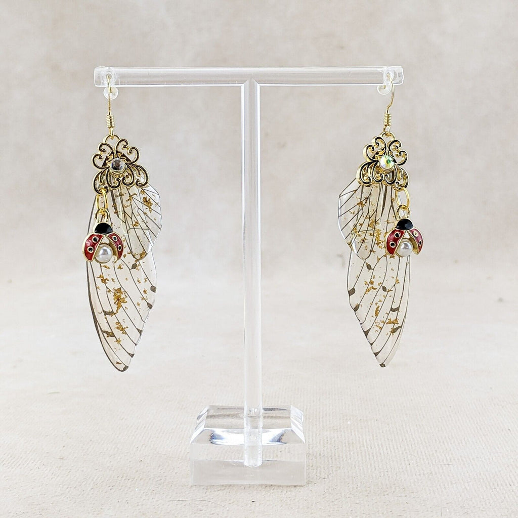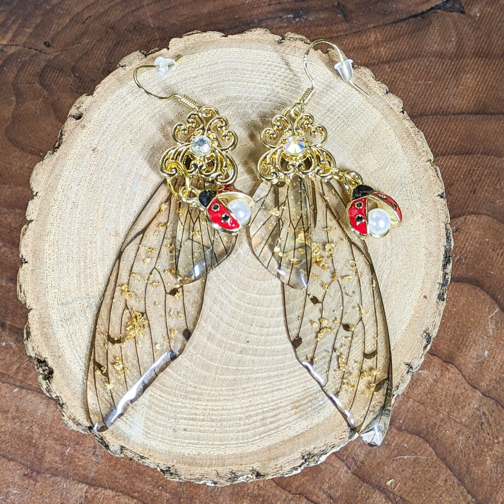 E14Lb Beautiful, fairylike, whimsical resin Cicada wing earrings with a Ladybug and Pearl charm, perfect for a cute, unique gift for any occasion. They measure approximately 3" x 3/4". Silver 925 fold plated hook with a Gold flecks in clear wings and a Ladybug Gold charm.
