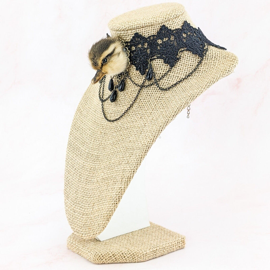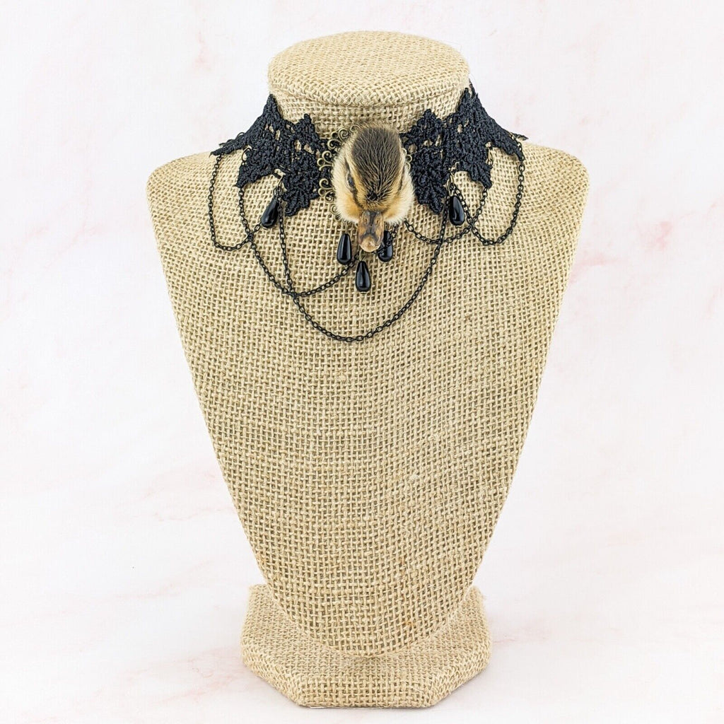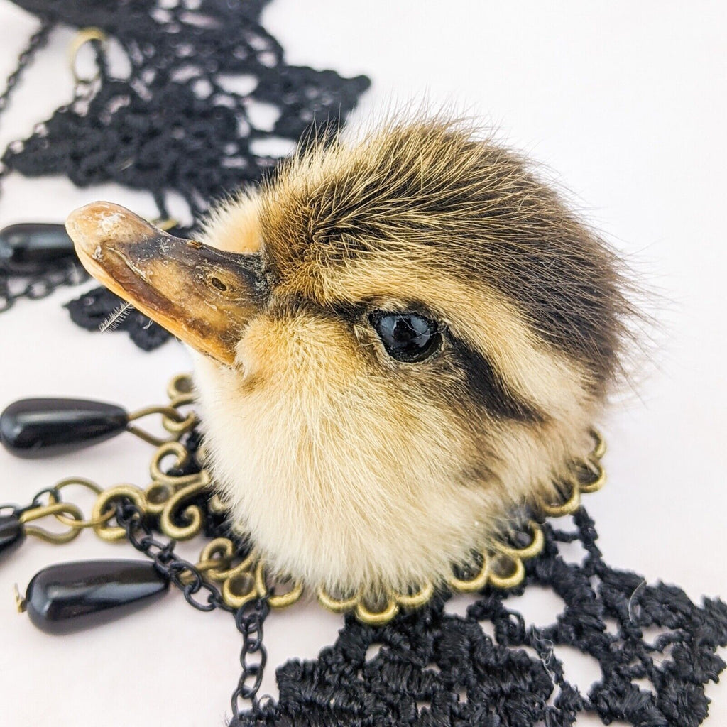 e15d #  This is a taxidermy real domestic duck duckling head  Necklace/choker.  This is a domestic duck and it looks great on this Goth Necklace! Please see pictures for the dimensions. This is a great gift for those so inclined!  Please see pictures for description as there are several of these available and all are a little different.