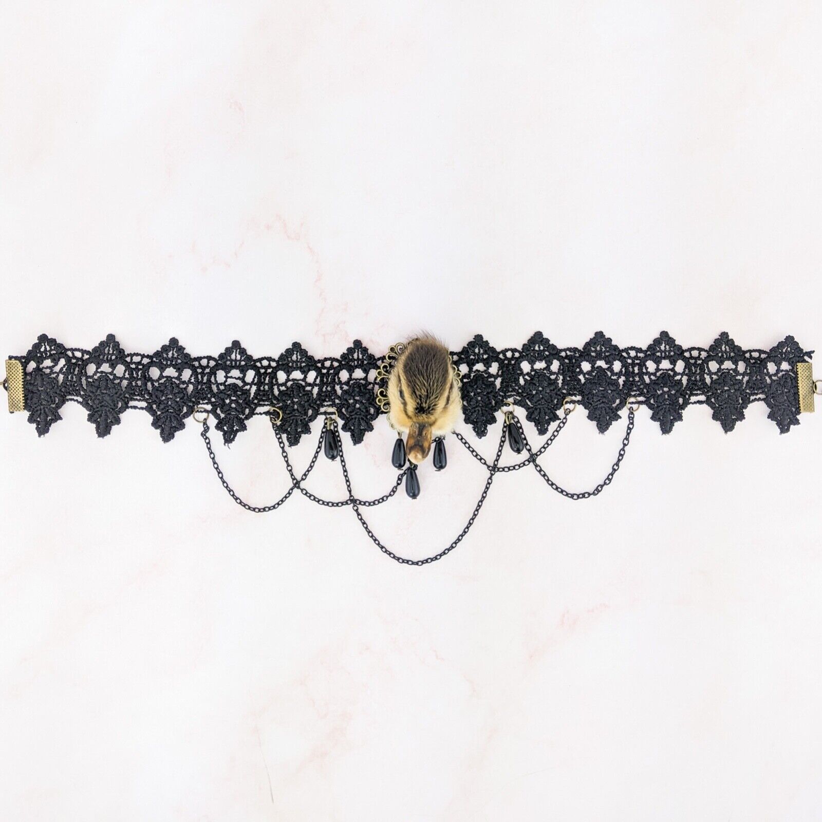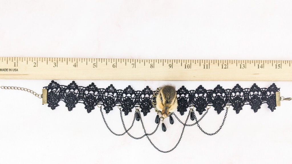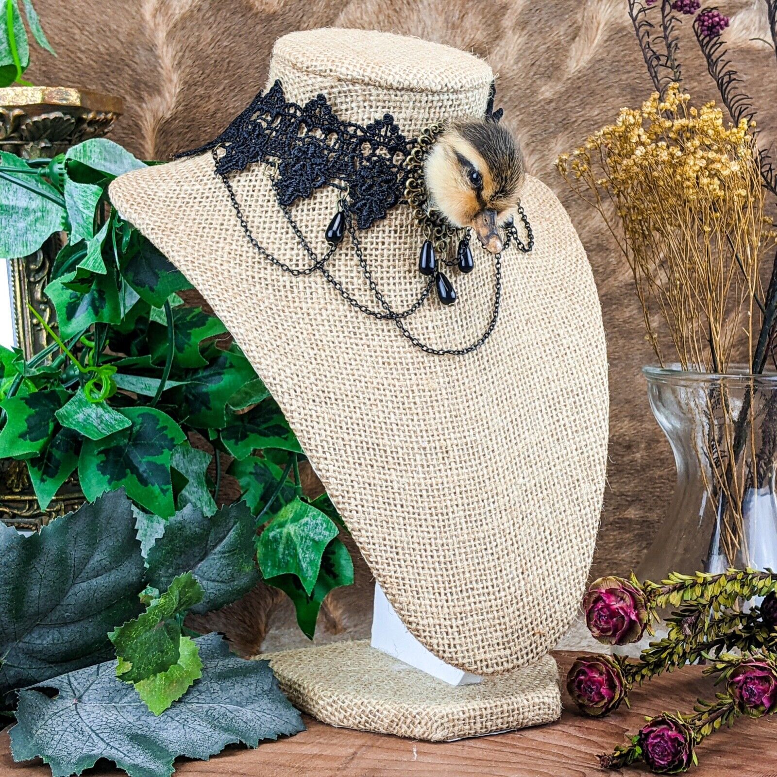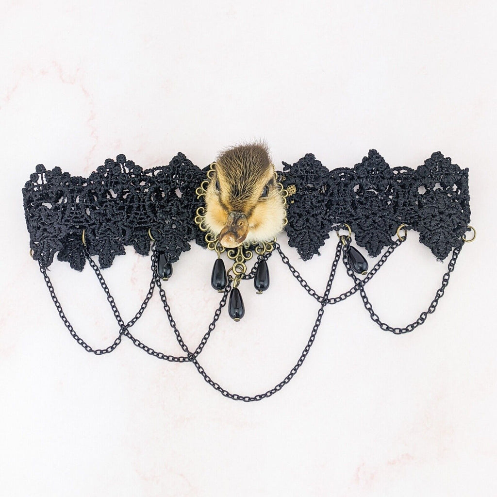 e15d #  This is a taxidermy real domestic duck duckling head  Necklace/choker.  This is a domestic duck and it looks great on this Goth Necklace! Please see pictures for the dimensions. This is a great gift for those so inclined!  Please see pictures for description as there are several of these available and all are a little different.
