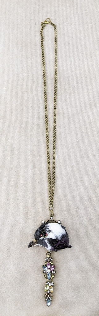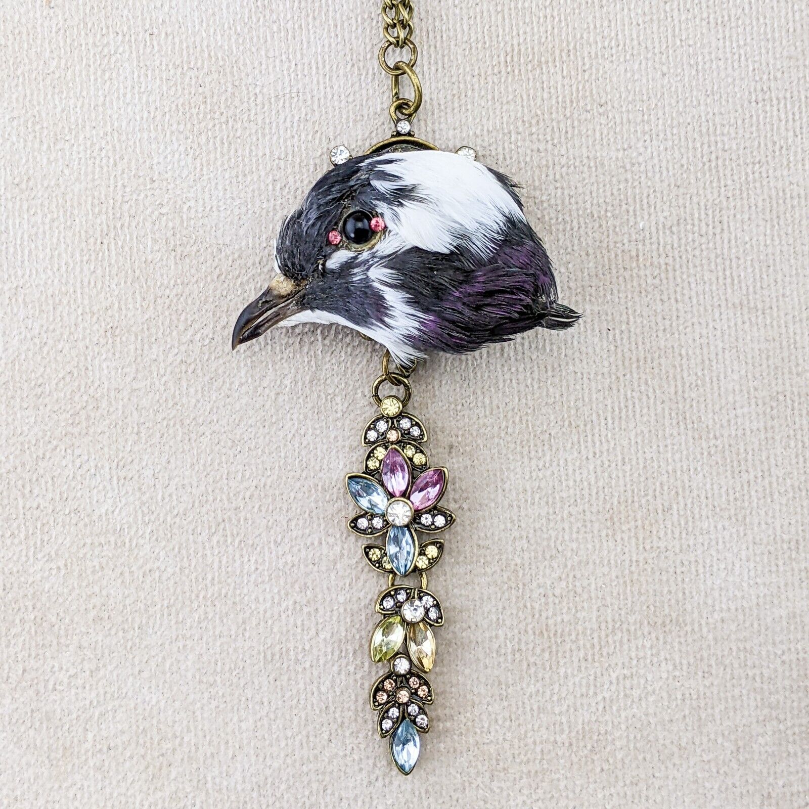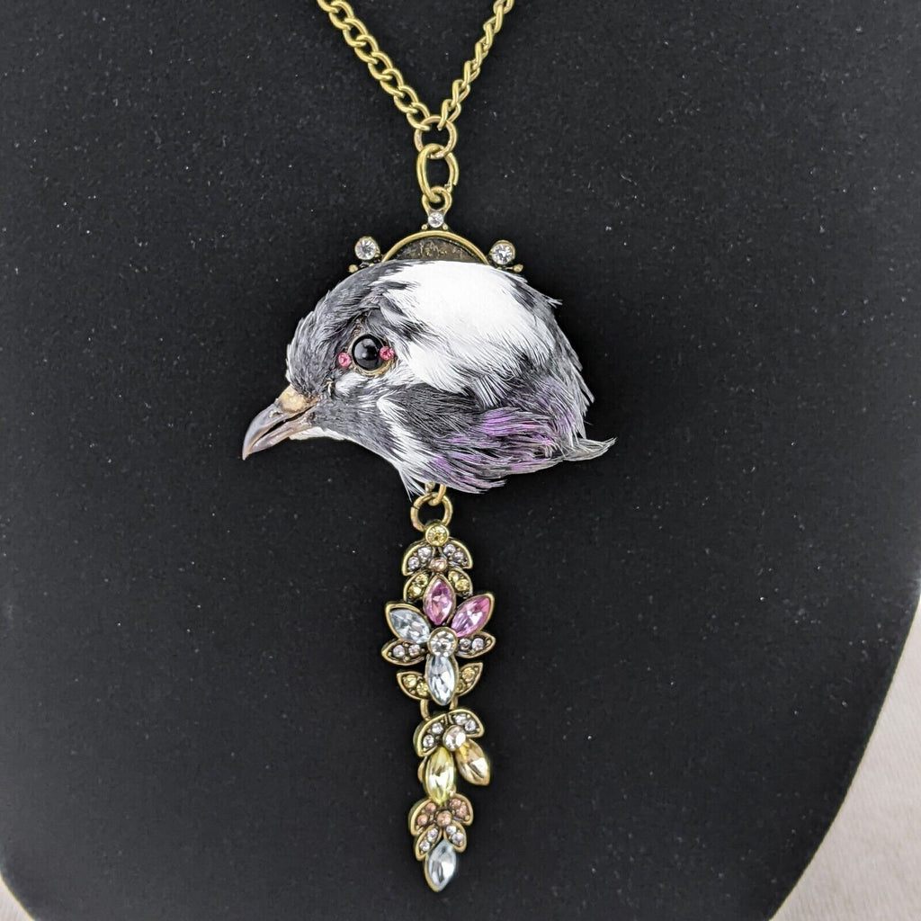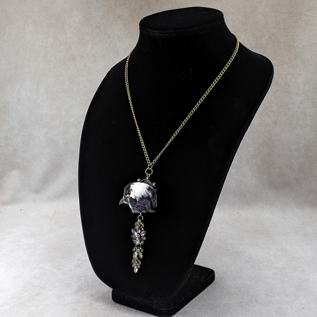 Capture a touch of dark elegance with this stunning taxidermy pigeon head pendant. This unique piece features a pigeon head with a striking black eye accented by two pink rhinestones for the inner and outer eye, mounted on an ornate gold pendant embellished with jewels. Suspended from a gold chain necklace, this statement piece is sure to turn heads and add a hint of macabre charm to any outfit. Perfect for those who appreciate the beauty in the unusual, this necklace is a one-of-a-kind addition to any collection.