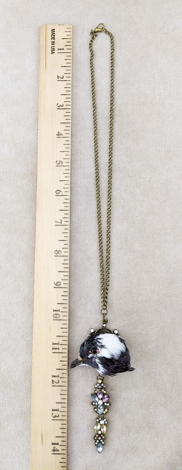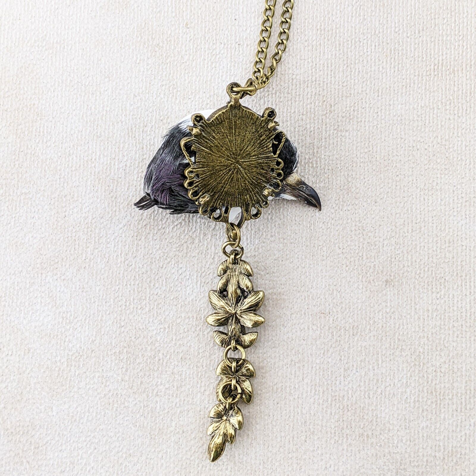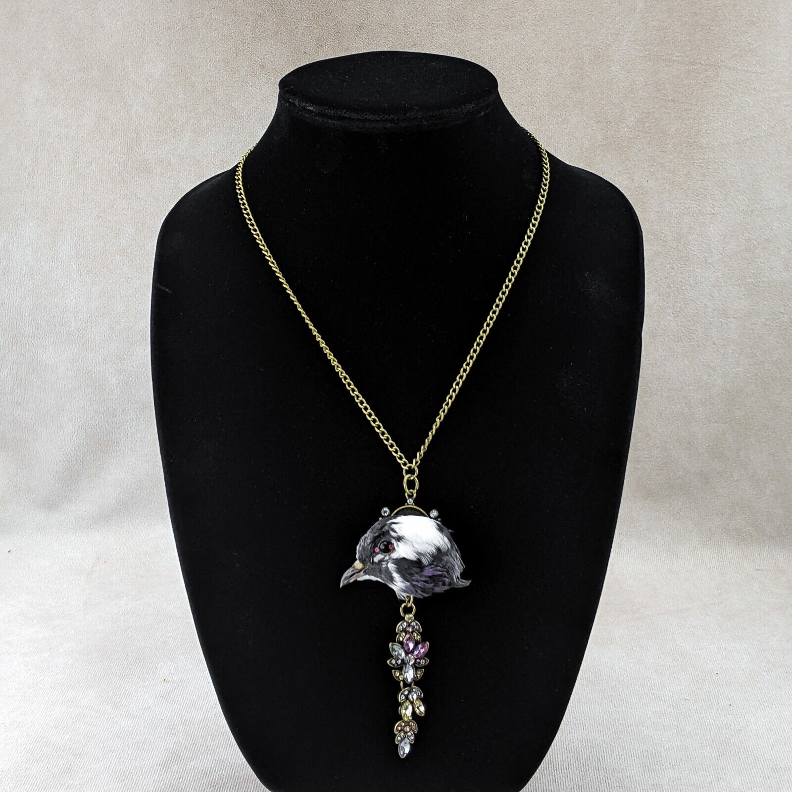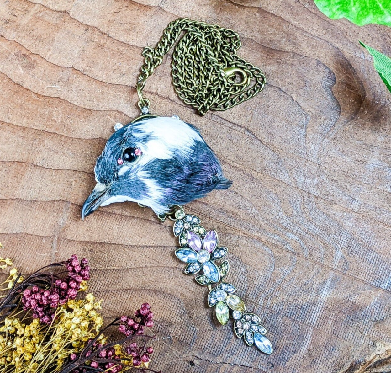 Capture a touch of dark elegance with this stunning taxidermy pigeon head pendant. This unique piece features a pigeon head with a striking black eye accented by two pink rhinestones for the inner and outer eye, mounted on an ornate gold pendant embellished with jewels. Suspended from a gold chain necklace, this statement piece is sure to turn heads and add a hint of macabre charm to any outfit. Perfect for those who appreciate the beauty in the unusual, this necklace is a one-of-a-kind addition to any collection.