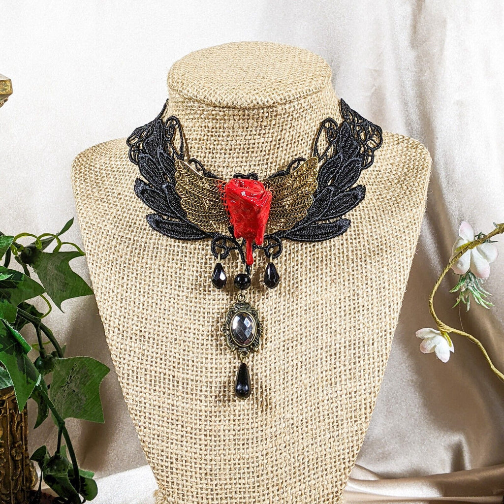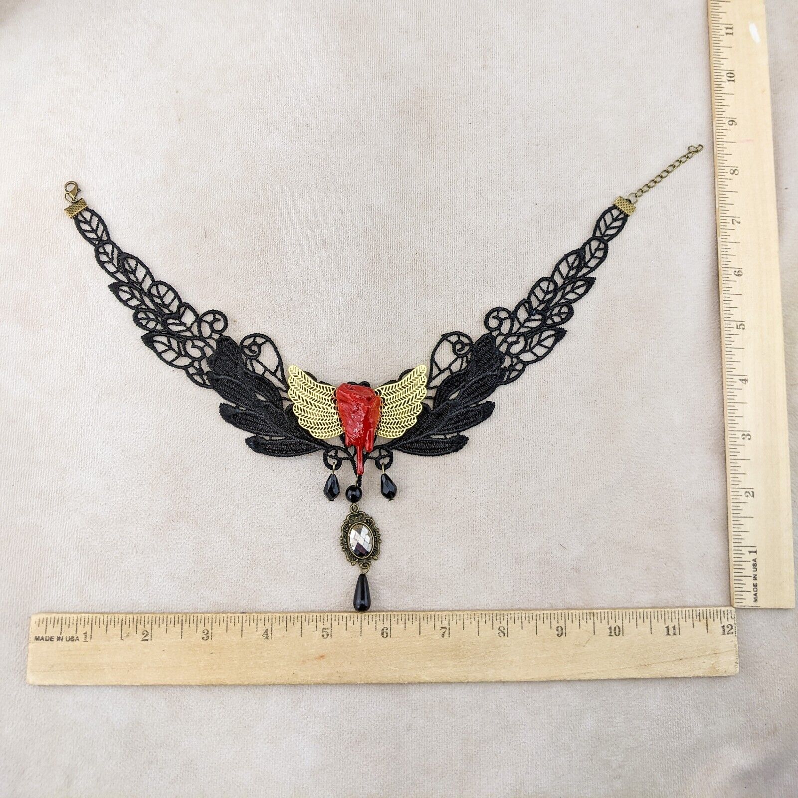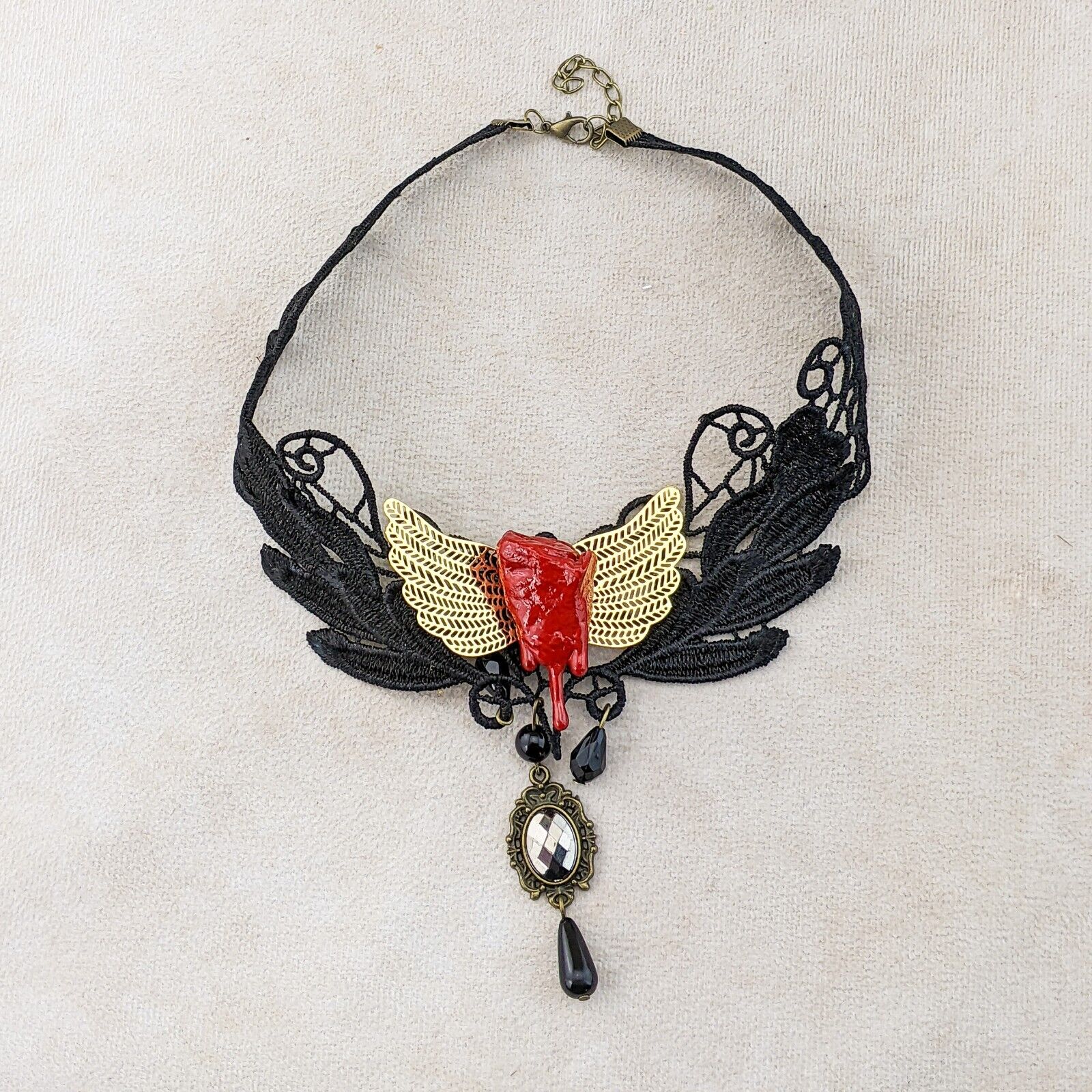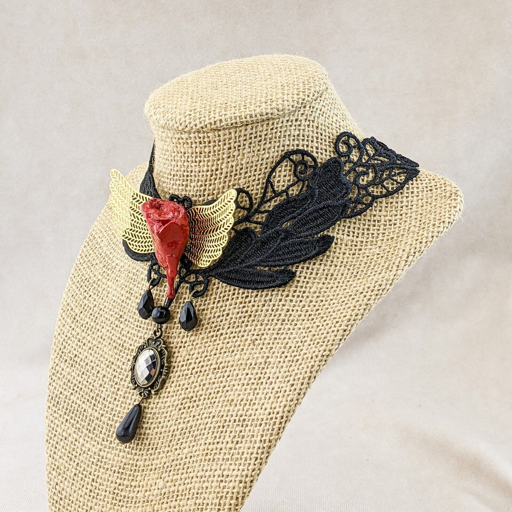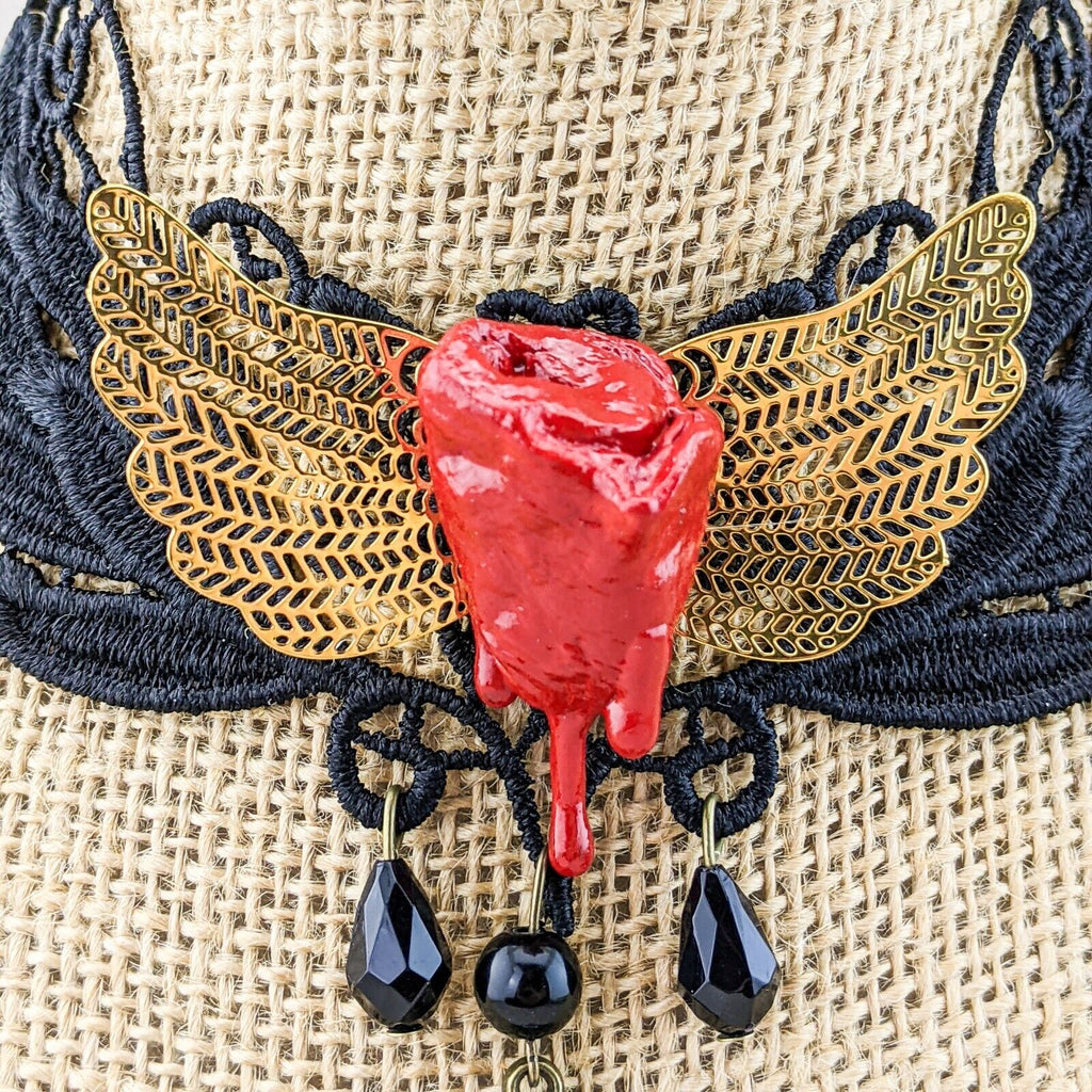 e16a #1 Add a touch of Gothic elegance to your outfit with this unique handmade black fabric choker featuring a real preserved dehydrated chicken heart painted a striking red hue. Suspended behind the heart are intricately detailed golden metal wings, while below hang two shimmering black gems and a large silver gem pendant. This statement piece is sure to turn heads and add a touch of dark beauty to any look. Perfect for those who love the unusual and macabre, this choker is a one-of-a-kind accessory that will set you apart from the crowd. This piece measure approx. 15" including the 2" chain extender