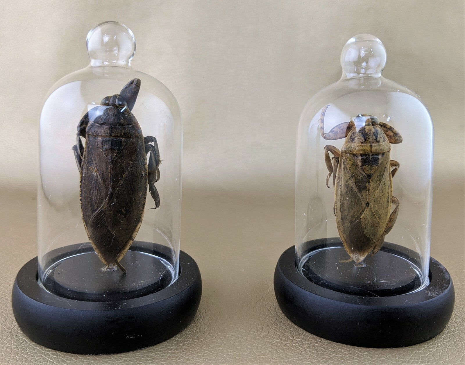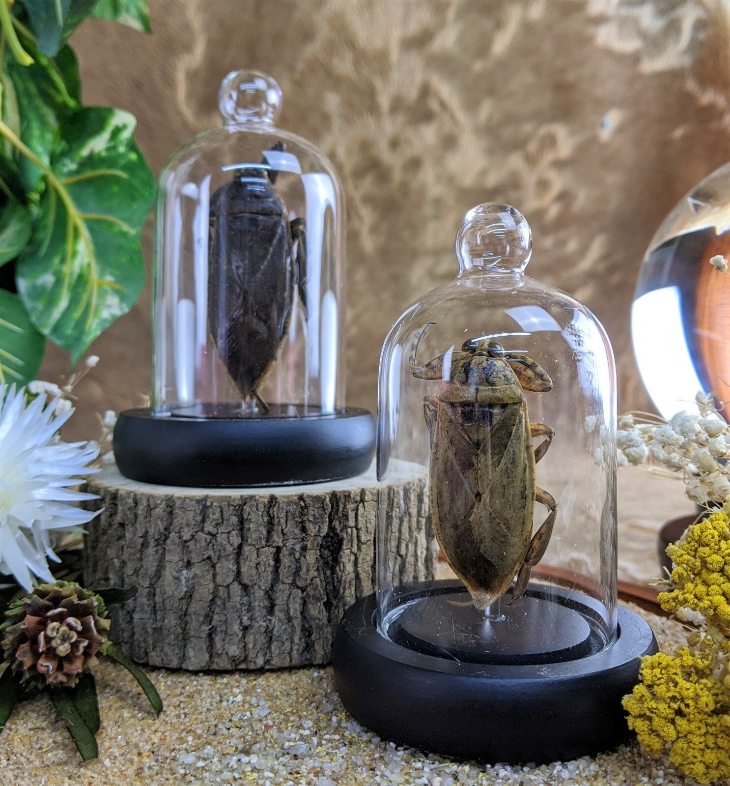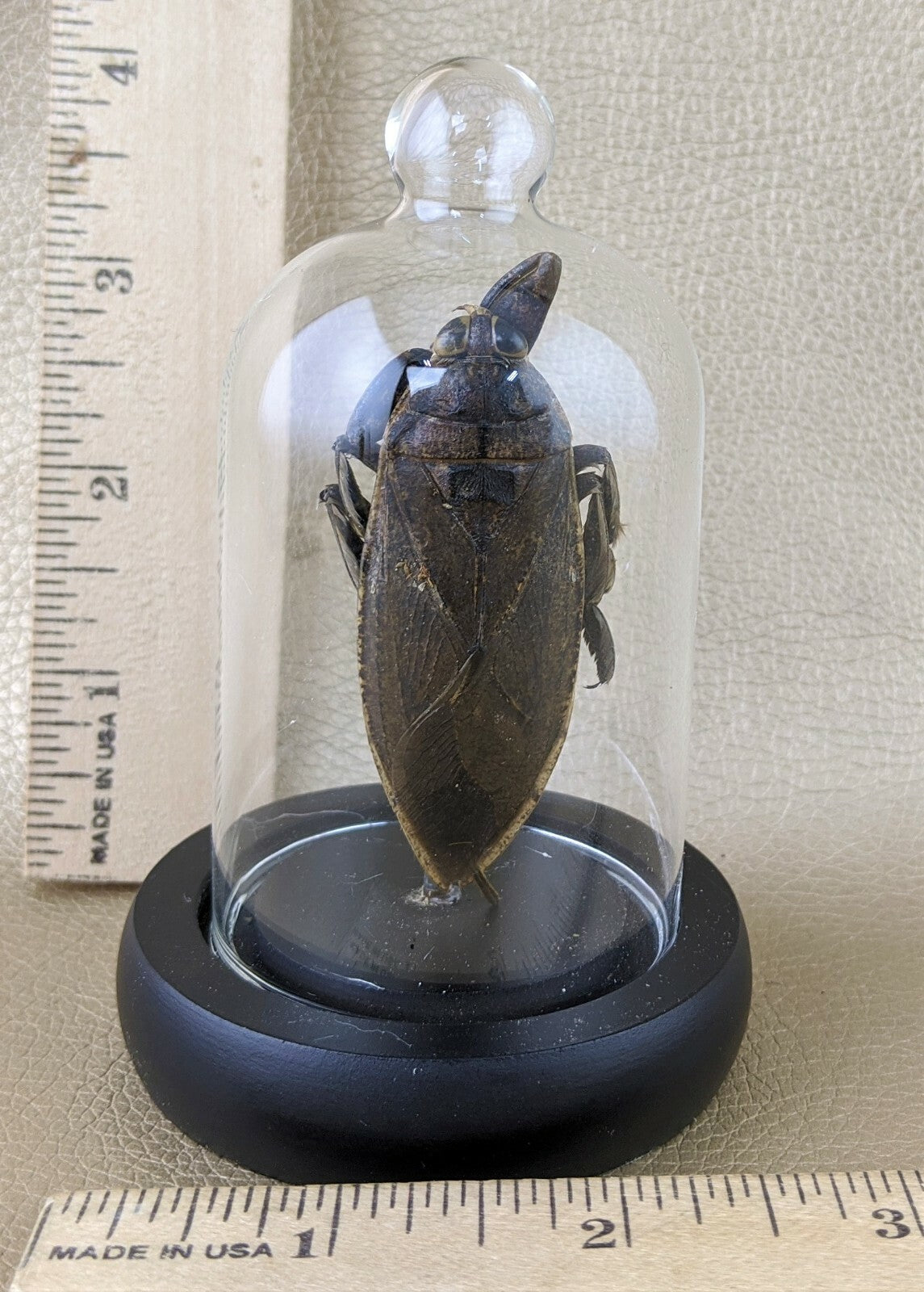 E9c #4 This is a large specimen of a Giant water bug and he looks mean! This display is approx. 4 x 3" with a glass dome and a black wood bottom, the dome is removable. This would be a great addition to any collection as well as a great educational piece.