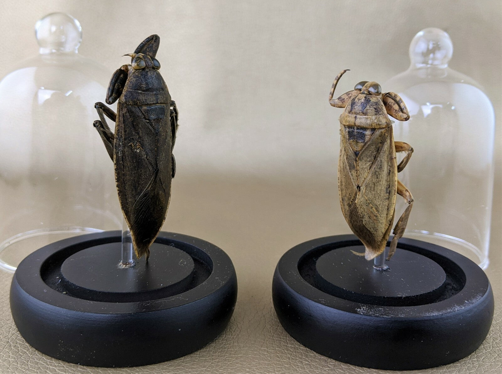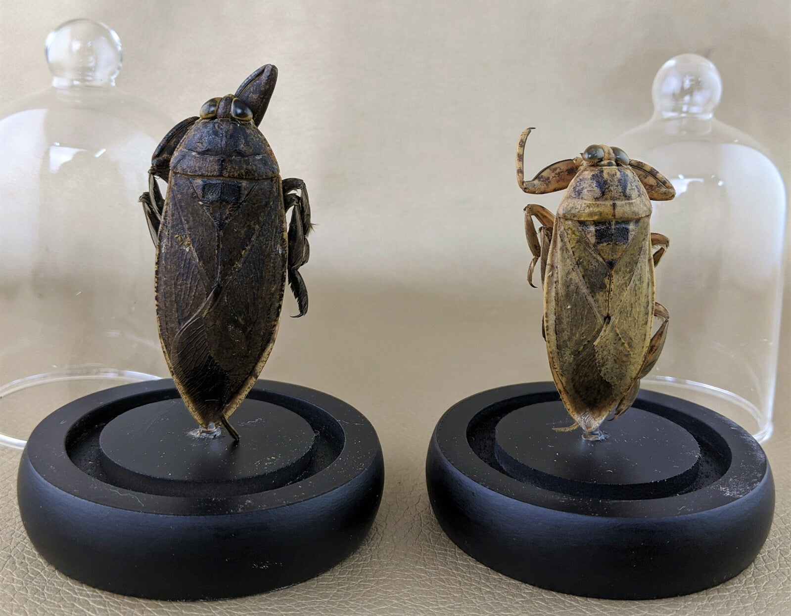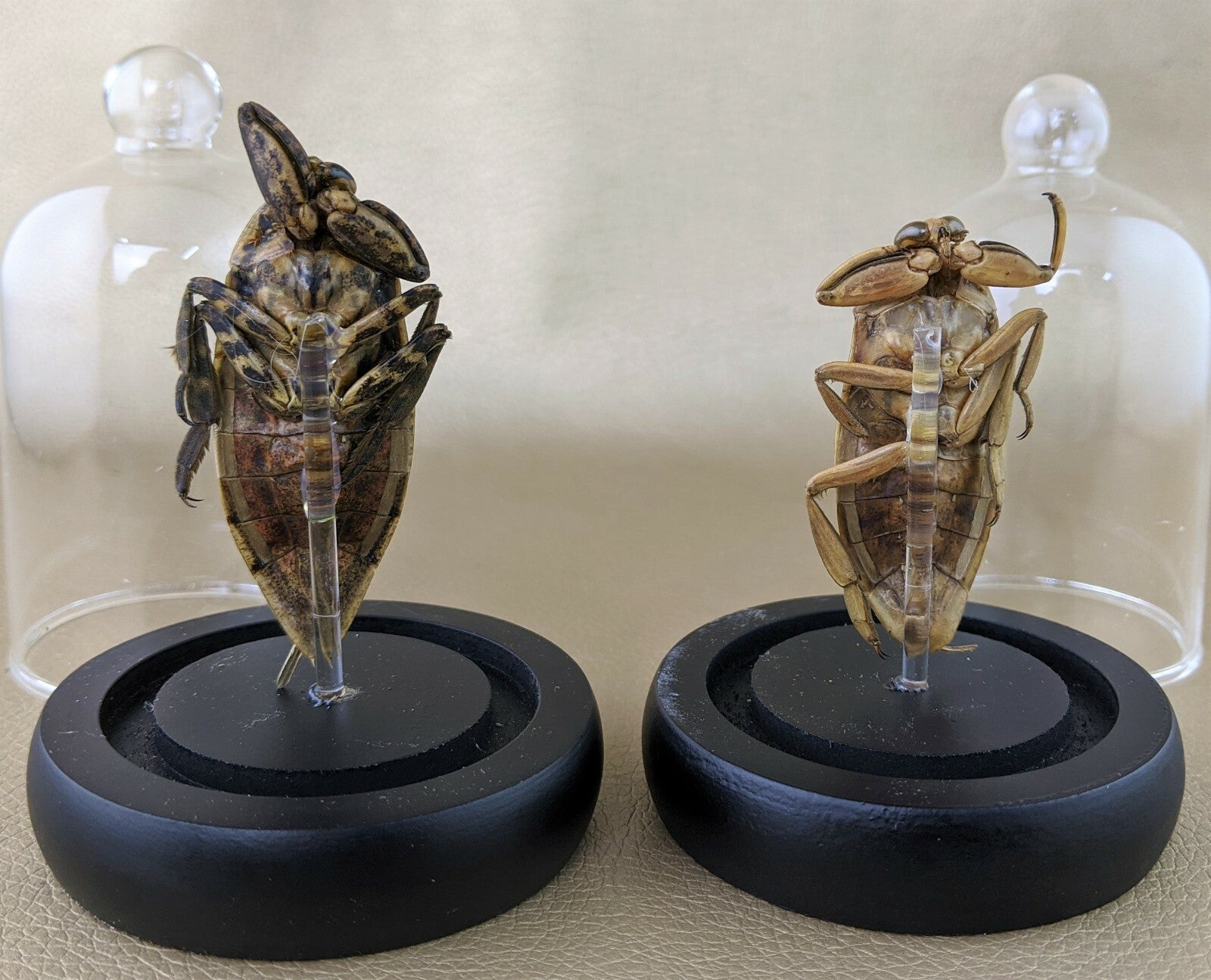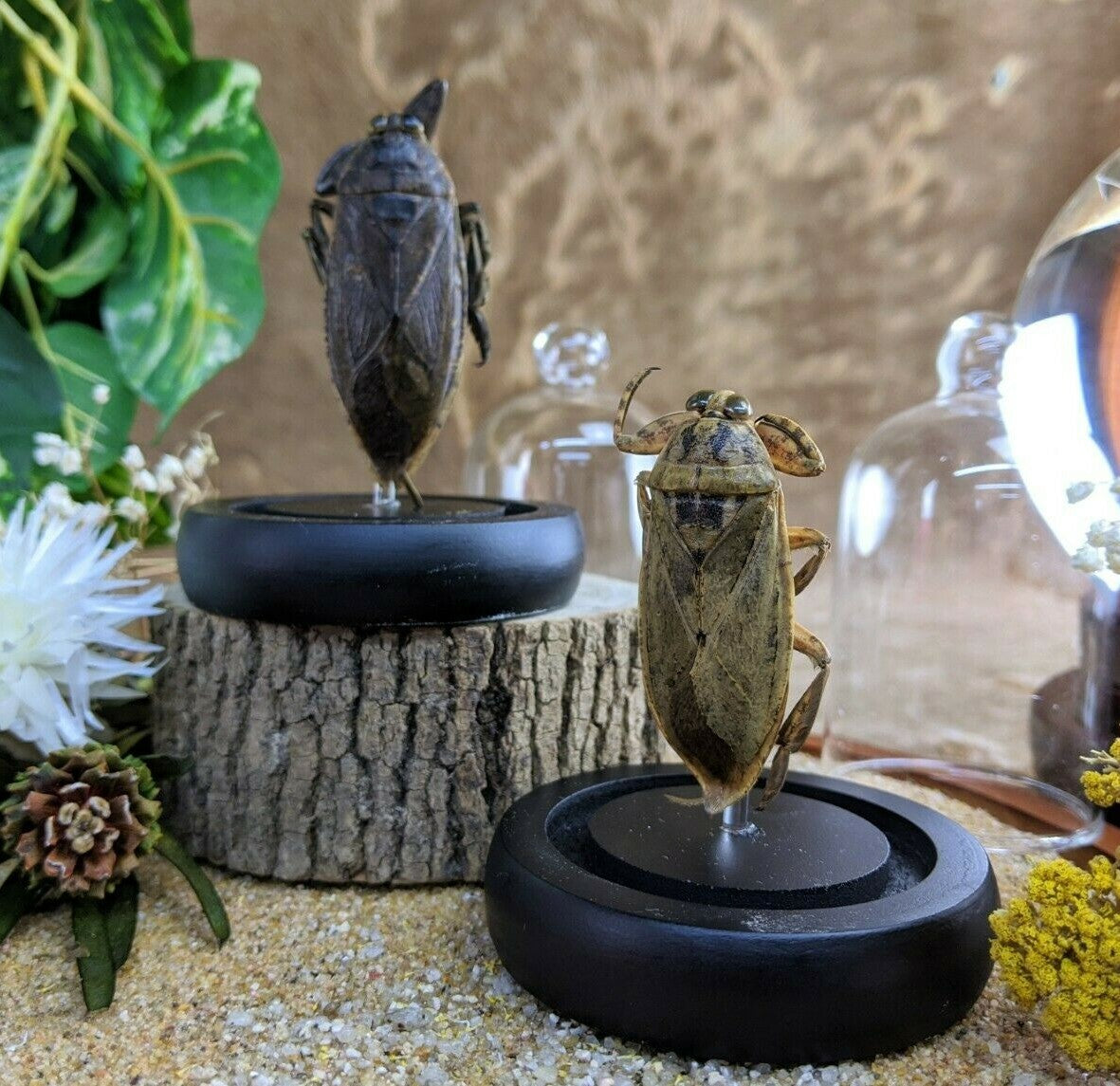 E9c #4 This is a large specimen of a Giant water bug and he looks mean! This display is approx. 4 x 3" with a glass dome and a black wood bottom, the dome is removable. This would be a great addition to any collection as well as a great educational piece.