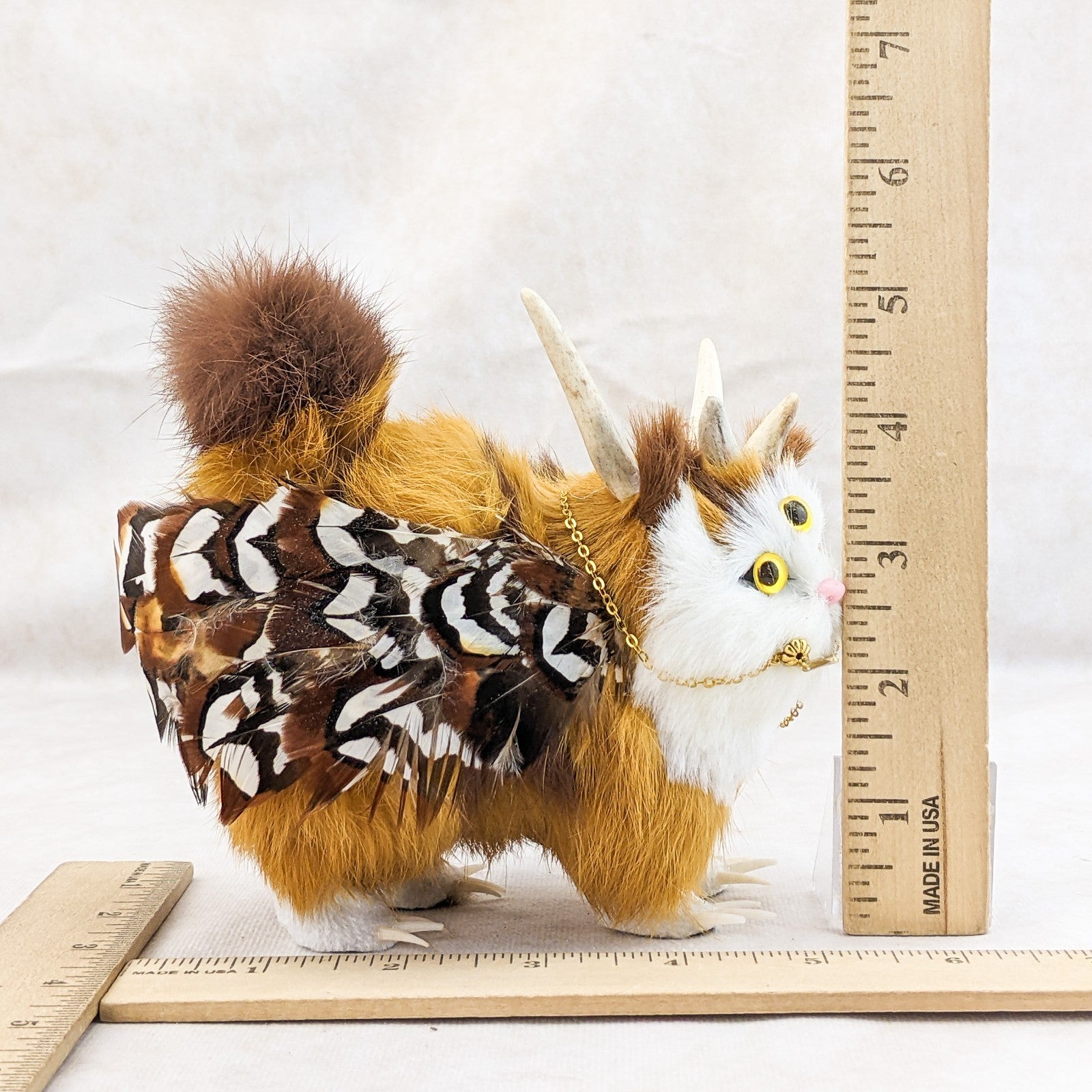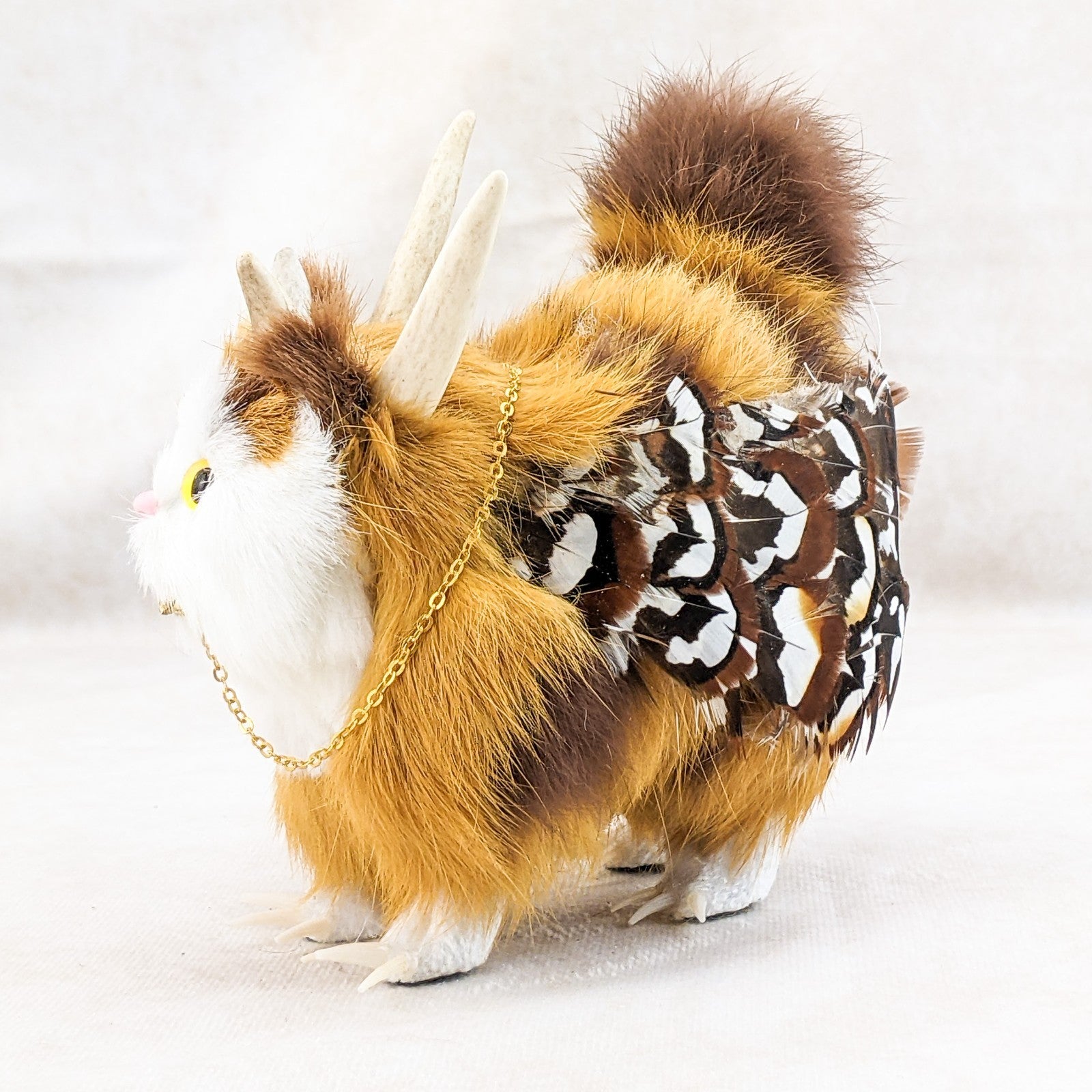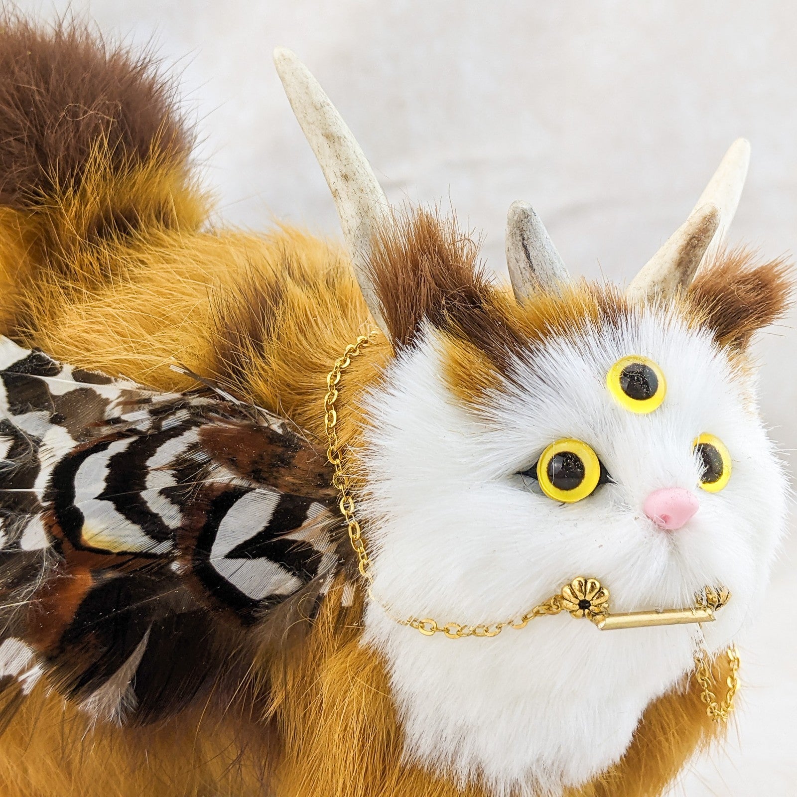 z54a #4 Imagine a feline so fearsome, so unique, that it can only be described as a beast of fantasy. This strange and adorable creature has the body of a cat, the wings of a bird, and four horns adorning its head. With its piercing three wild eyes, fearsome claws and a gold bit and chain in its mouth, this steed is both intimidating and oddly adorable. For those who appreciate the quirky and the strange, this mythical cat is sure to delight. Distant cousin to the Hippogriff! This is made with a faux furry cat, real deer tines and real rooster feather pads. Display is approx. 6 1/4 x 5 x 3".