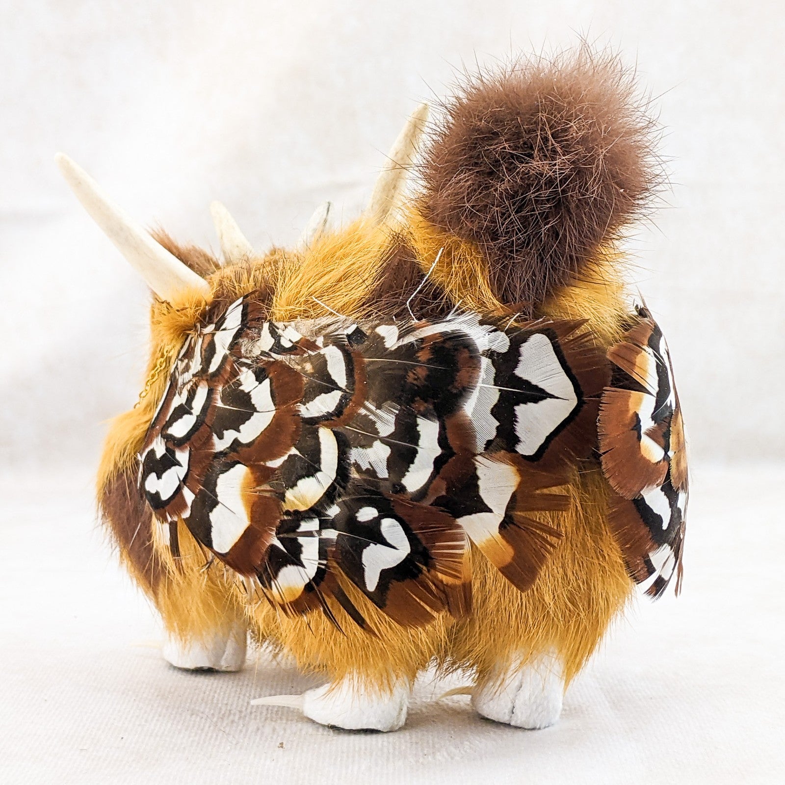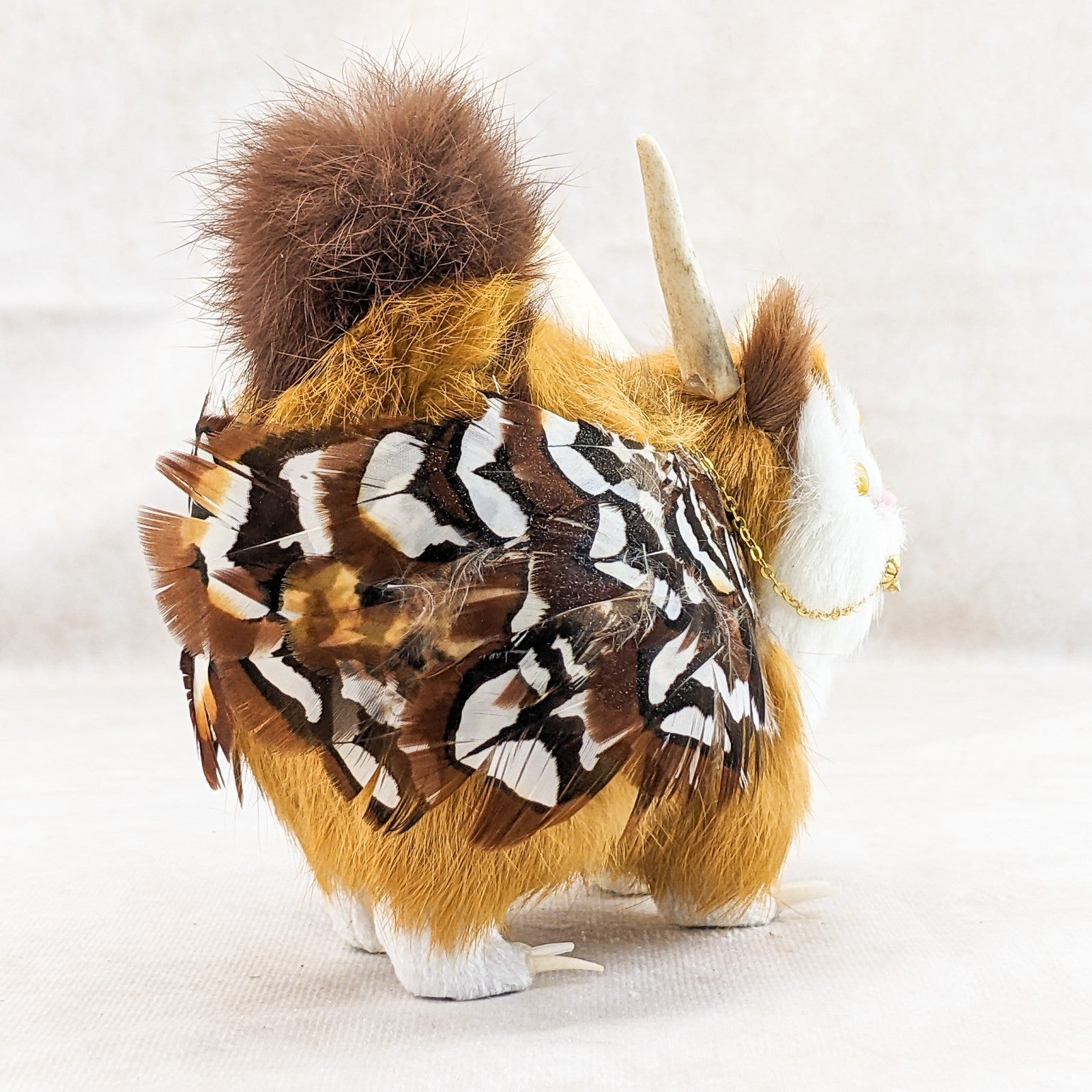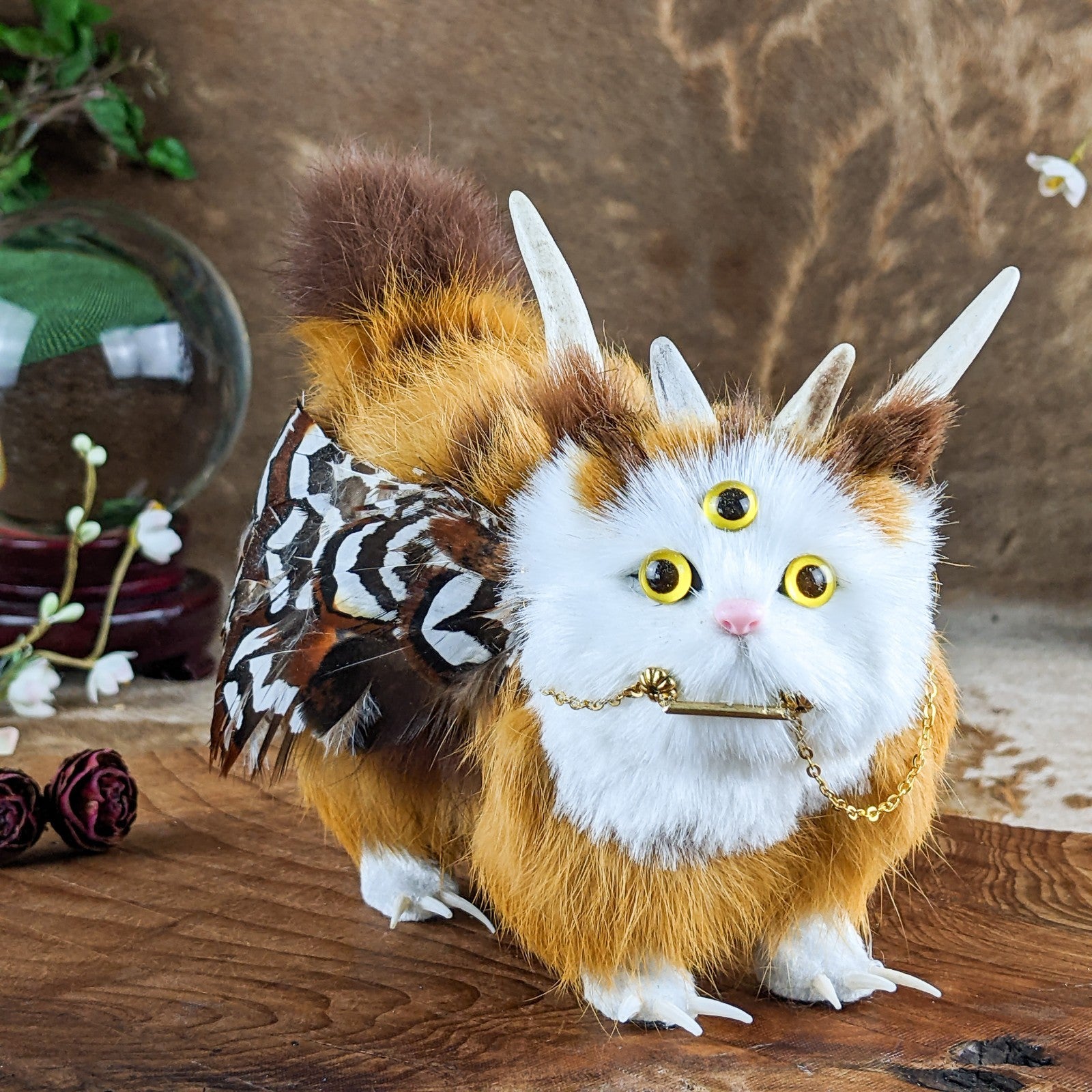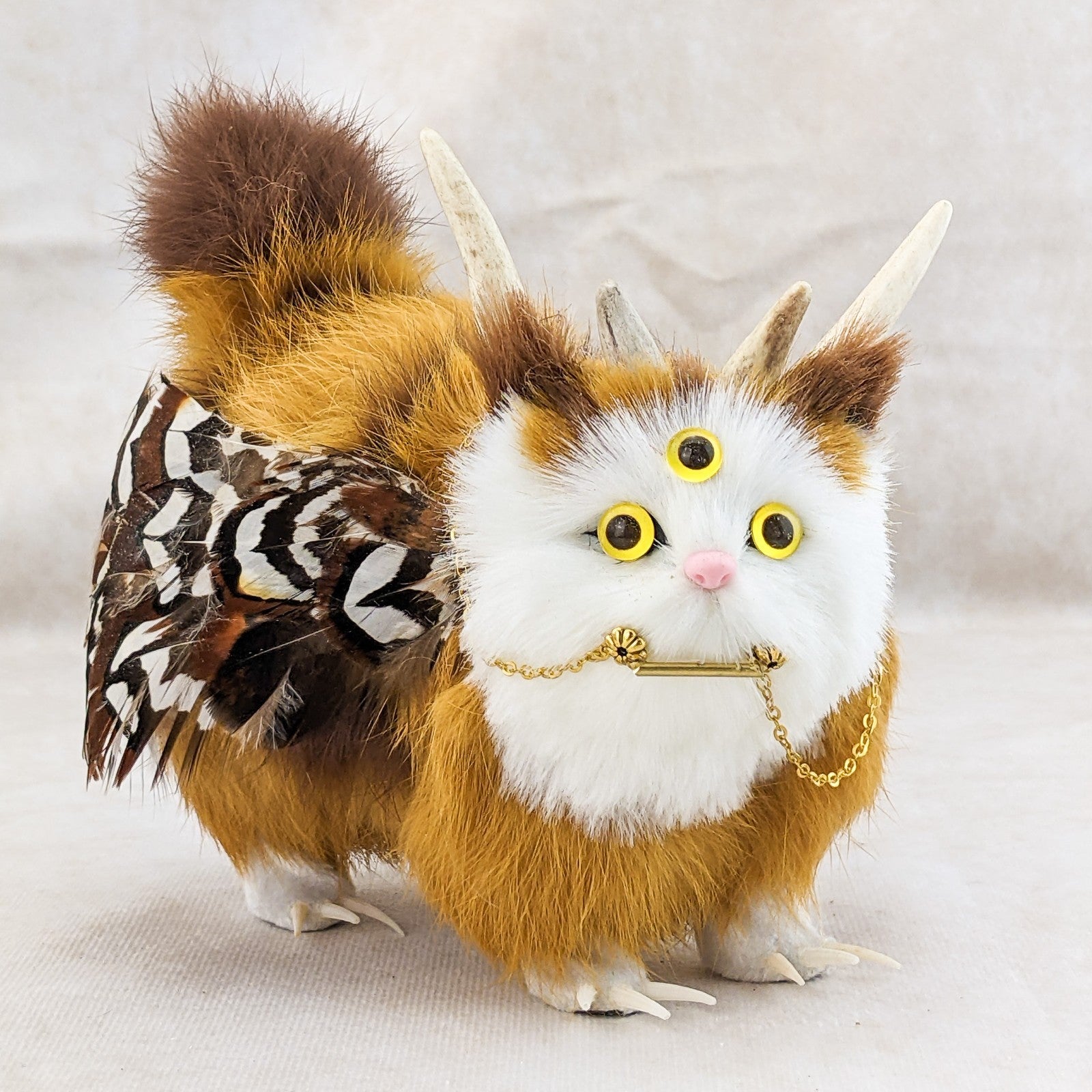 z54a #4 Imagine a feline so fearsome, so unique, that it can only be described as a beast of fantasy. This strange and adorable creature has the body of a cat, the wings of a bird, and four horns adorning its head. With its piercing three wild eyes, fearsome claws and a gold bit and chain in its mouth, this steed is both intimidating and oddly adorable. For those who appreciate the quirky and the strange, this mythical cat is sure to delight. Distant cousin to the Hippogriff! This is made with a faux furry cat, real deer tines and real rooster feather pads. Display is approx. 6 1/4 x 5 x 3".