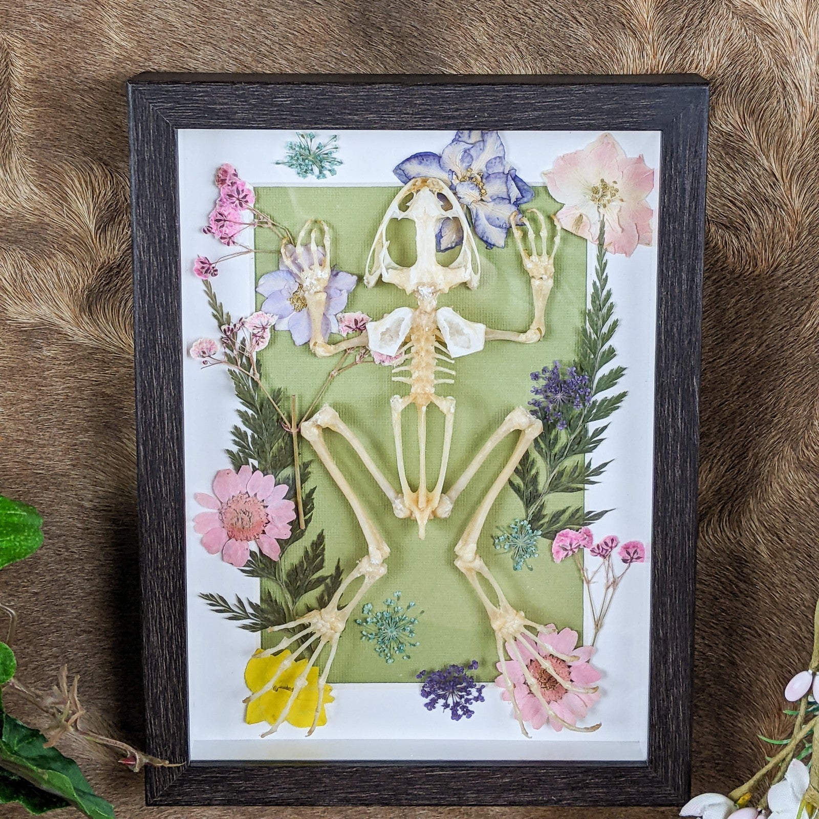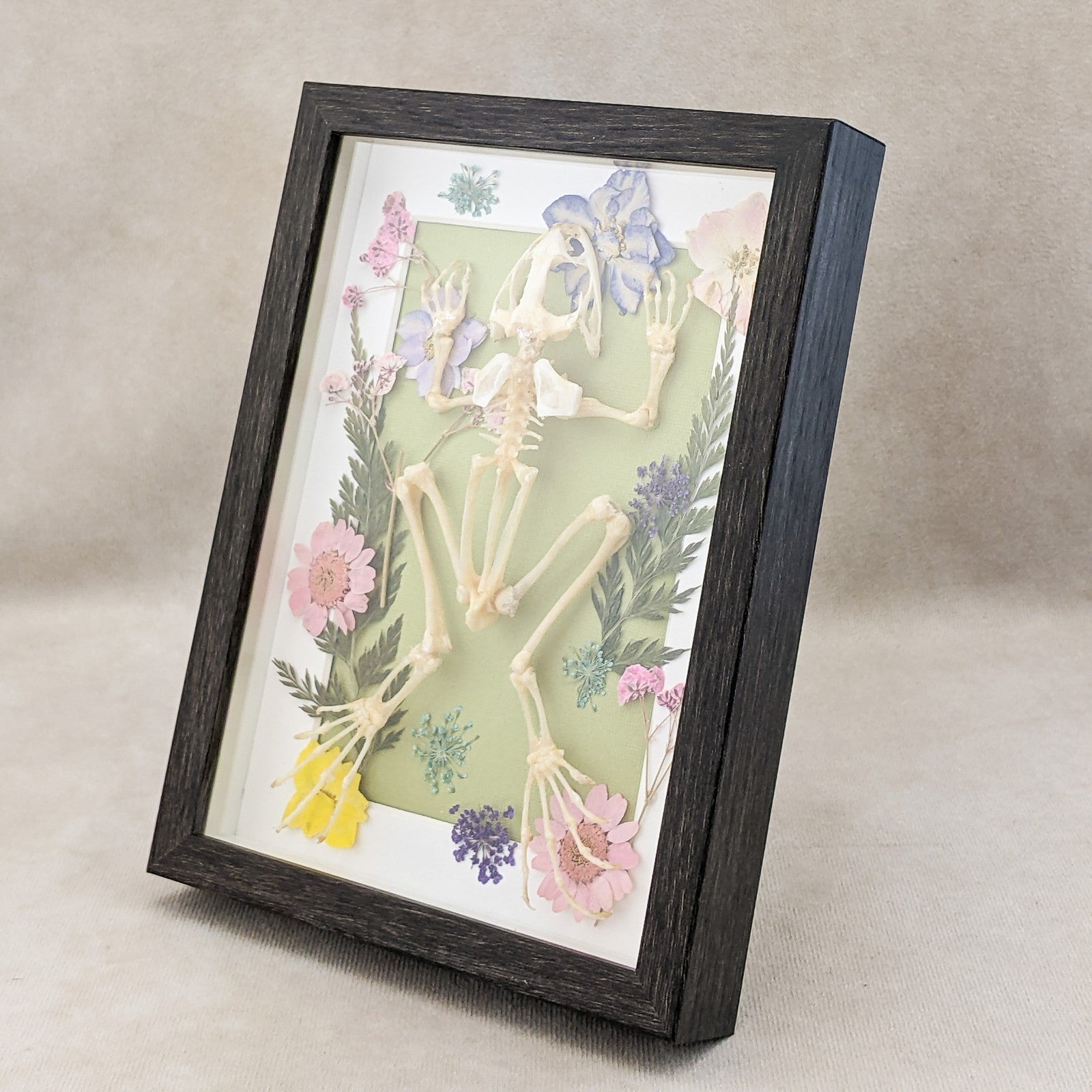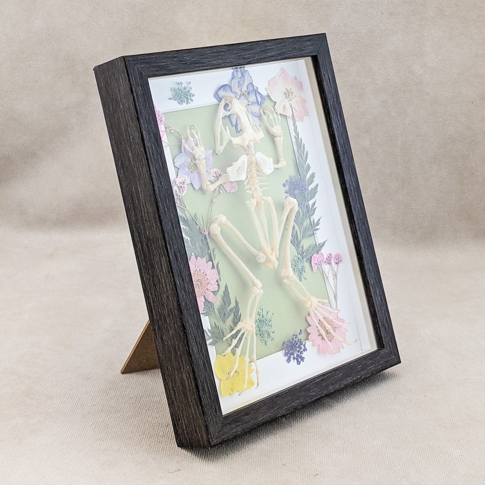 P42k #1.9 This is a nicely showcased frog skeleton in a brown frame Shadowbox decorated in spring theme with preserved flowers and foliage. This frame is approx. 7 3/4 x 5 3/4 x 1". He really shows up in the display and would look great in any collection! Your specimen will stay clean and safe for years to come in this display.