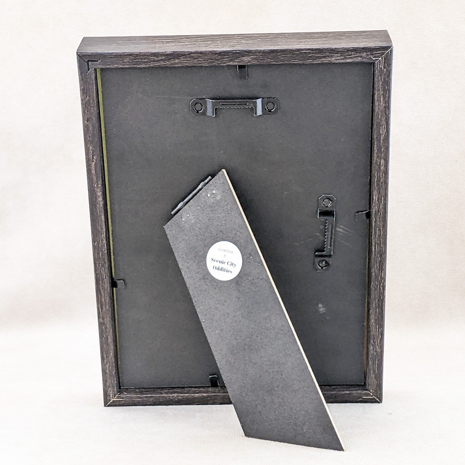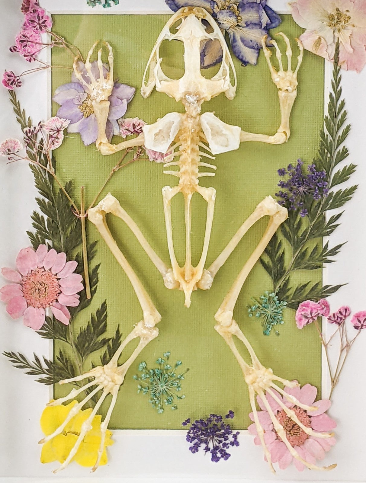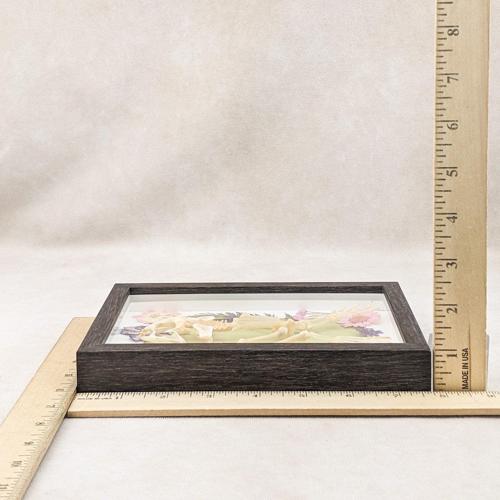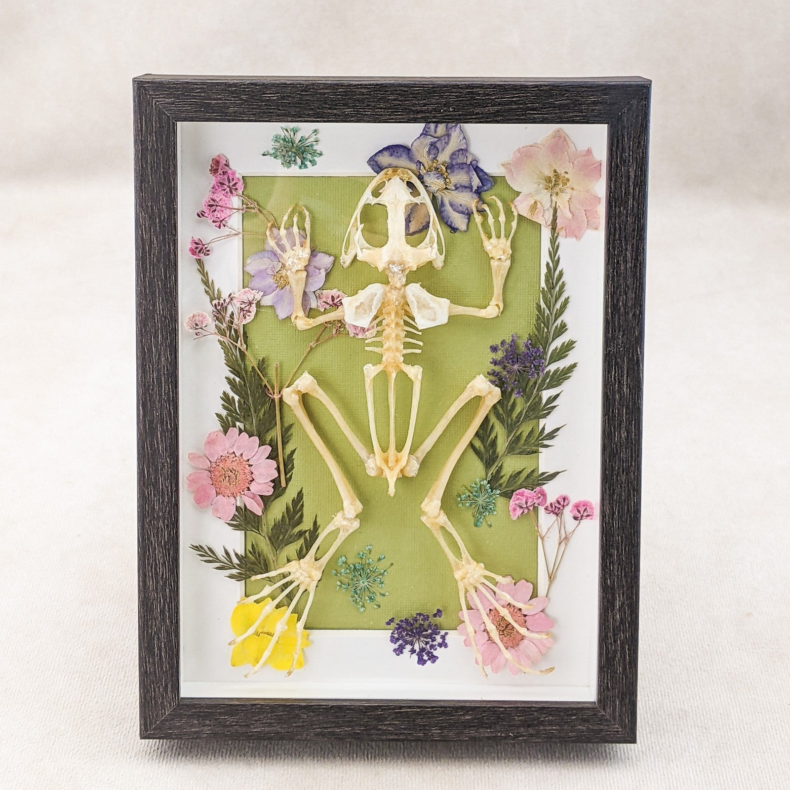 P42k #1.9 This is a nicely showcased frog skeleton in a brown frame Shadowbox decorated in spring theme with preserved flowers and foliage. This frame is approx. 7 3/4 x 5 3/4 x 1". He really shows up in the display and would look great in any collection! Your specimen will stay clean and safe for years to come in this display.