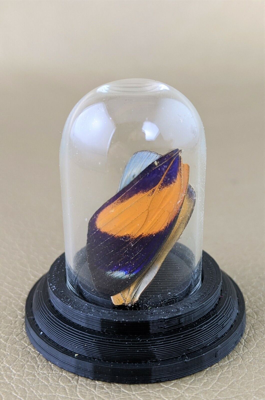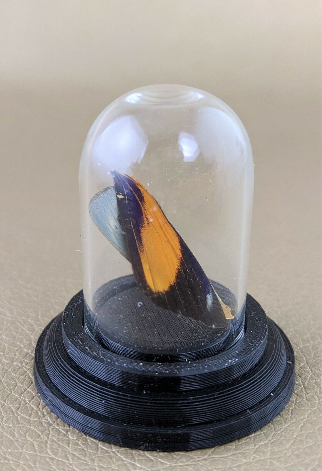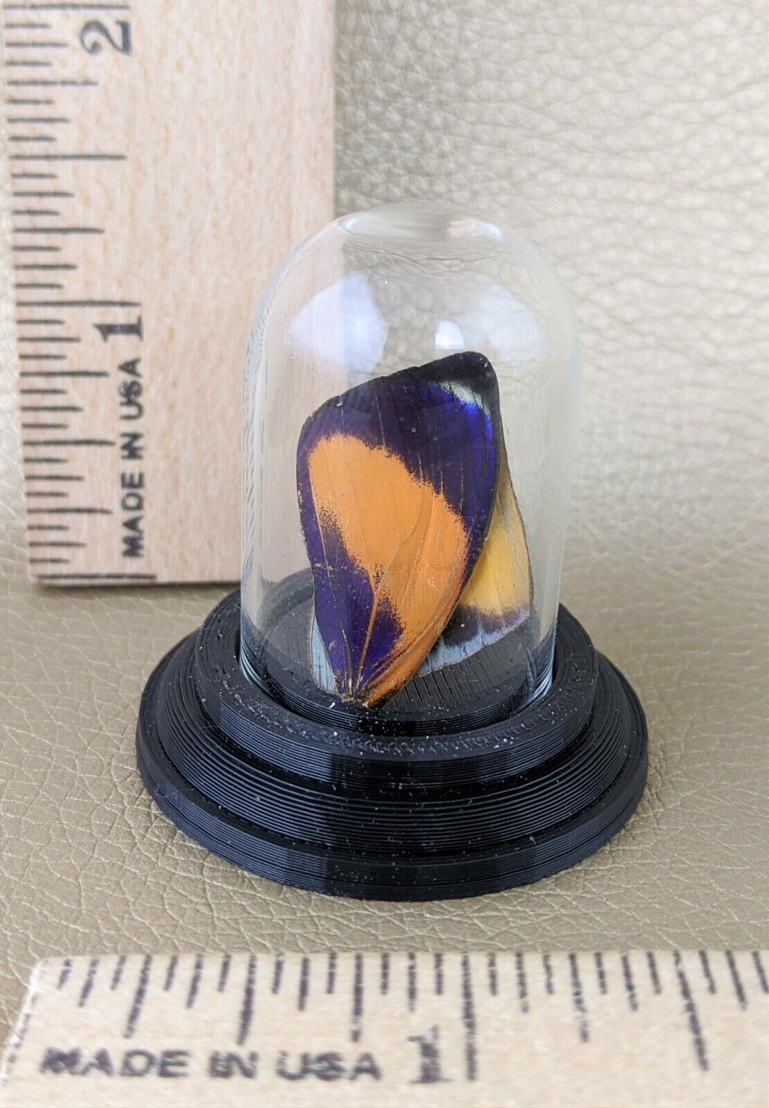 H27c This is a glass display dome that contains Fairy Wings! Children absolutely love these and will be your friend forever if you gift them a set of Fairy wings! Actually there are 2 blue/purple and orange wings. These wings are beautiful and would make a nice addition to any curiosity cabinet! The display is approx. 1 3/4 x 1 3/4" with a glass dome and black base and would look great in your collection.