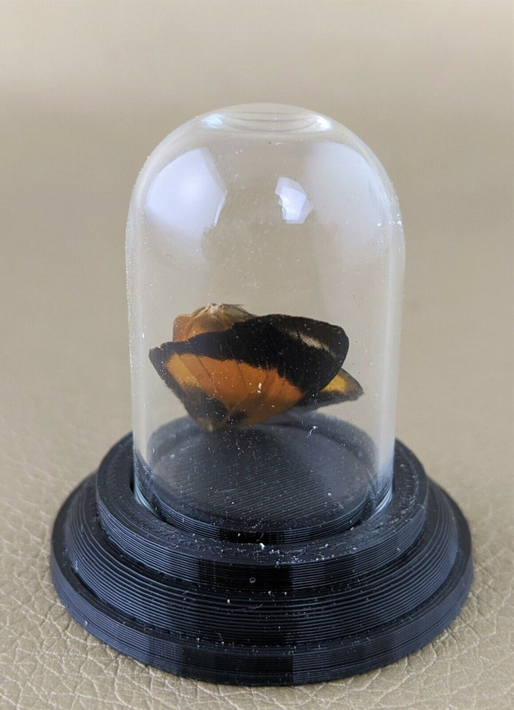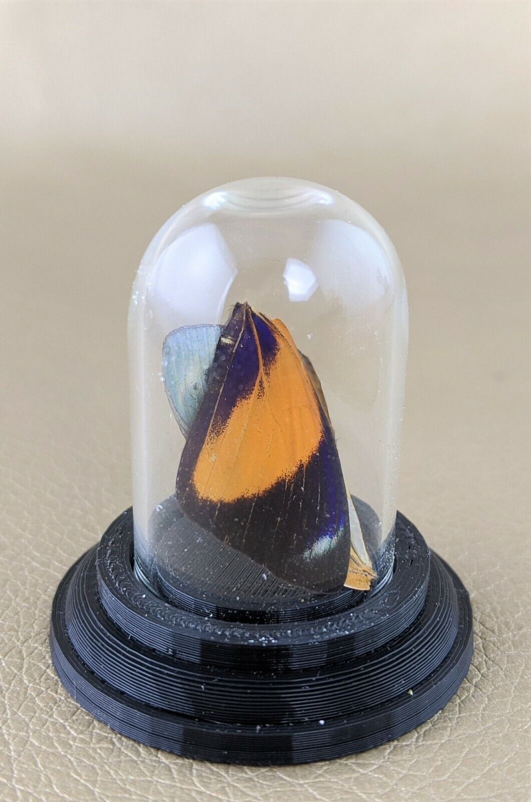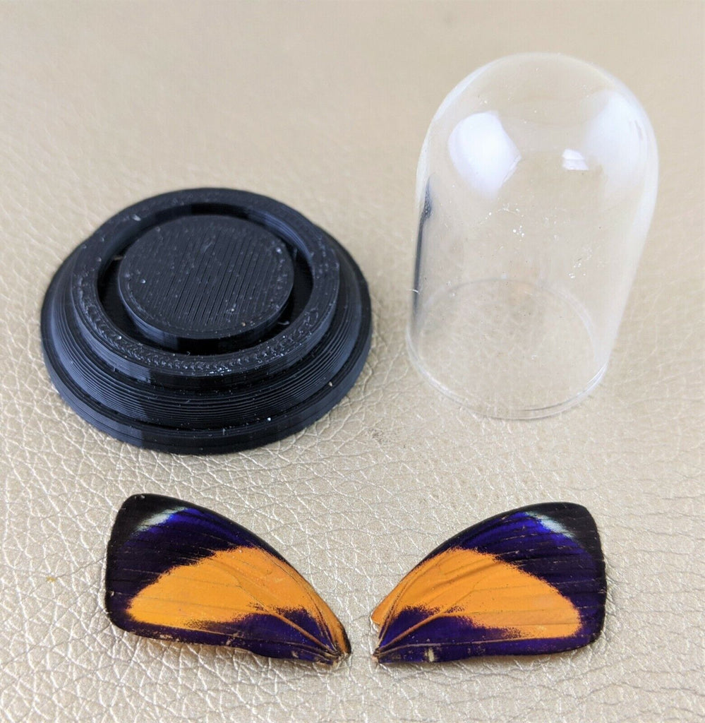 H27c This is a glass display dome that contains Fairy Wings! Children absolutely love these and will be your friend forever if you gift them a set of Fairy wings! Actually there are 2 blue/purple and orange wings. These wings are beautiful and would make a nice addition to any curiosity cabinet! The display is approx. 1 3/4 x 1 3/4" with a glass dome and black base and would look great in your collection.