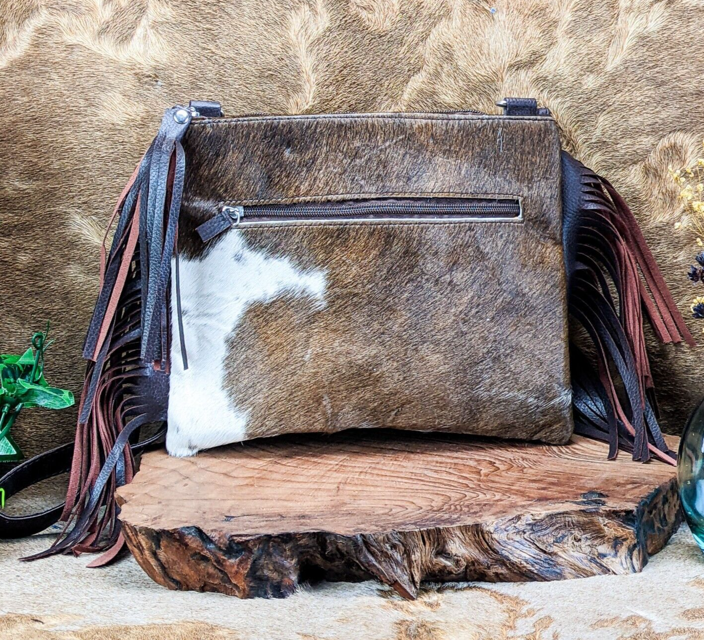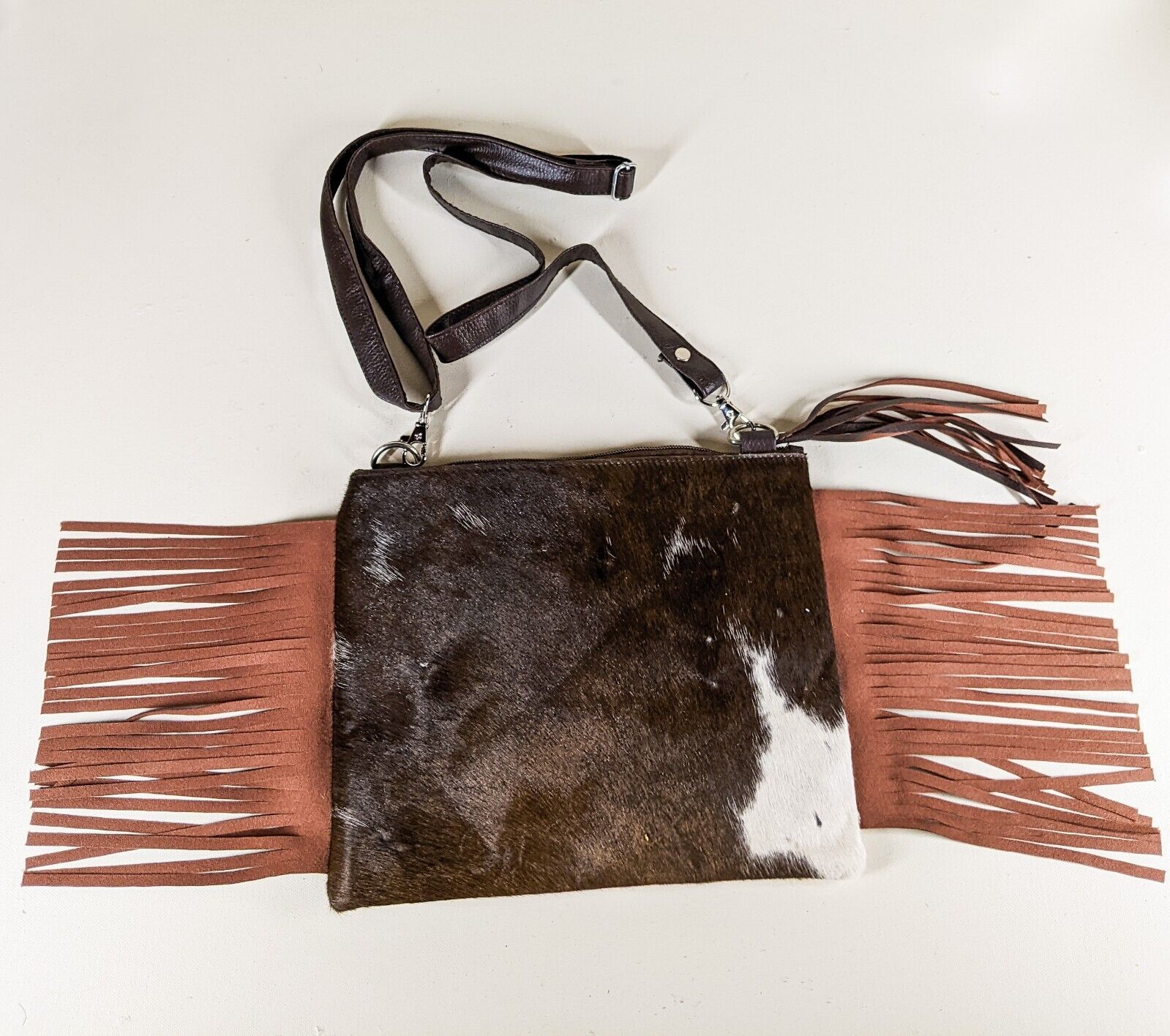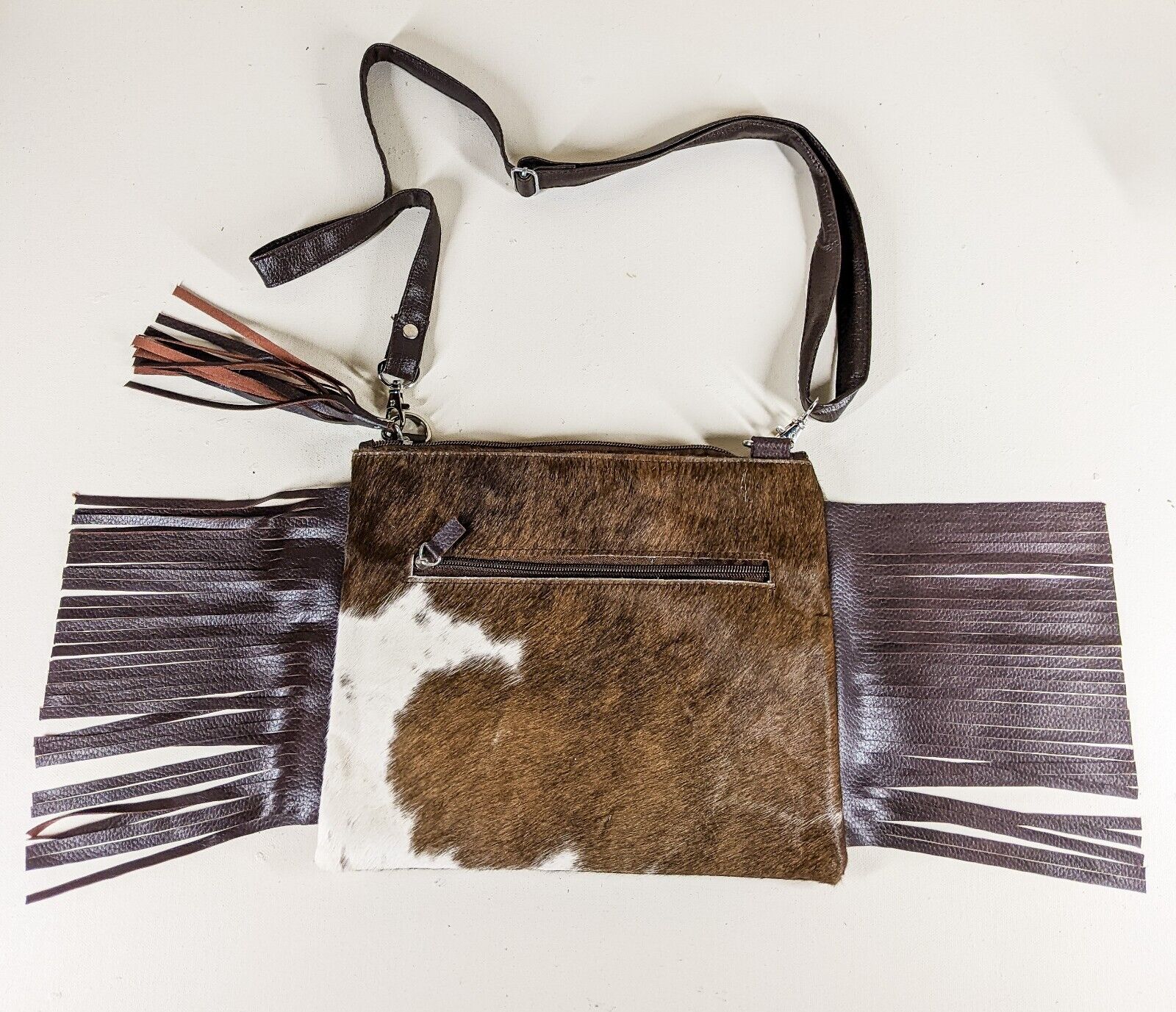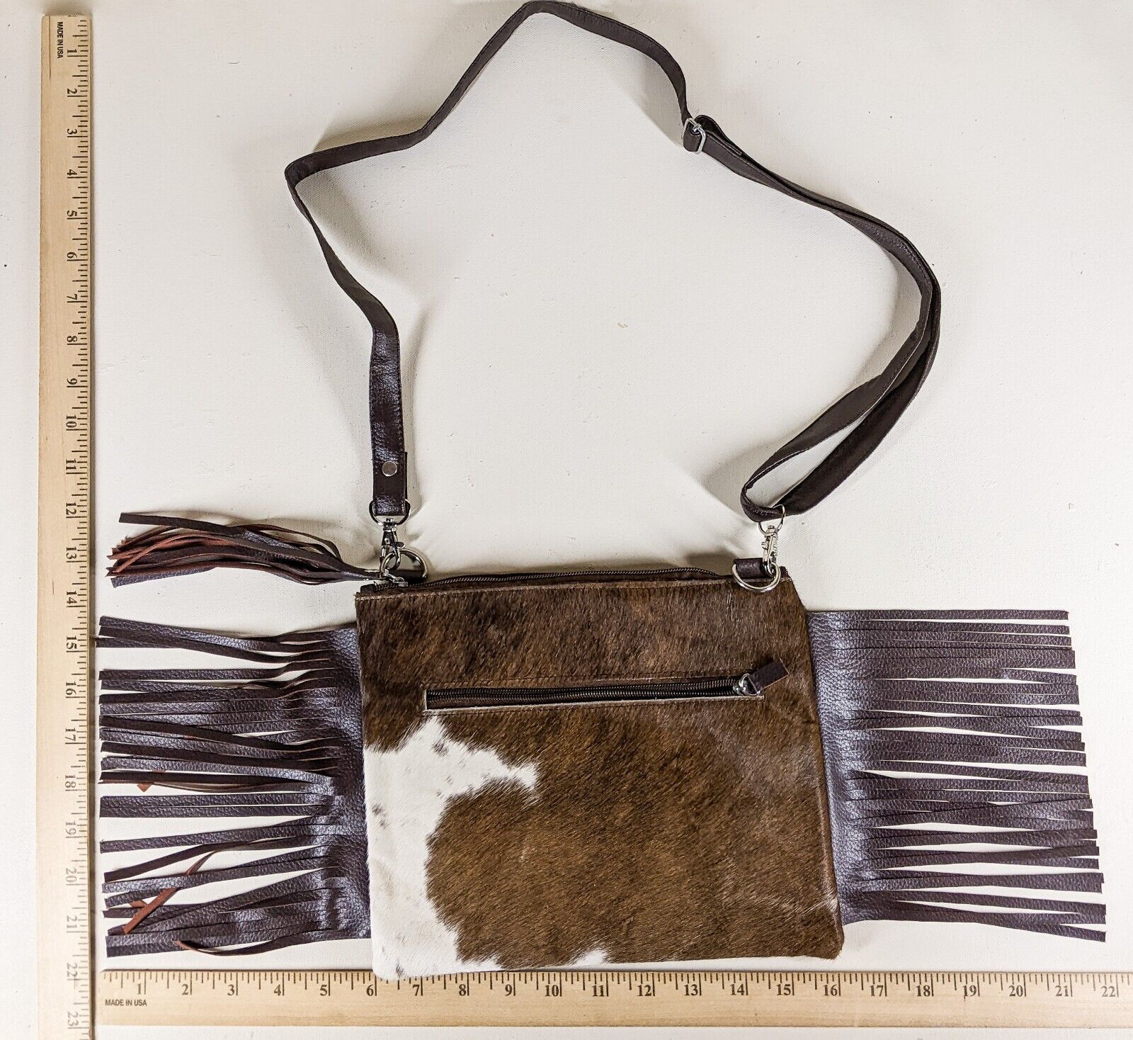 H45 #12 What a wonderful bag! This is sure to make you smile or make a wonderful gift! A crossbody purse cowhide purse that is 10 x 8" (not counting the leather fringe sides) with a zip top closure with a 5" leather tassel. There is a zip closure on the outside of the bag as well as inside the bag. The strap is 50" and adjustable and the interior is a nice fabric. This comes with a gift bag as well.