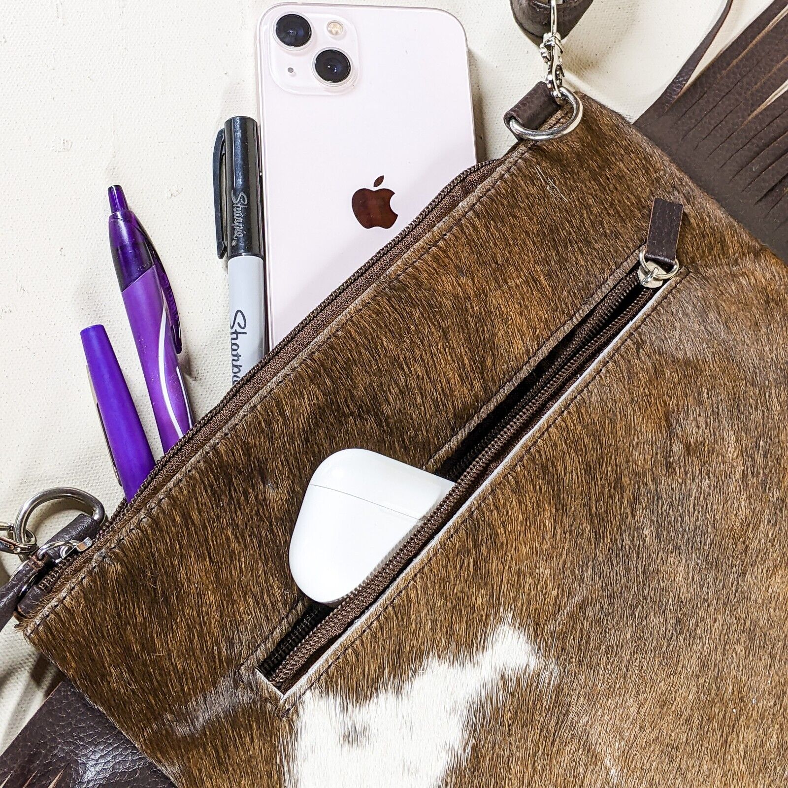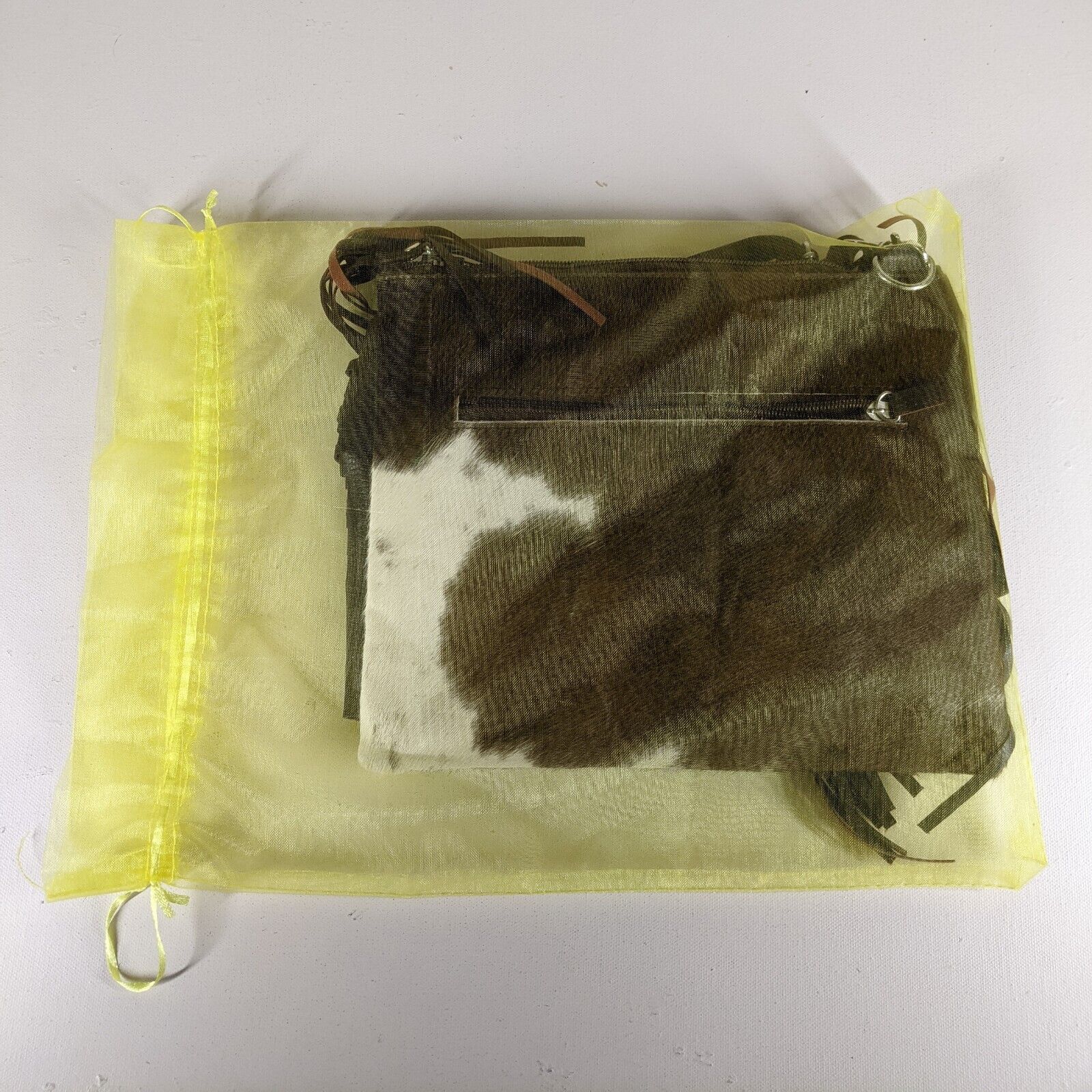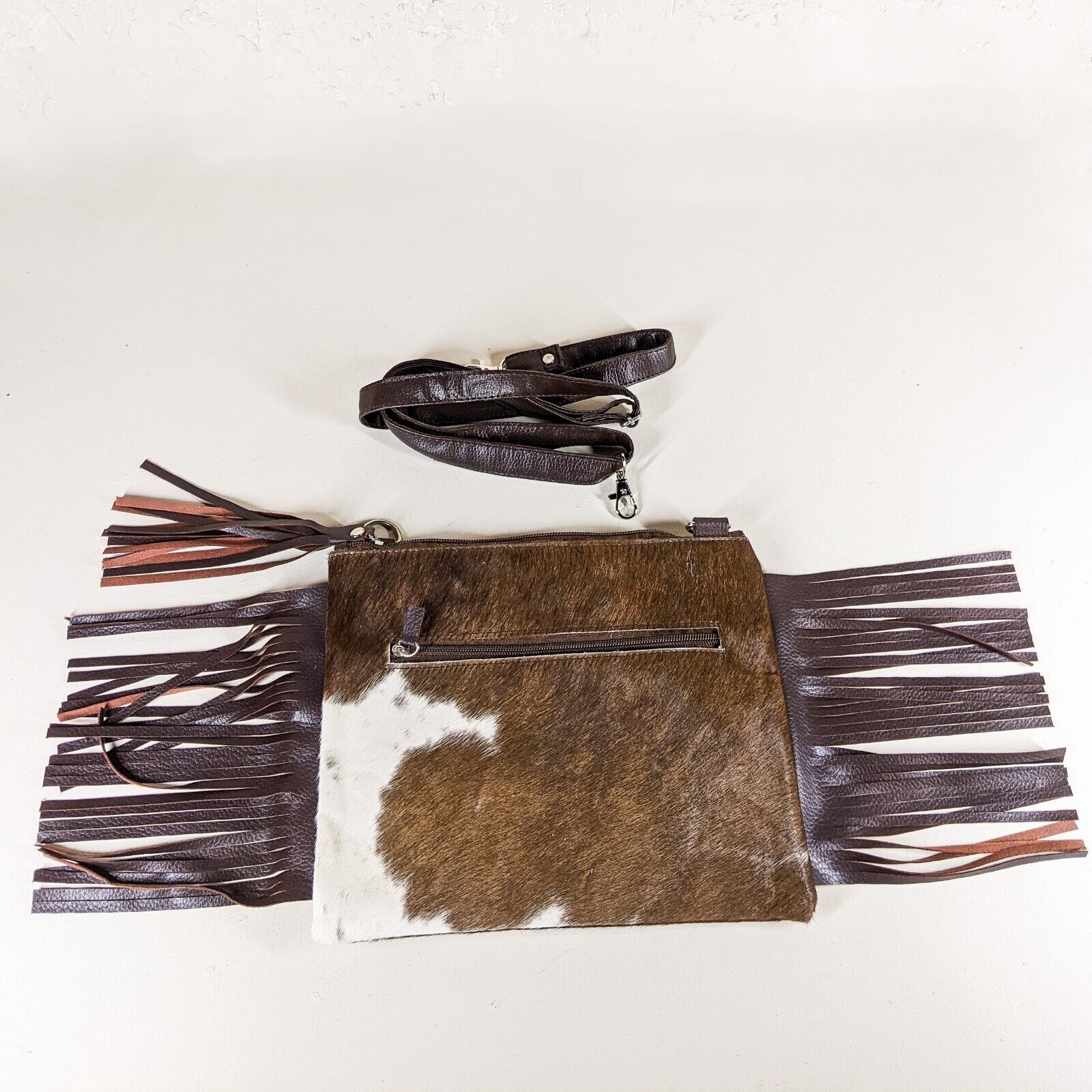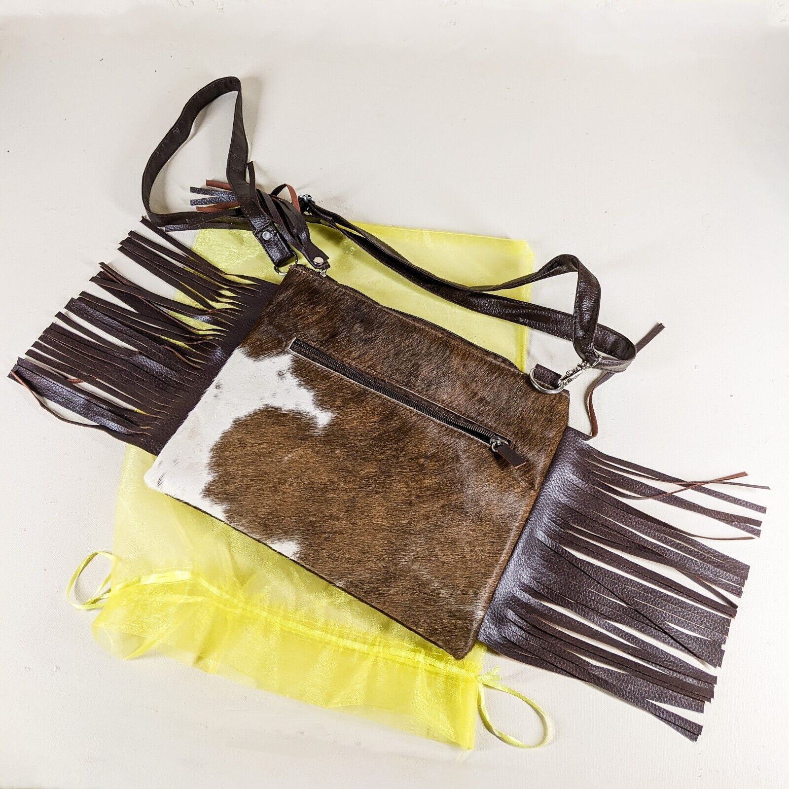 H45 #12 What a wonderful bag! This is sure to make you smile or make a wonderful gift! A crossbody purse cowhide purse that is 10 x 8" (not counting the leather fringe sides) with a zip top closure with a 5" leather tassel. There is a zip closure on the outside of the bag as well as inside the bag. The strap is 50" and adjustable and the interior is a nice fabric. This comes with a gift bag as well.