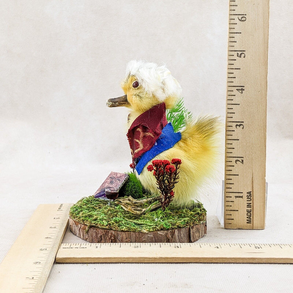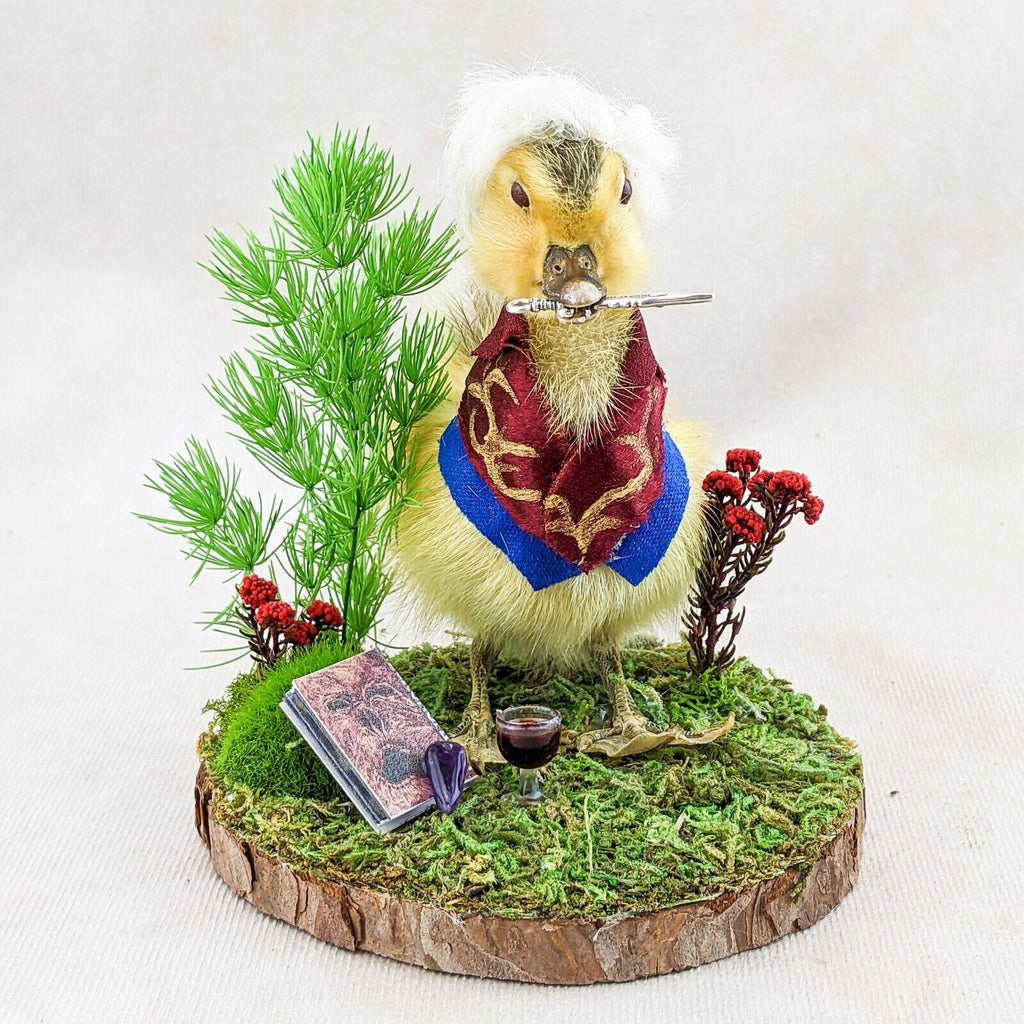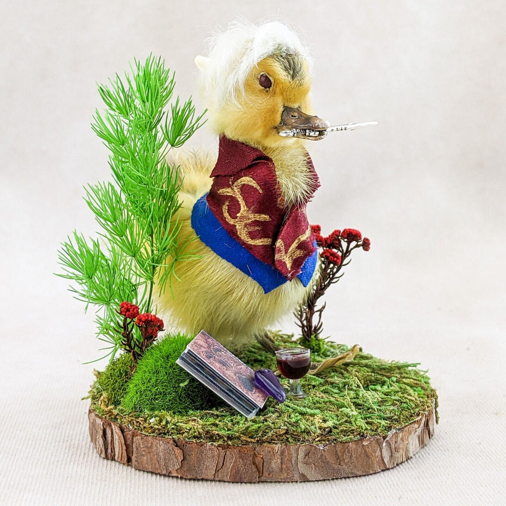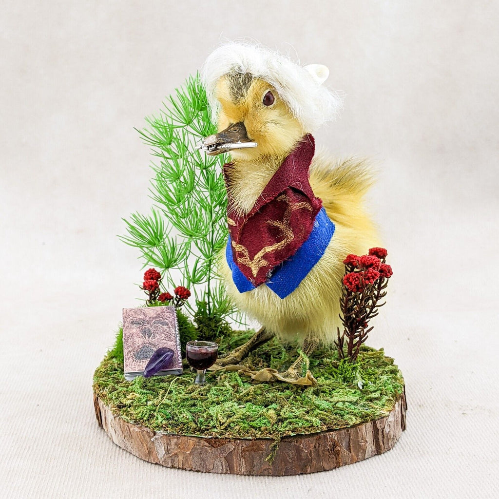 "Ehello Dahling!" This adorable little duckling, "Neil" is dressed up in his classic fantasy rogue outfit with his trusty dagger in his beak and the best hair in camp! He's displayed on a rustic wood base with his Necronomicon, amethyst piece, and of course a glass of red wine. Too cute! Don't pass on this charming little guy - it'll bite you! Trust us! If you're a collector of video game or D&D this is the perfect piece for you. Display is approx: 4 1/4" x 4" x 4"