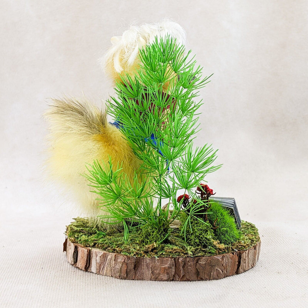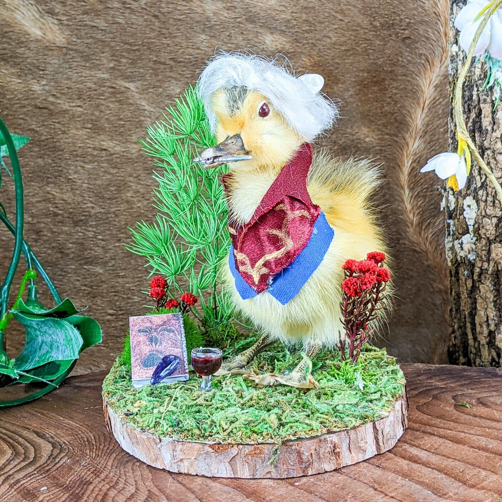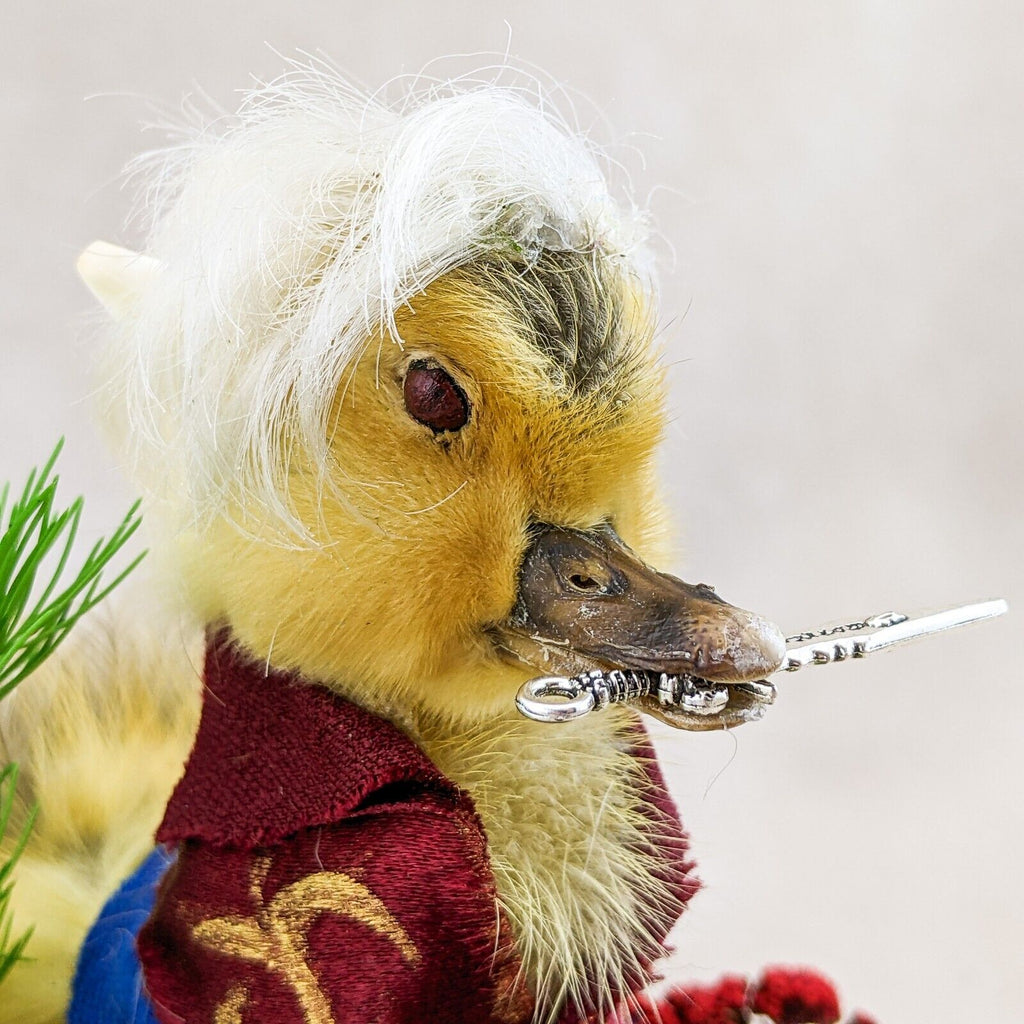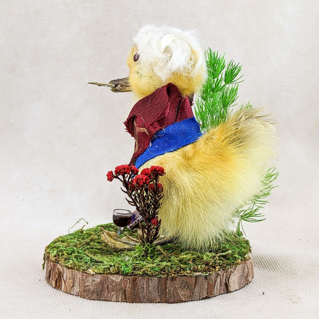 "Ehello Dahling!" This adorable little duckling, "Neil" is dressed up in his classic fantasy rogue outfit with his trusty dagger in his beak and the best hair in camp! He's displayed on a rustic wood base with his Necronomicon, amethyst piece, and of course a glass of red wine. Too cute! Don't pass on this charming little guy - it'll bite you! Trust us! If you're a collector of video game or D&D this is the perfect piece for you. Display is approx: 4 1/4" x 4" x 4"