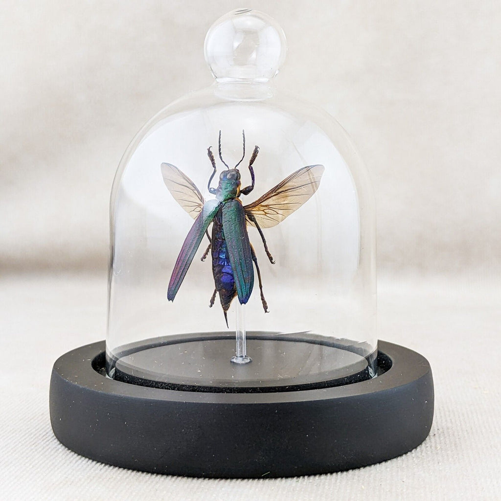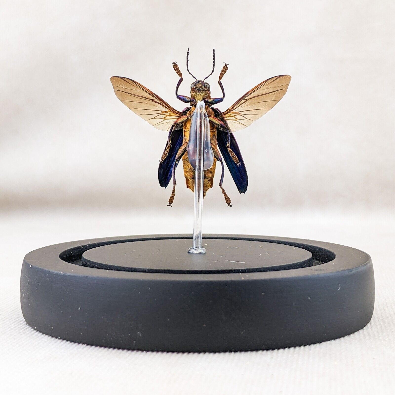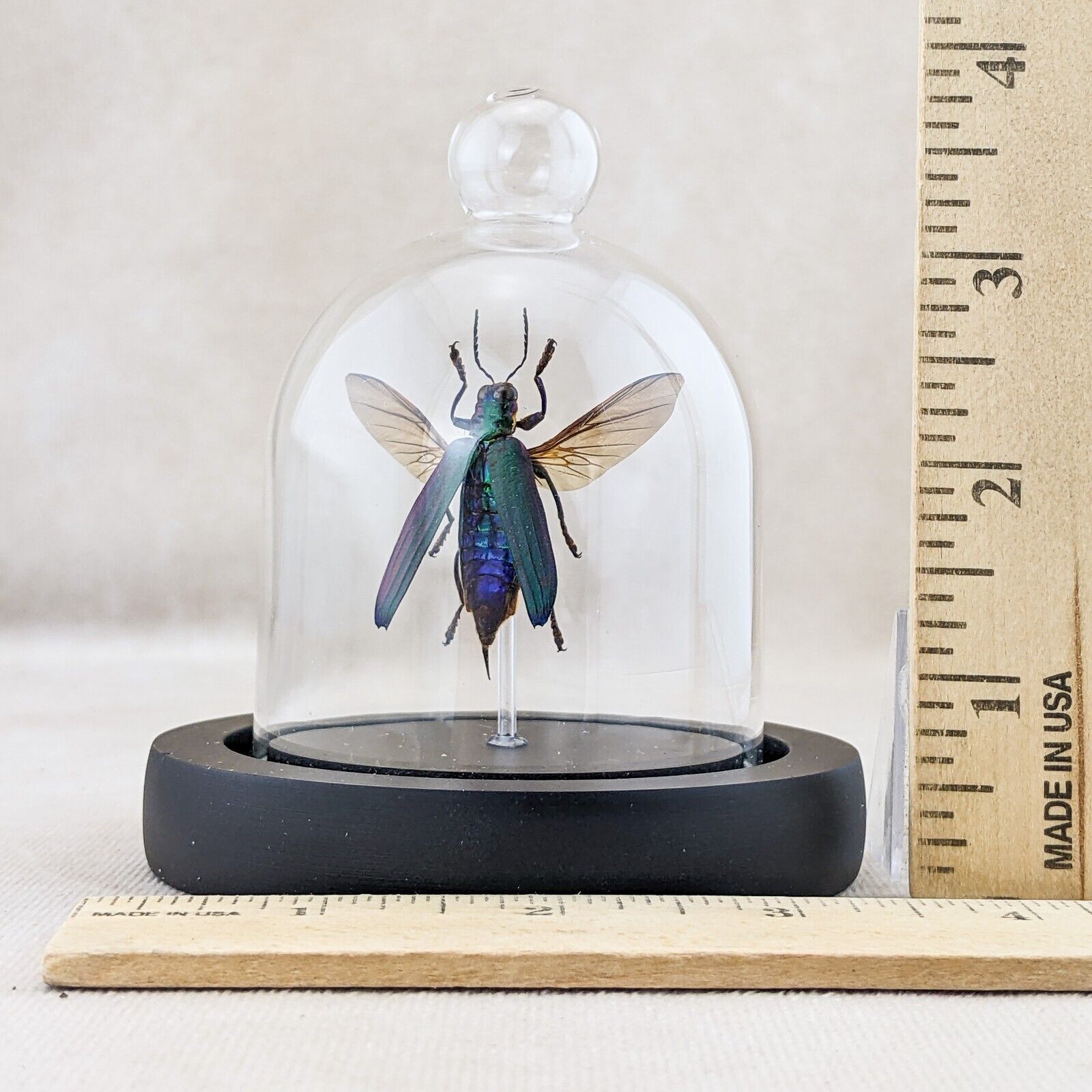 j42  bx25 #4   This beautiful beetle is nicely displayed with his wings spread in a glass dome display with a wood base!  This display is approx 4 x 3 1/2".  This would be a great addition to any collection or for educational purposes.