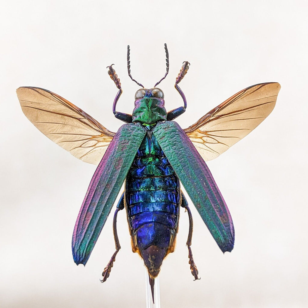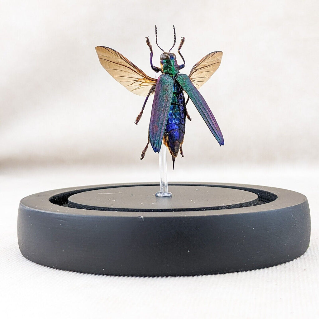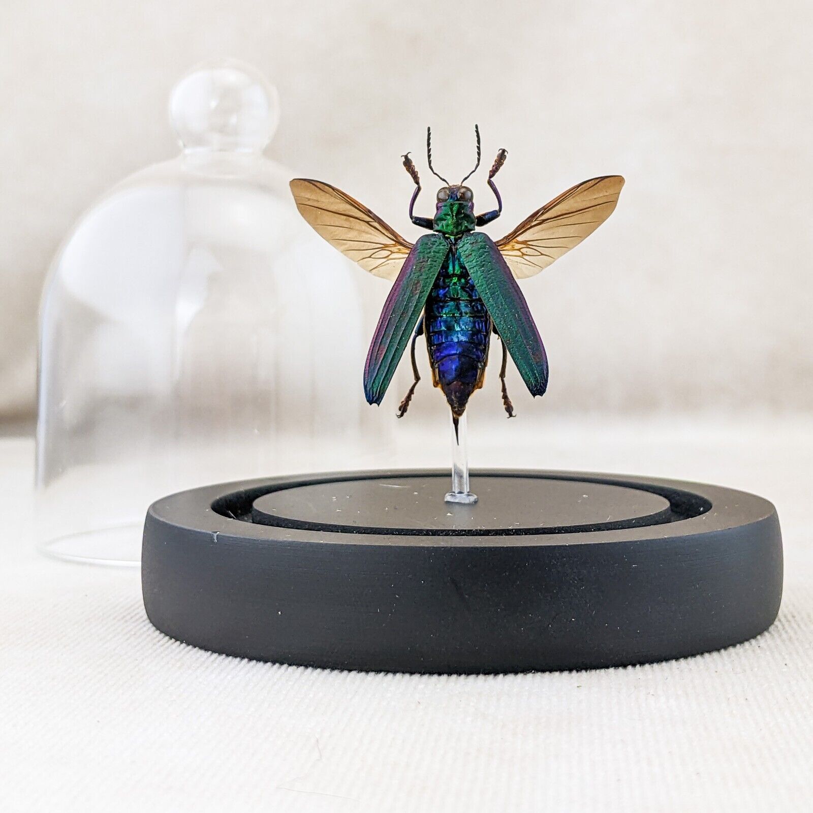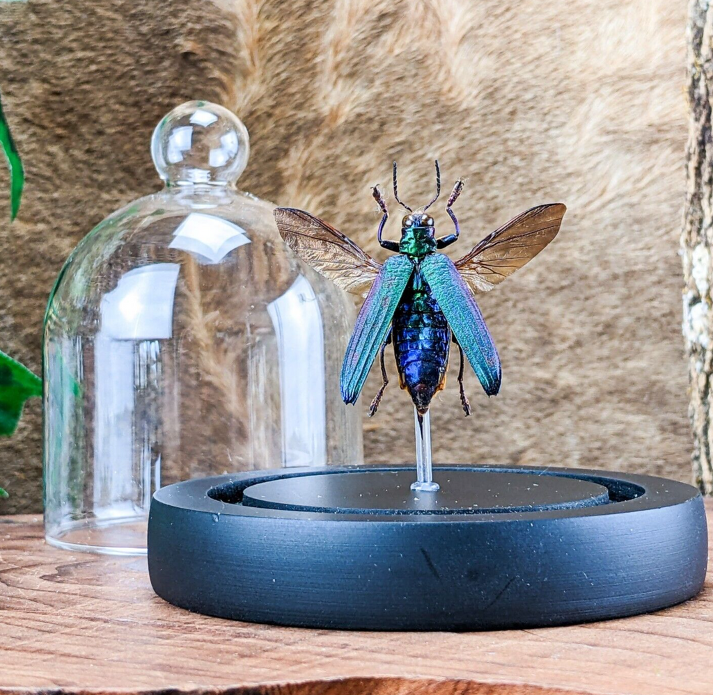 j42  bx25 #4   This beautiful beetle is nicely displayed with his wings spread in a glass dome display with a wood base!  This display is approx 4 x 3 1/2".  This would be a great addition to any collection or for educational purposes.