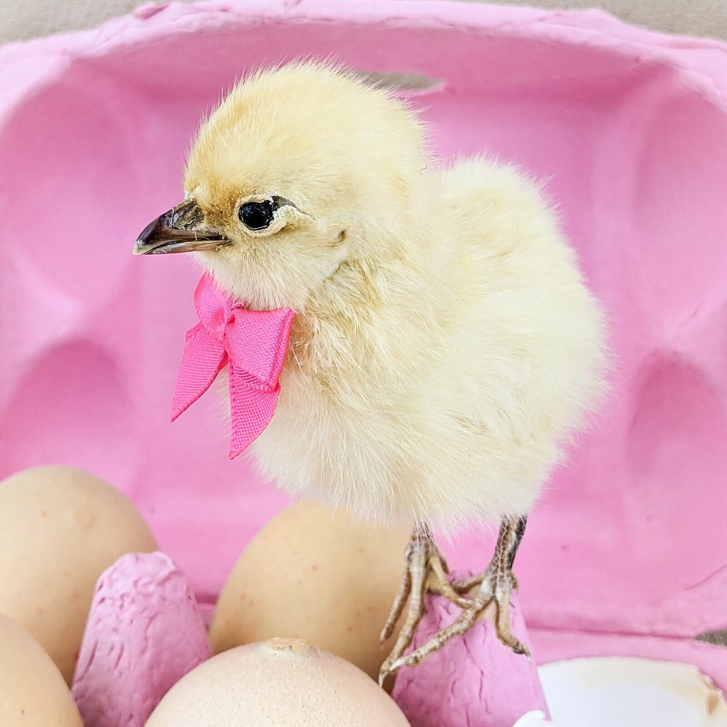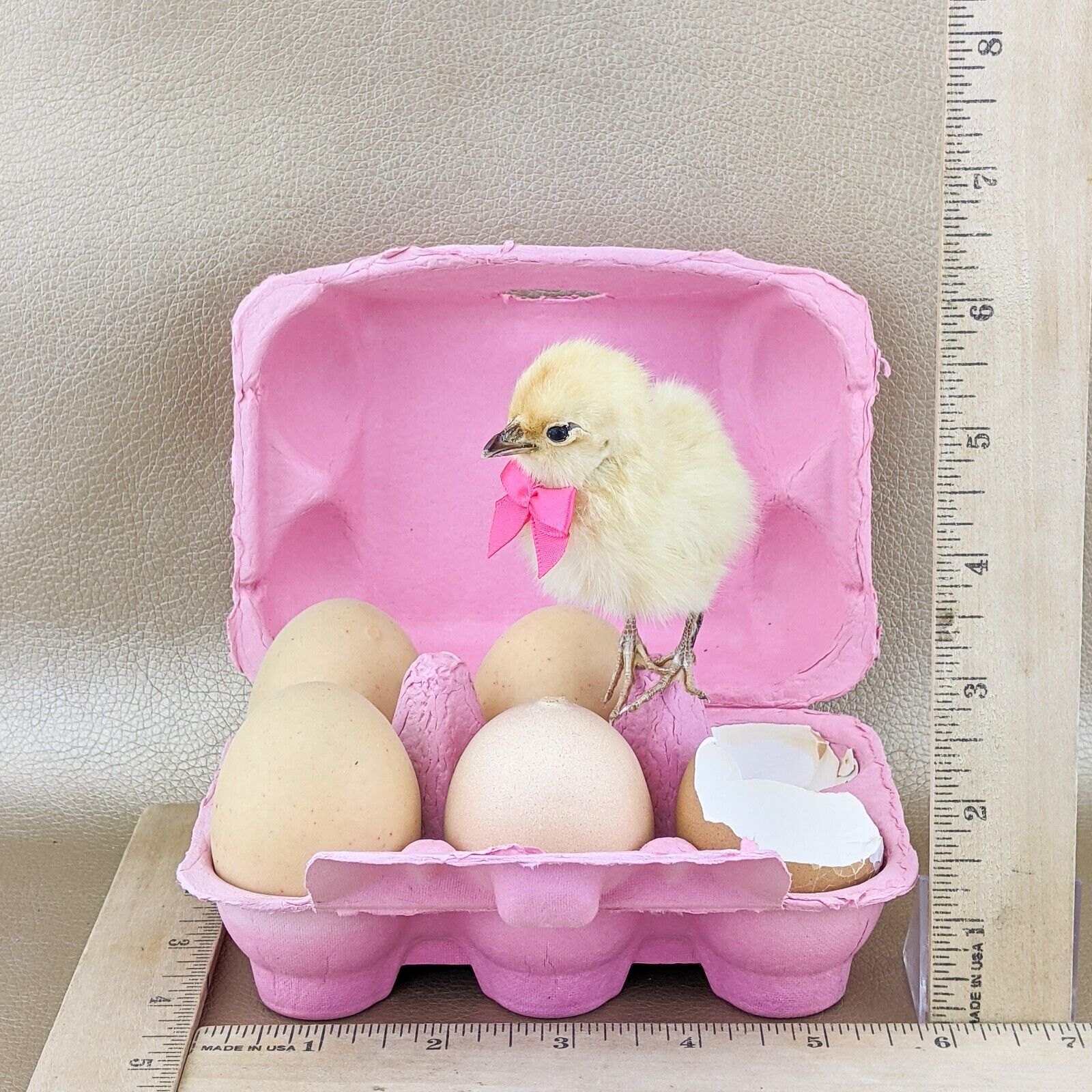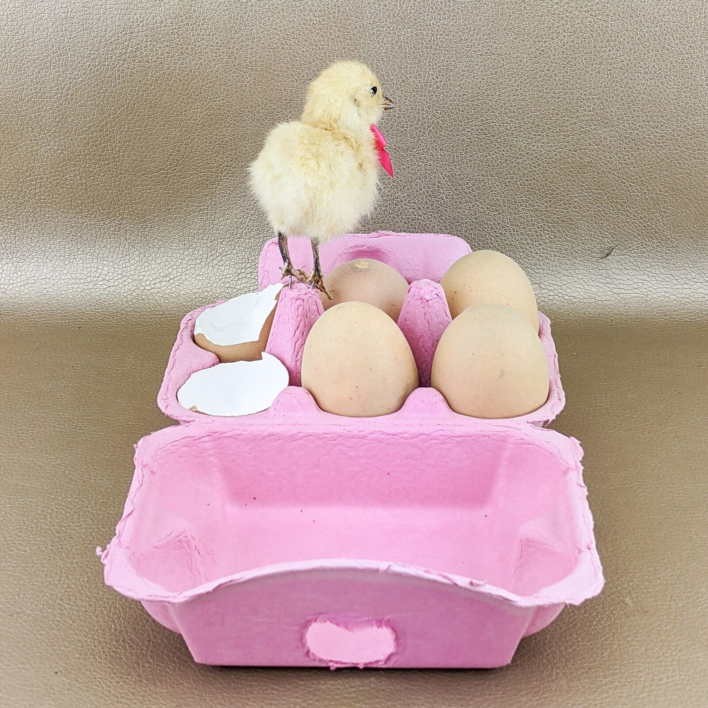 K8A  #6  This is an adorable display that will stand out in any kitchen or country décor!! It is a cardboard egg crate (half dozen) with 4 faux eggs. One real egg has opened and there is a Yellow taxidermy chick! This little guy is just adorable!  Overall dimensions are 6" x 8", so it will fit perfectly on a cabinet or in any nook needing that "something special"!  Nothing is "attached" to crate so you can move the eggs and chick around this display to your liking!  There are wires on the chicks feet so you may stand him up or just take a scissors and cut them off if you do not need them.  He can be put in several positions.