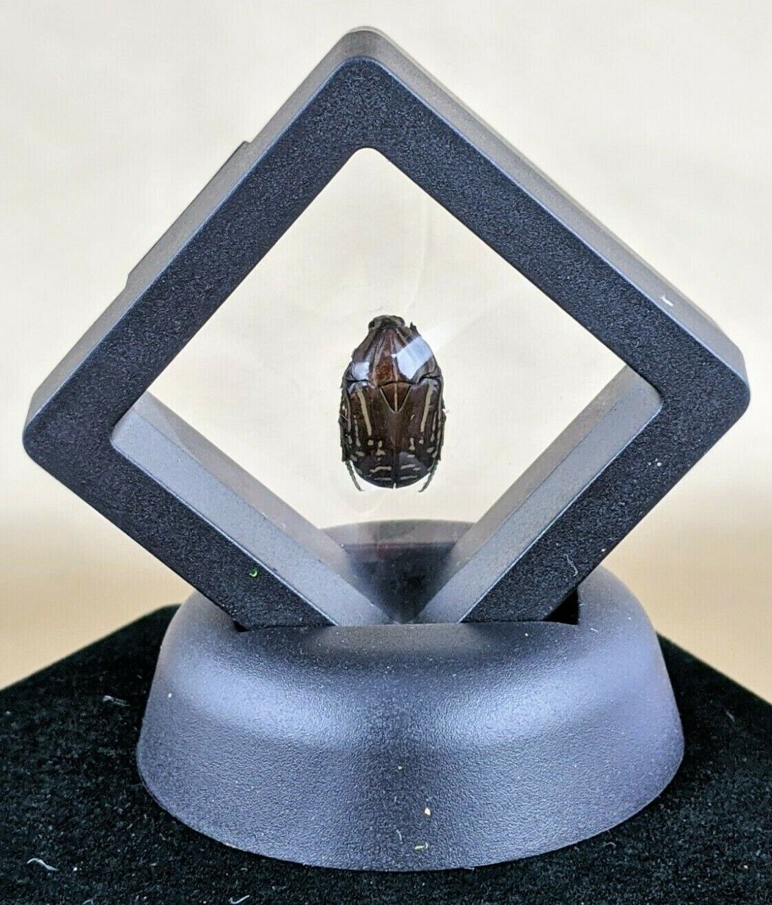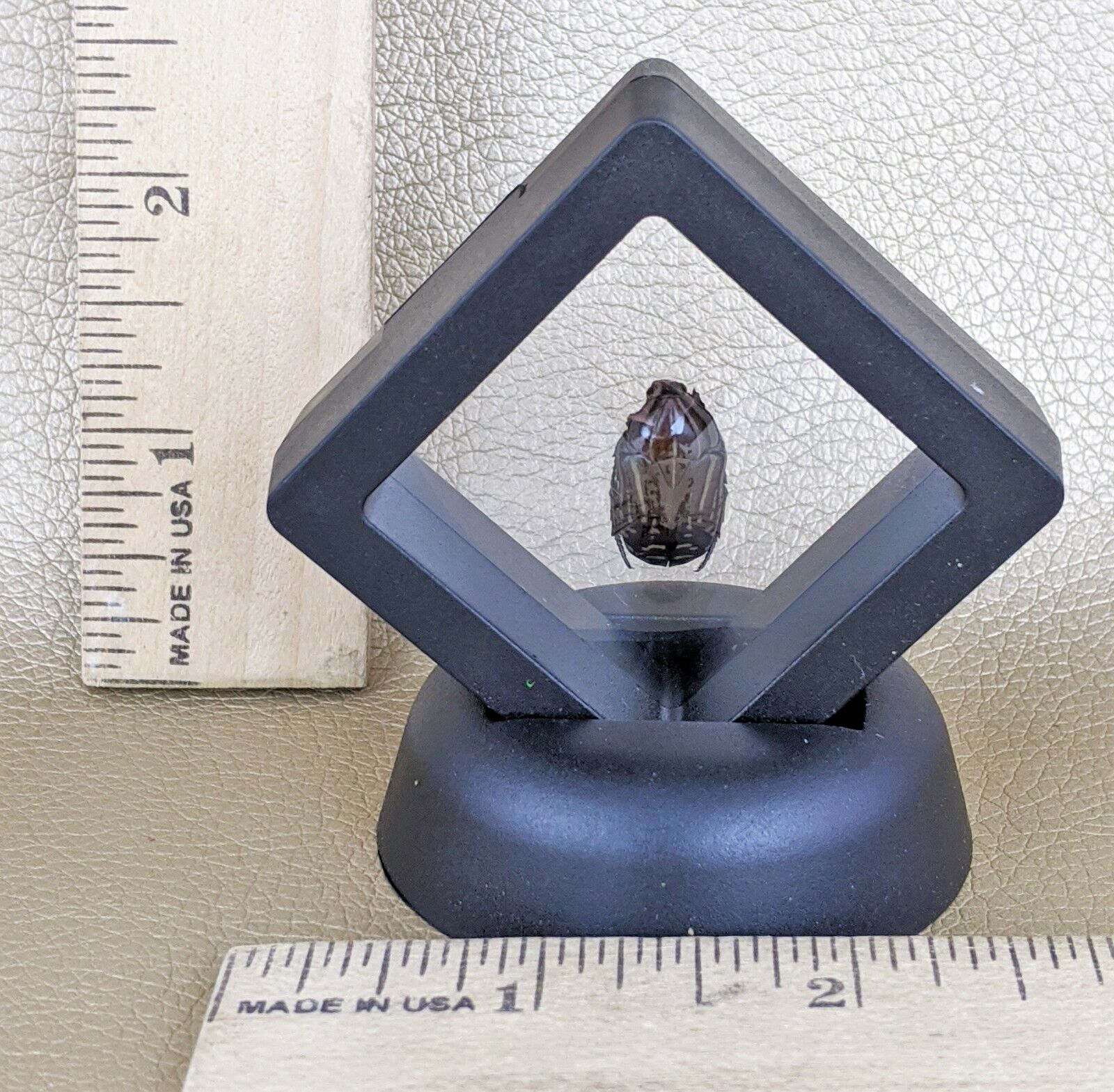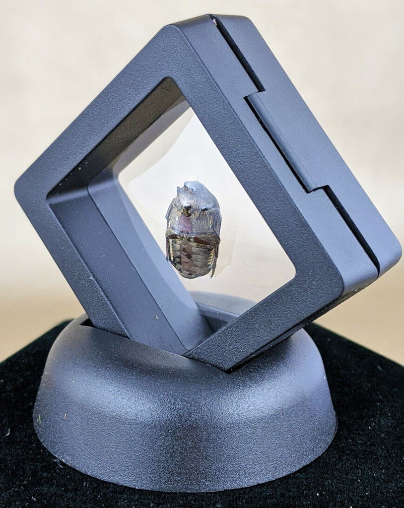 This is a real preserved brown scarab beetle that has been placed in a black "floating" frame display! The entire display is approximately 3" x 3" and is sure to stand out in your bug collection!