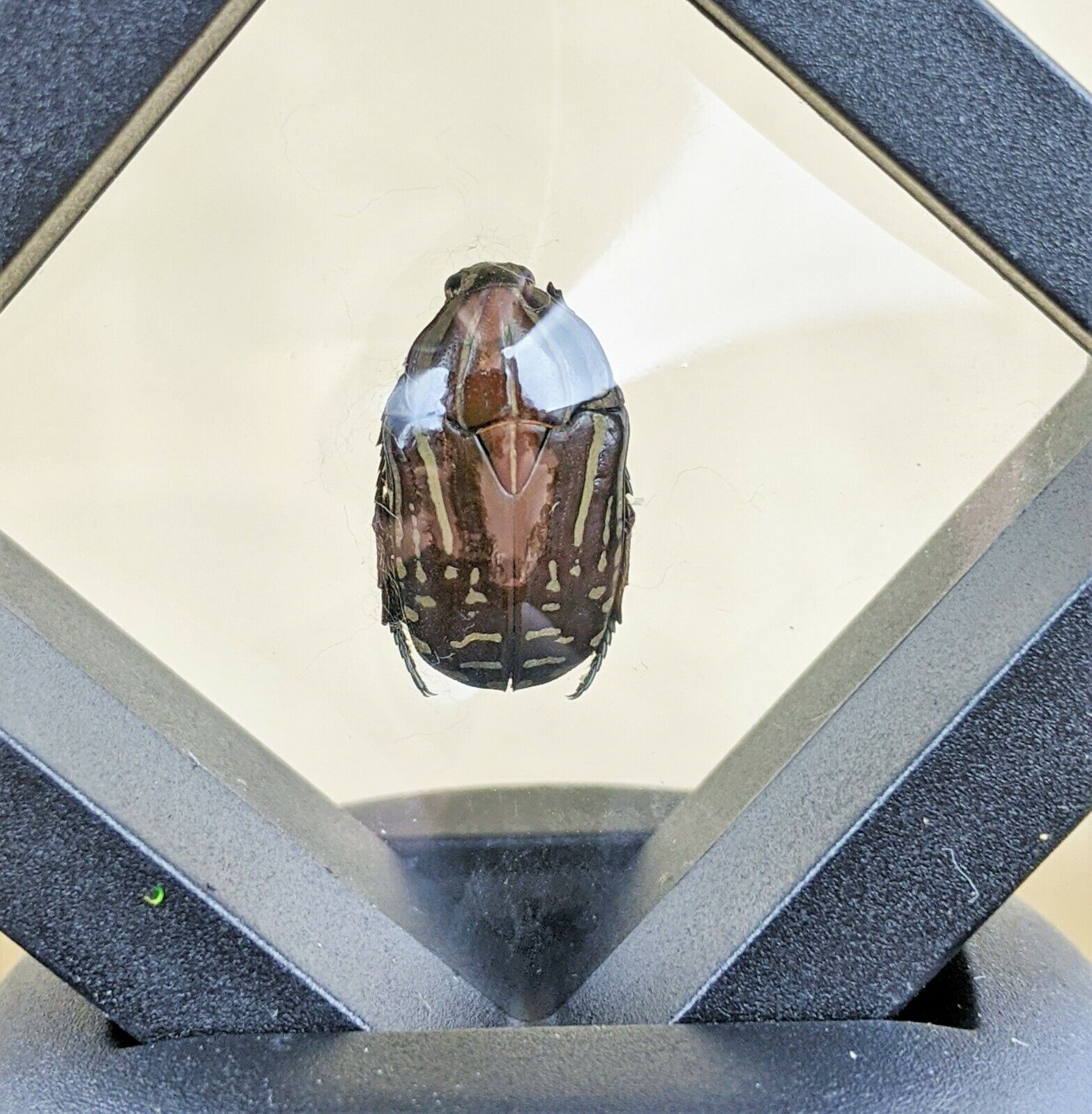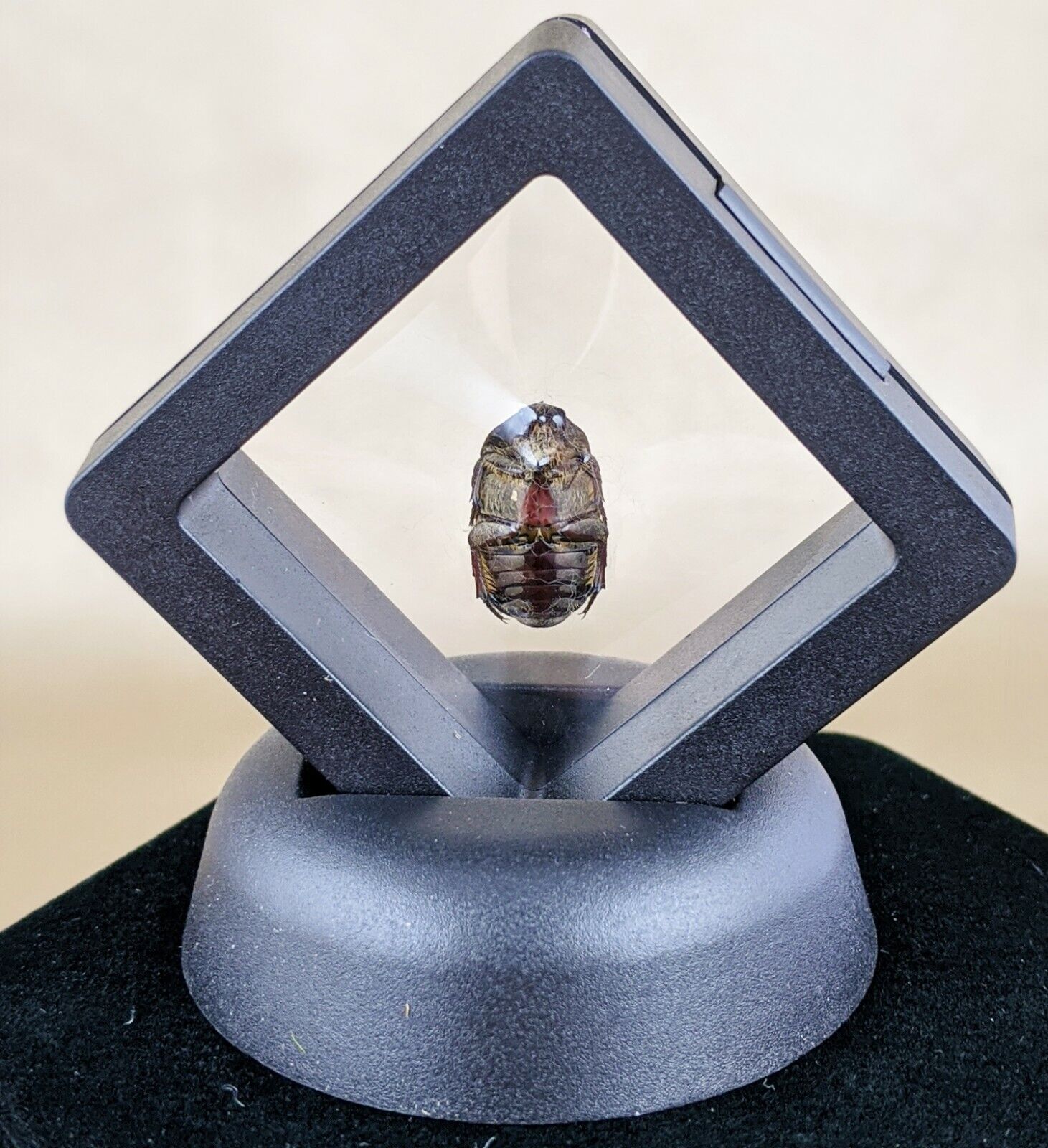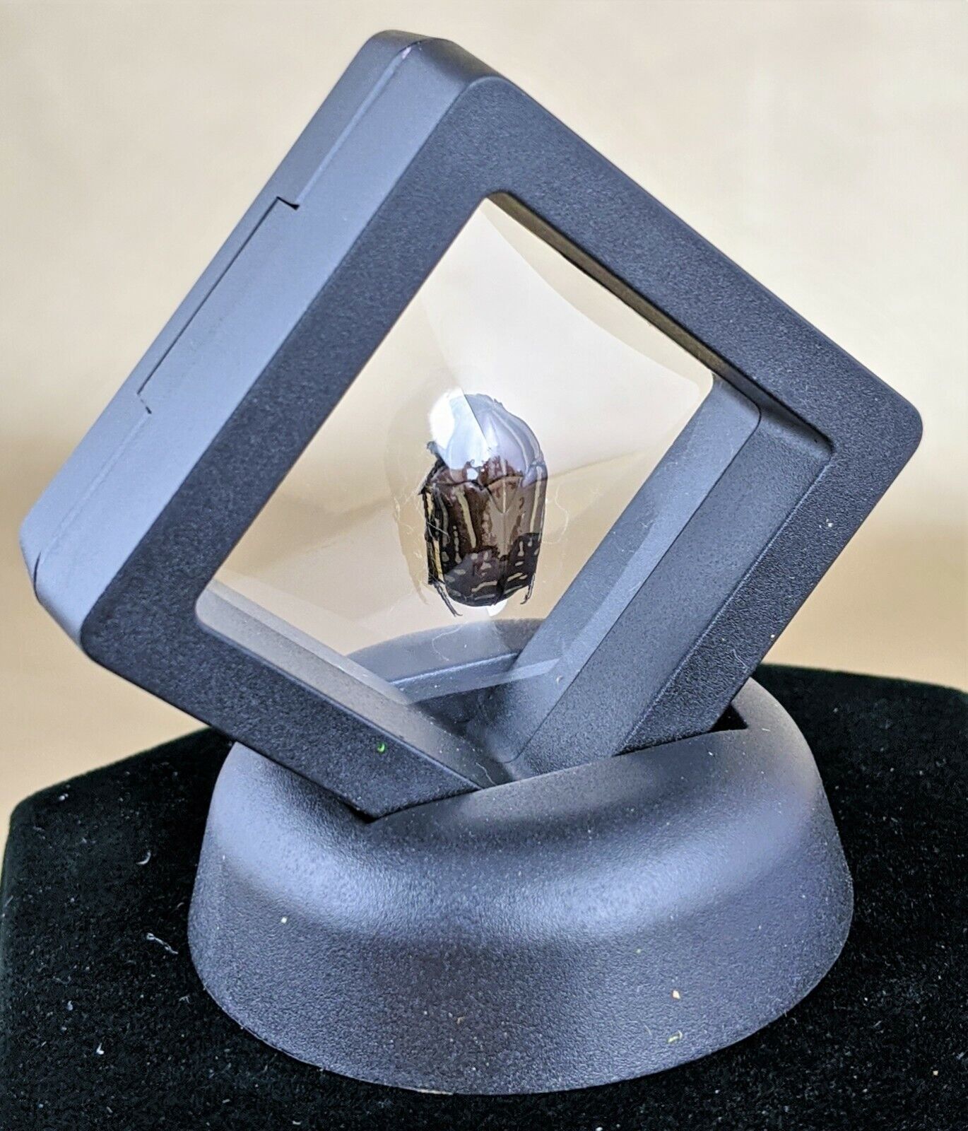 This is a real preserved brown scarab beetle that has been placed in a black "floating" frame display! The entire display is approximately 3" x 3" and is sure to stand out in your bug collection!