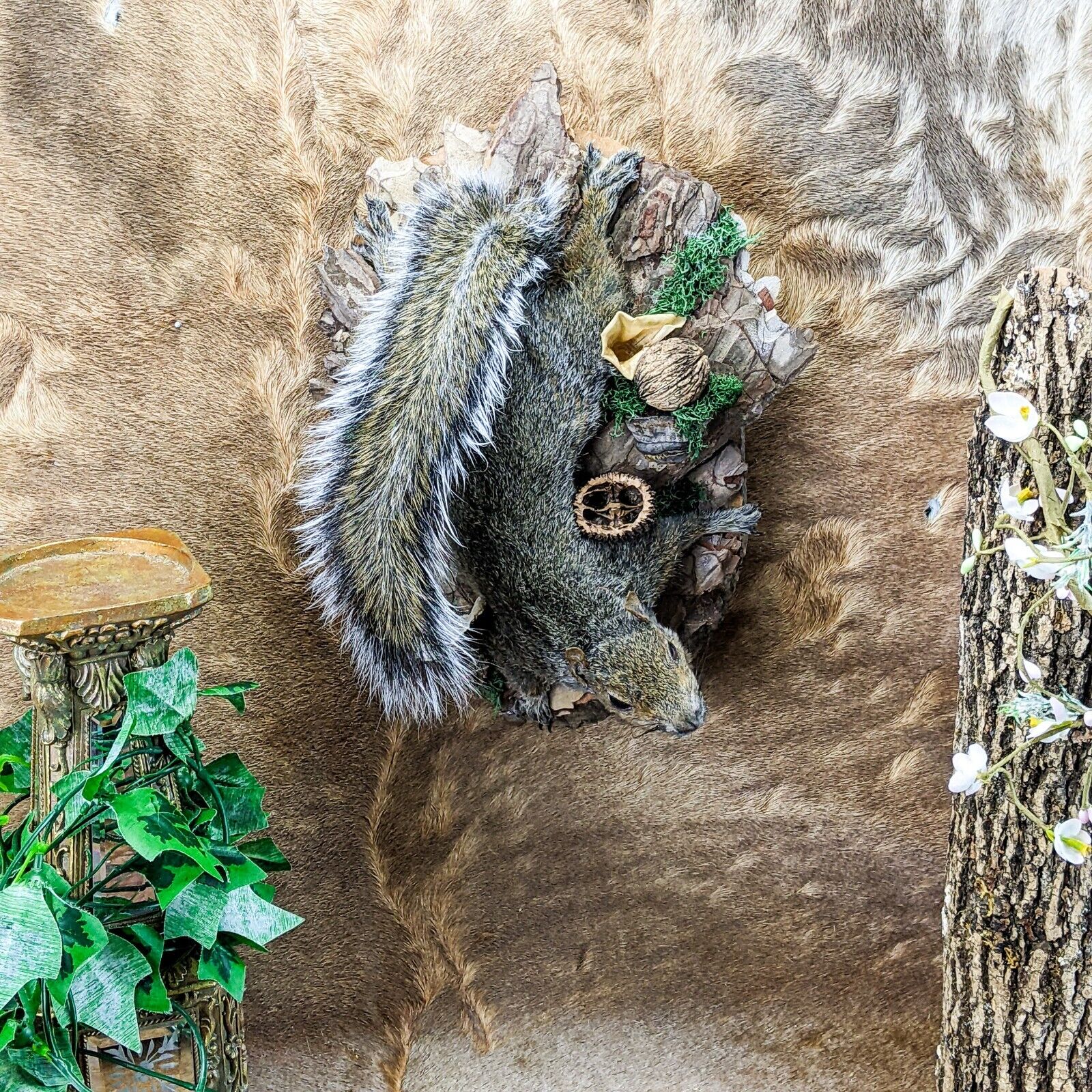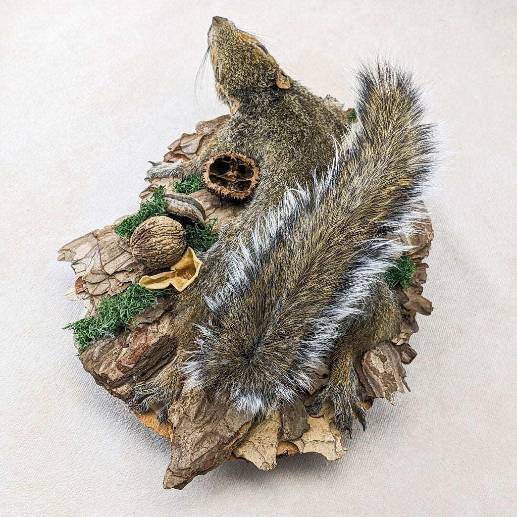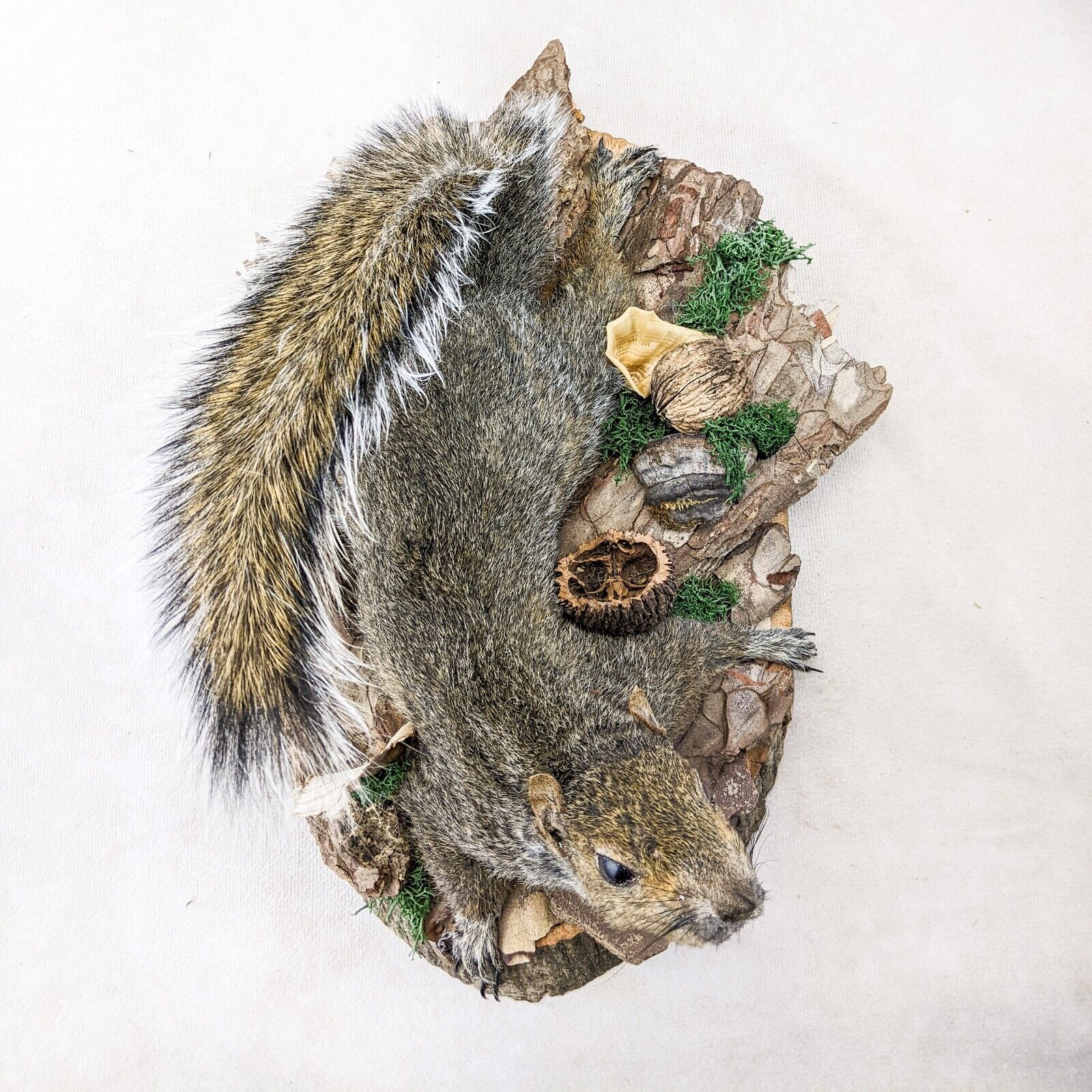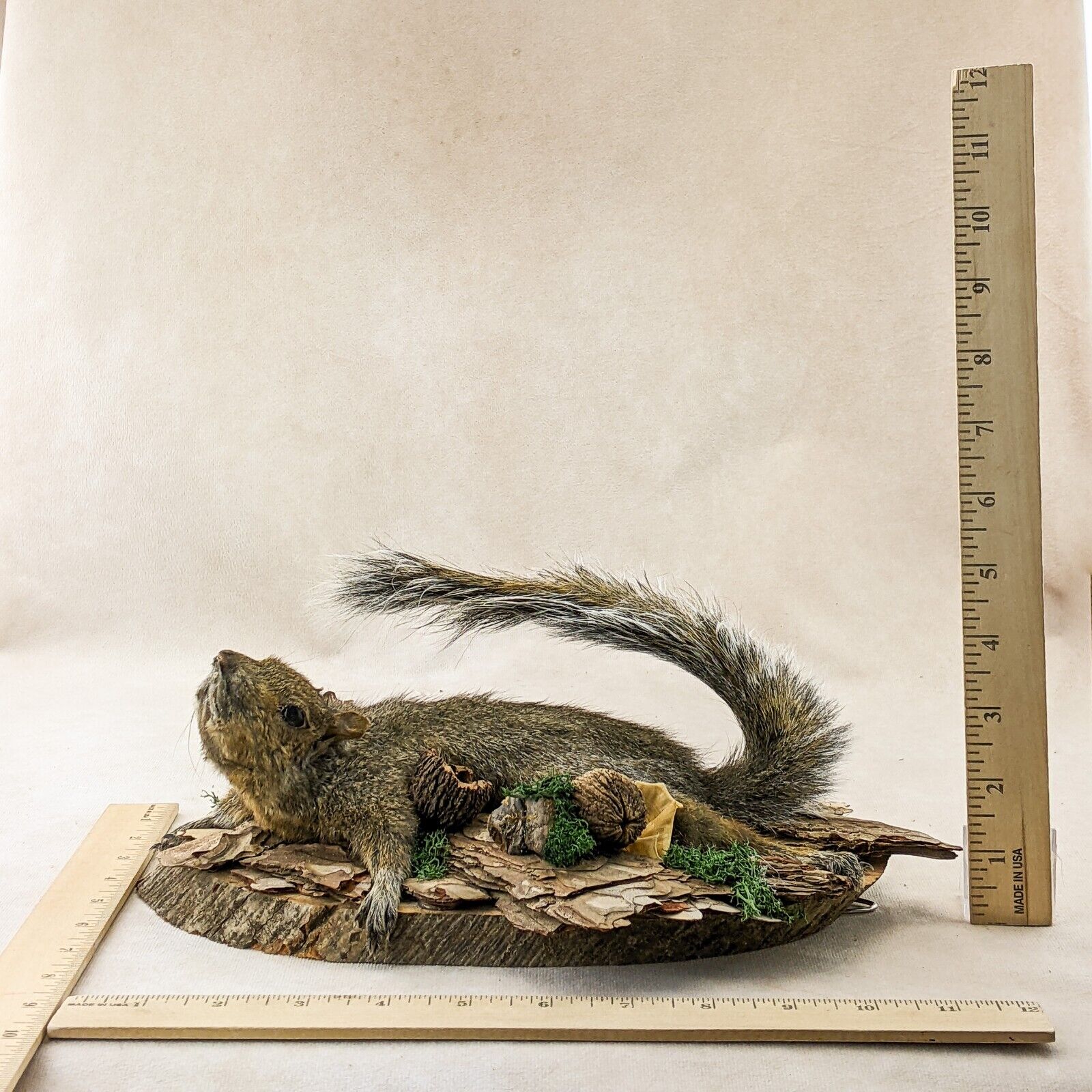 L44S #1.13 This is a taxidermy grey squirrel, mounted to look like it's climbing down a tree trunk! See pictures for size, last picture has a ruler. 12 x 7 x 6" approx. Surrounded by preserved bark, nuts, mosses & shelf fungus.