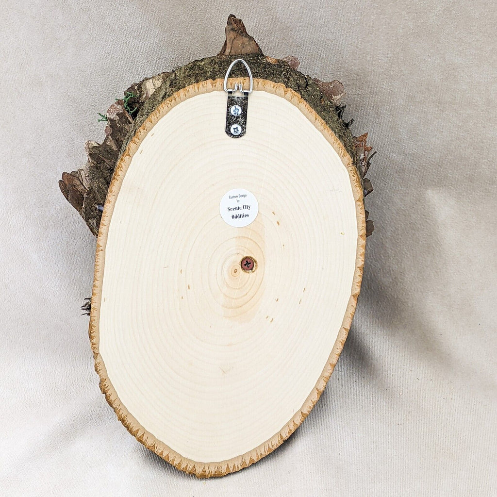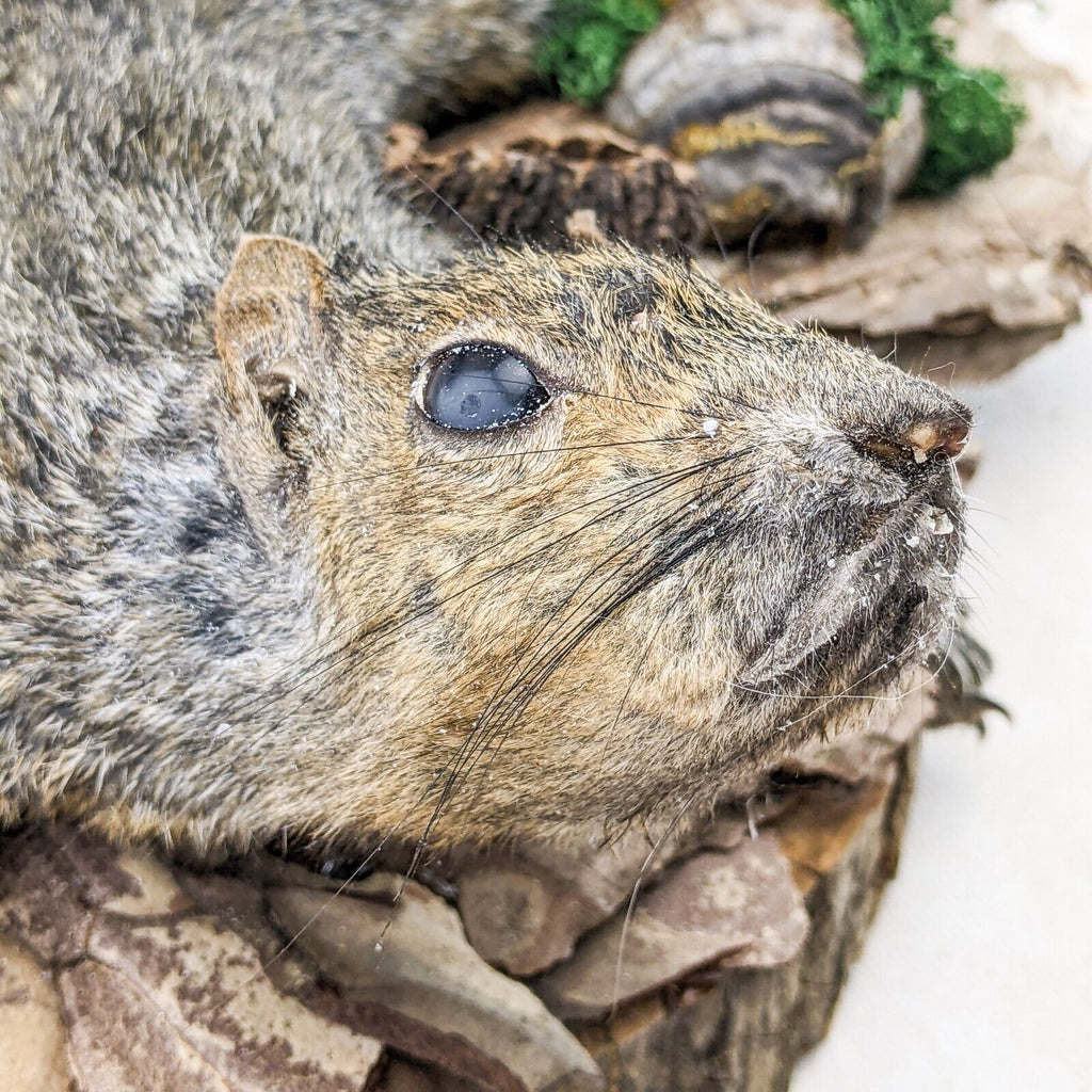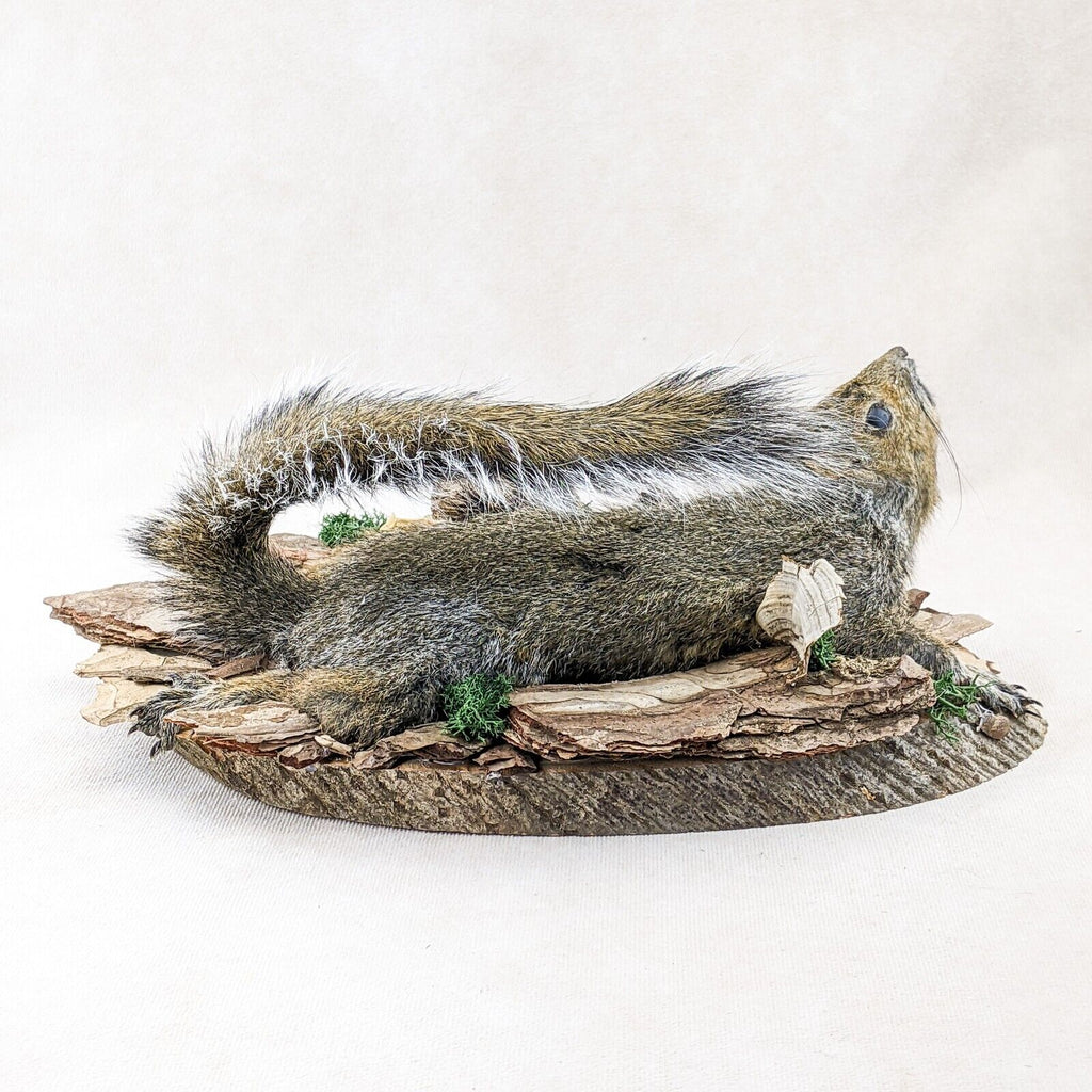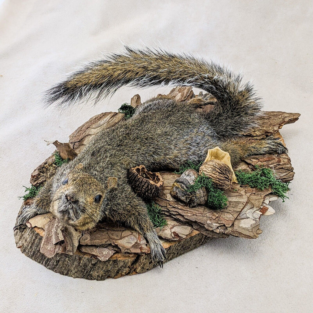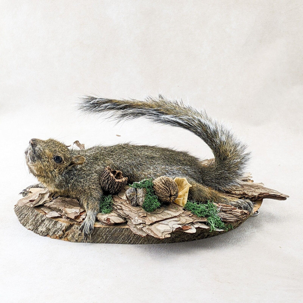 L44S #1.13 This is a taxidermy grey squirrel, mounted to look like it's climbing down a tree trunk! See pictures for size, last picture has a ruler. 12 x 7 x 6" approx. Surrounded by preserved bark, nuts, mosses & shelf fungus.