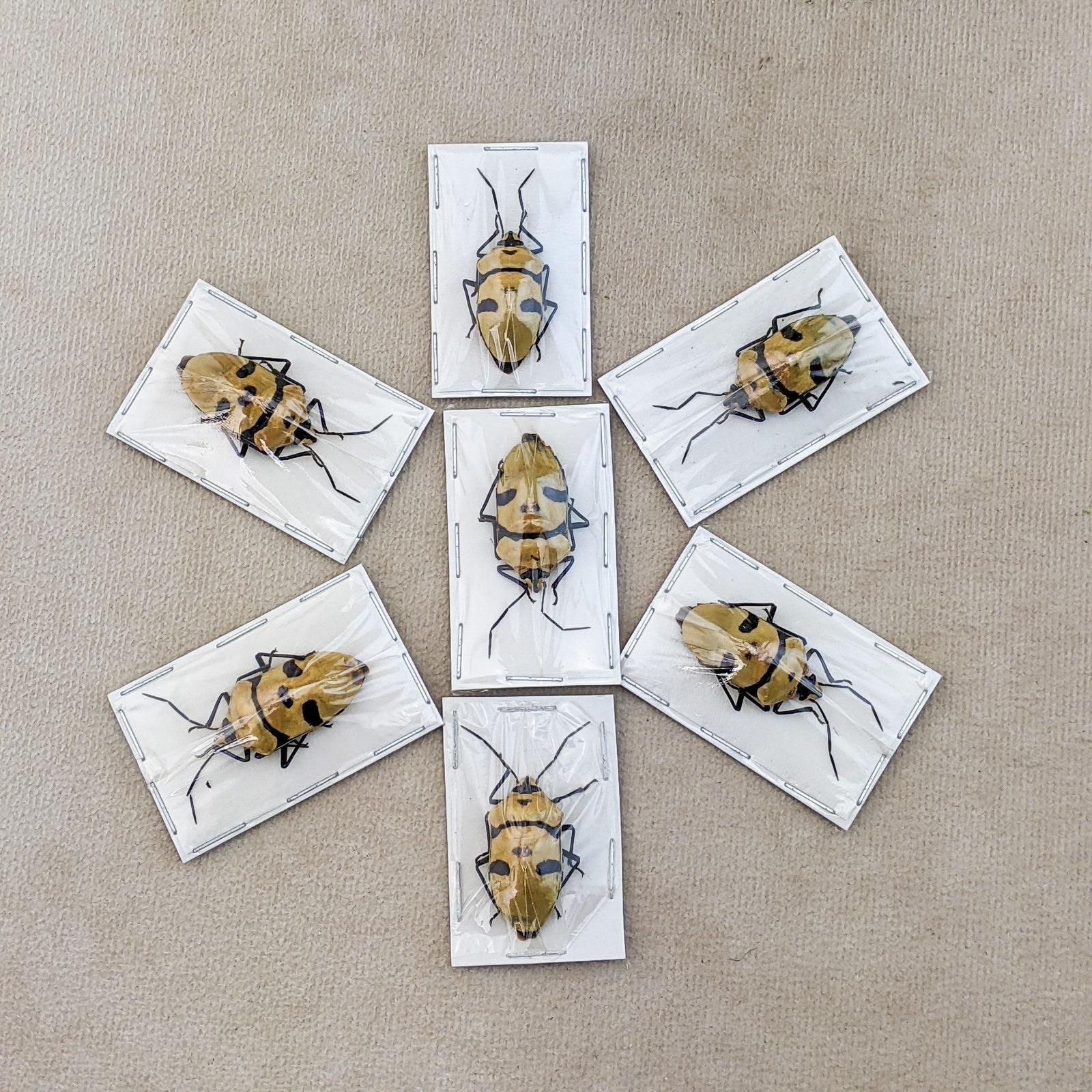 AKA Death Head bug from the family Scutelleridae. If you look closely you can see his skull like face. Indigenous communities believe that this bug is an omen and death to your family will result if this bug is killed. It was discovered in 1778 by British entomologist Dru Drury. This species masses in dense groups of several hundred on fruit trees and are considered as a pest as they feed on the young shoots and sap of valuable crops such as Cashew trees, corn and cotton. The bright color is said to warn predators of its toxicity.