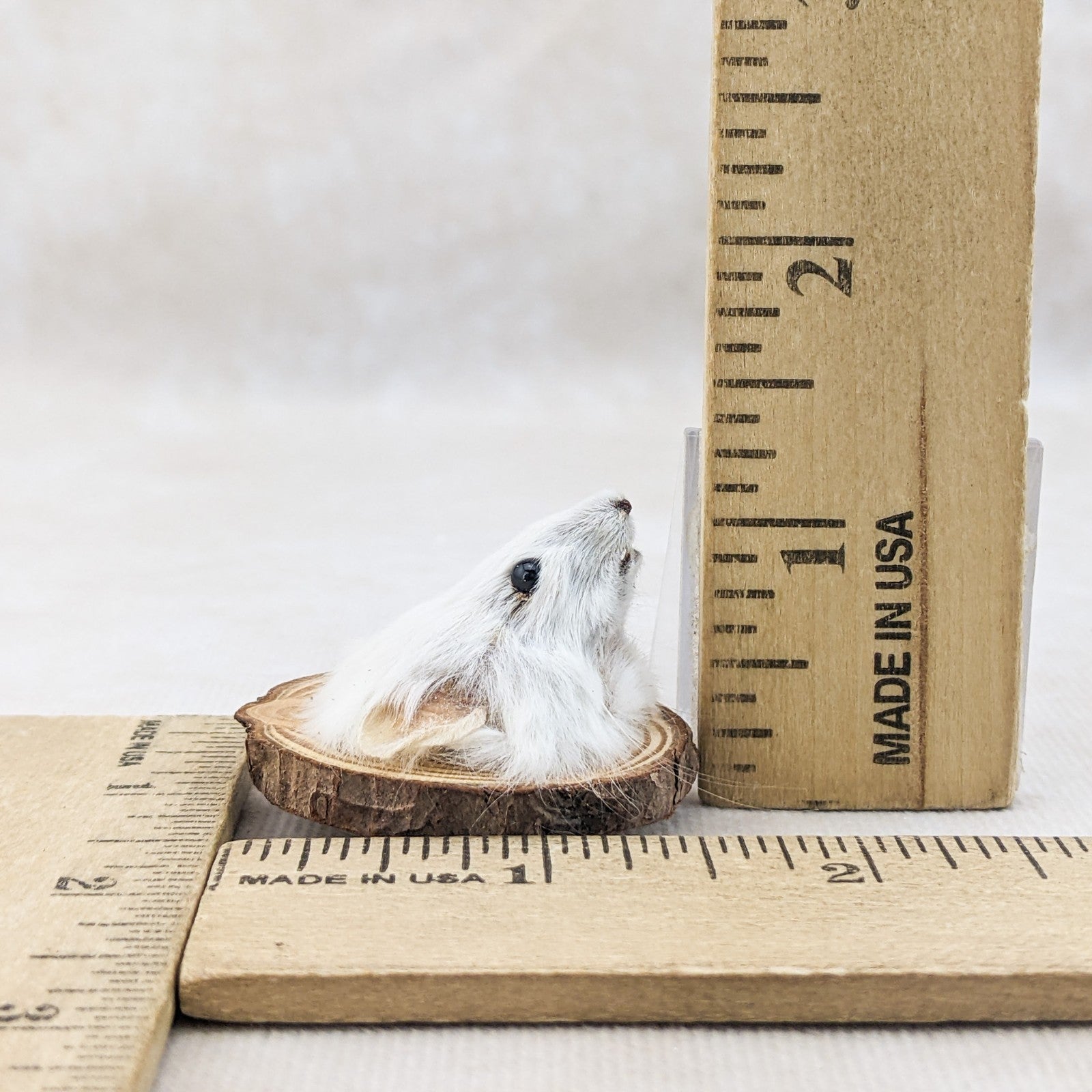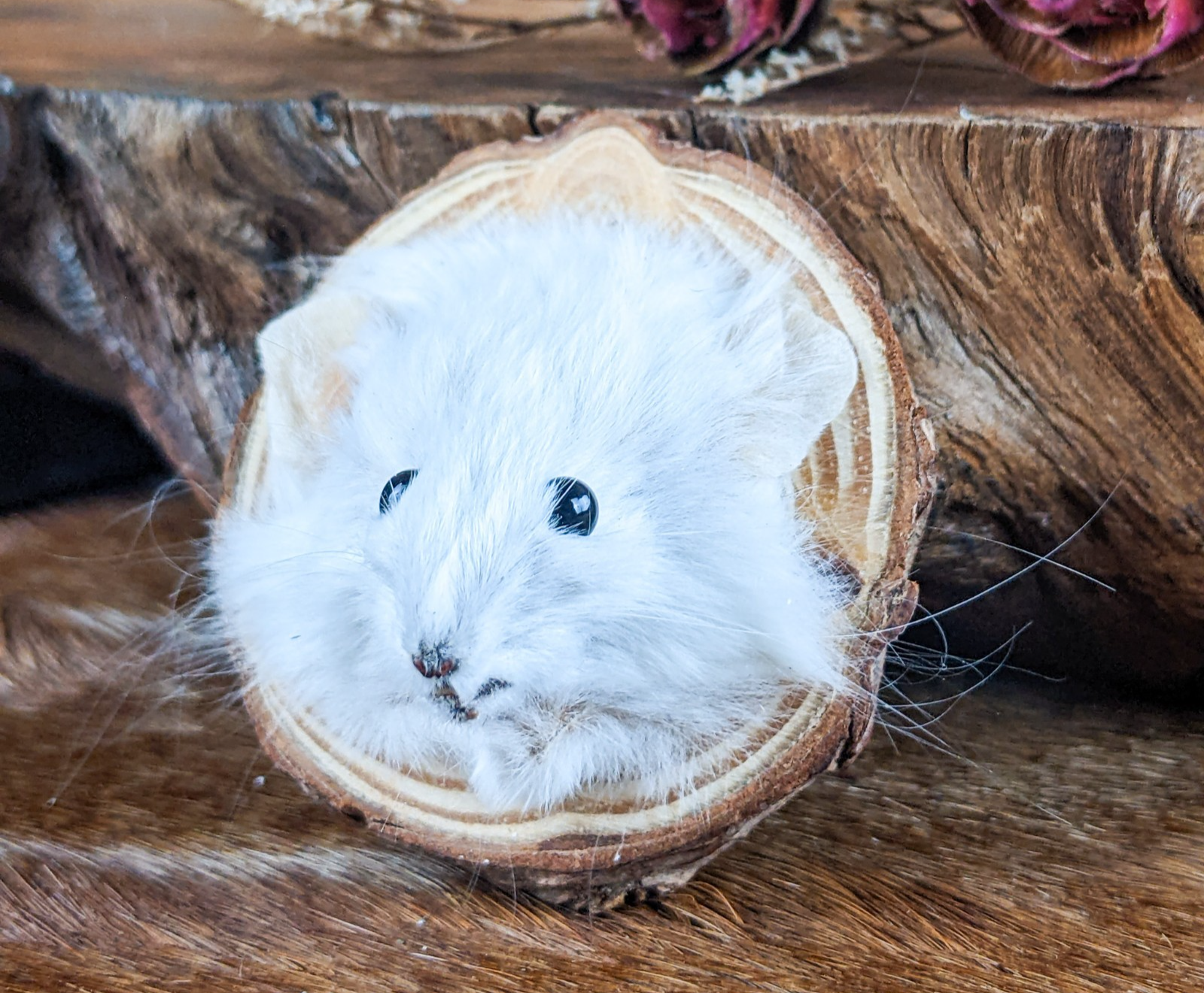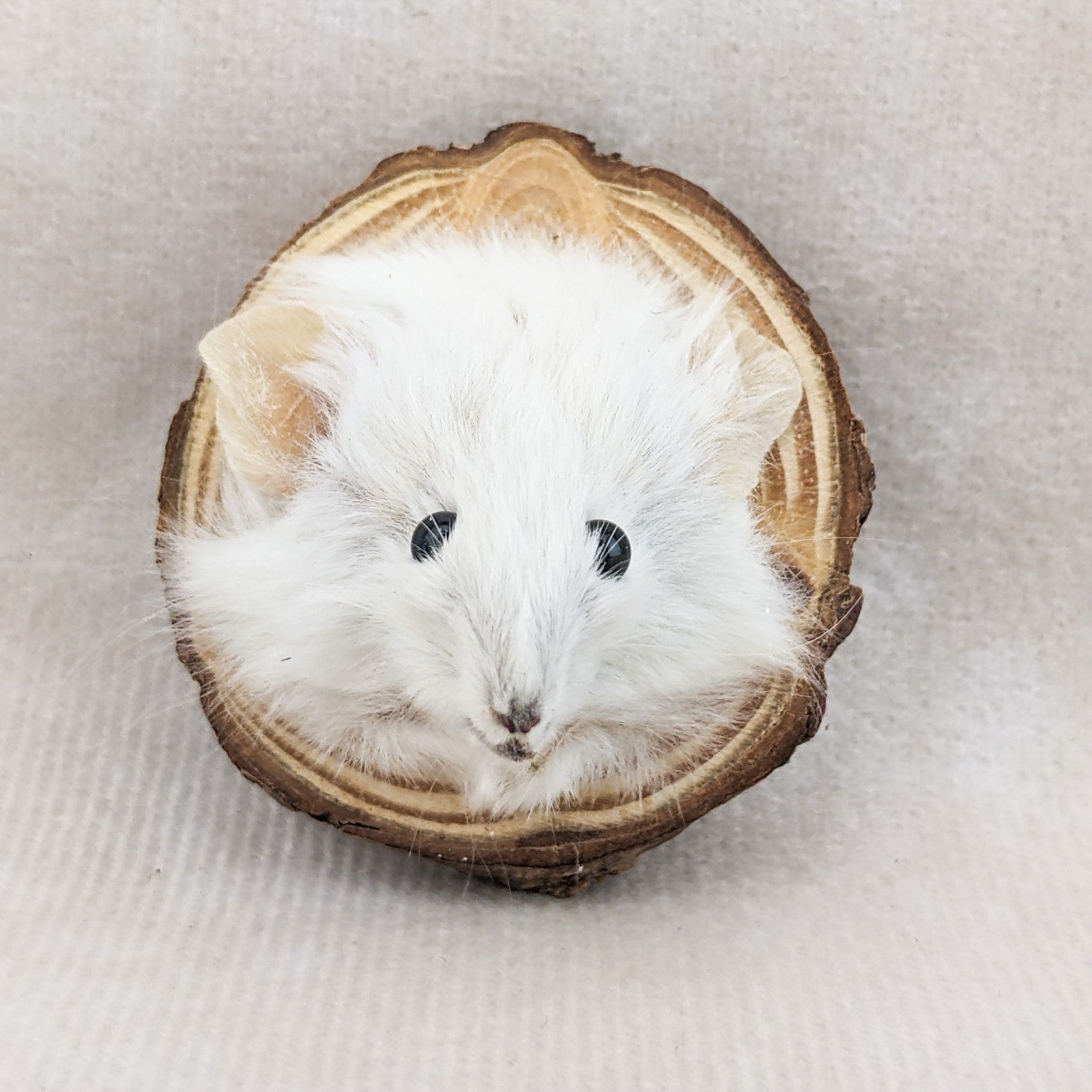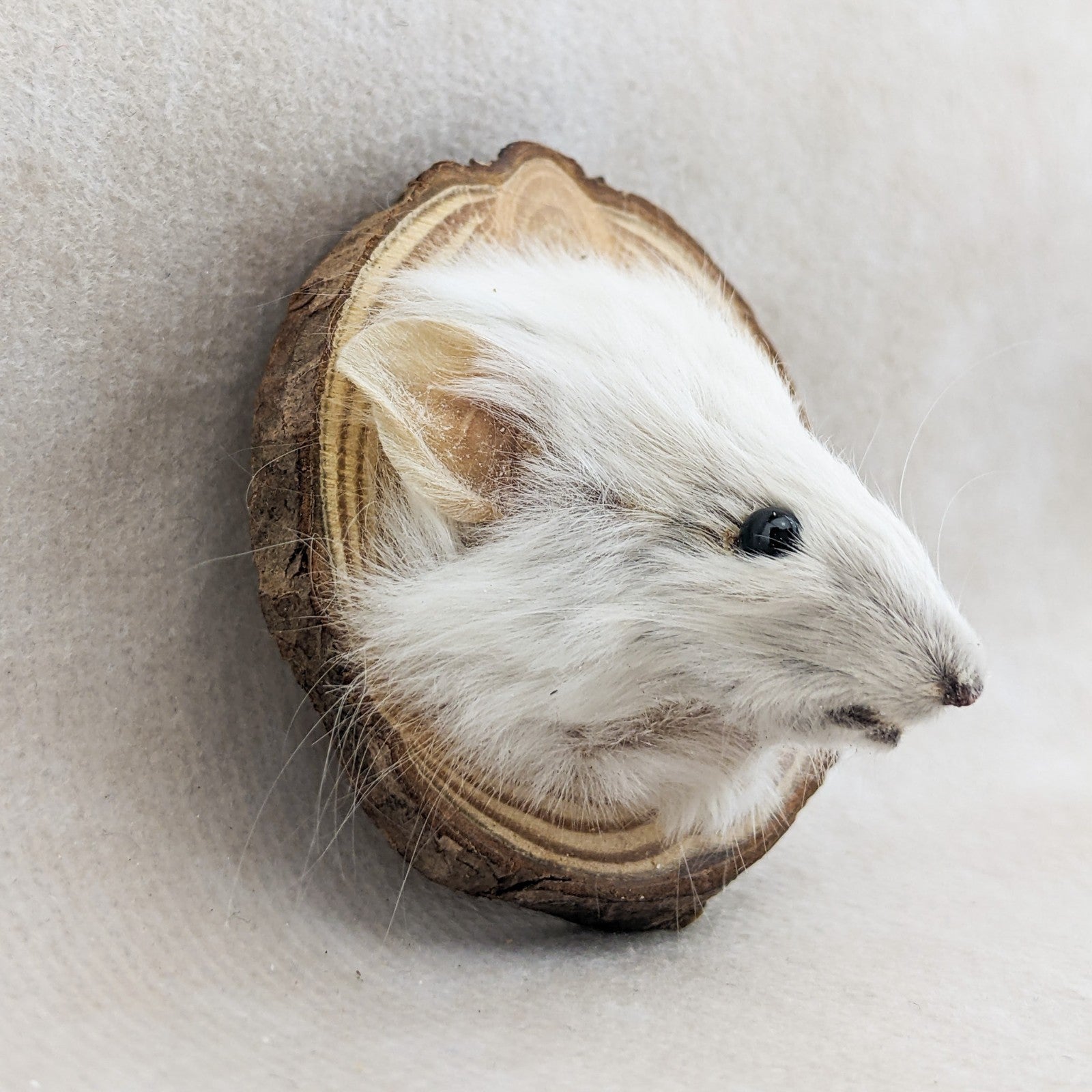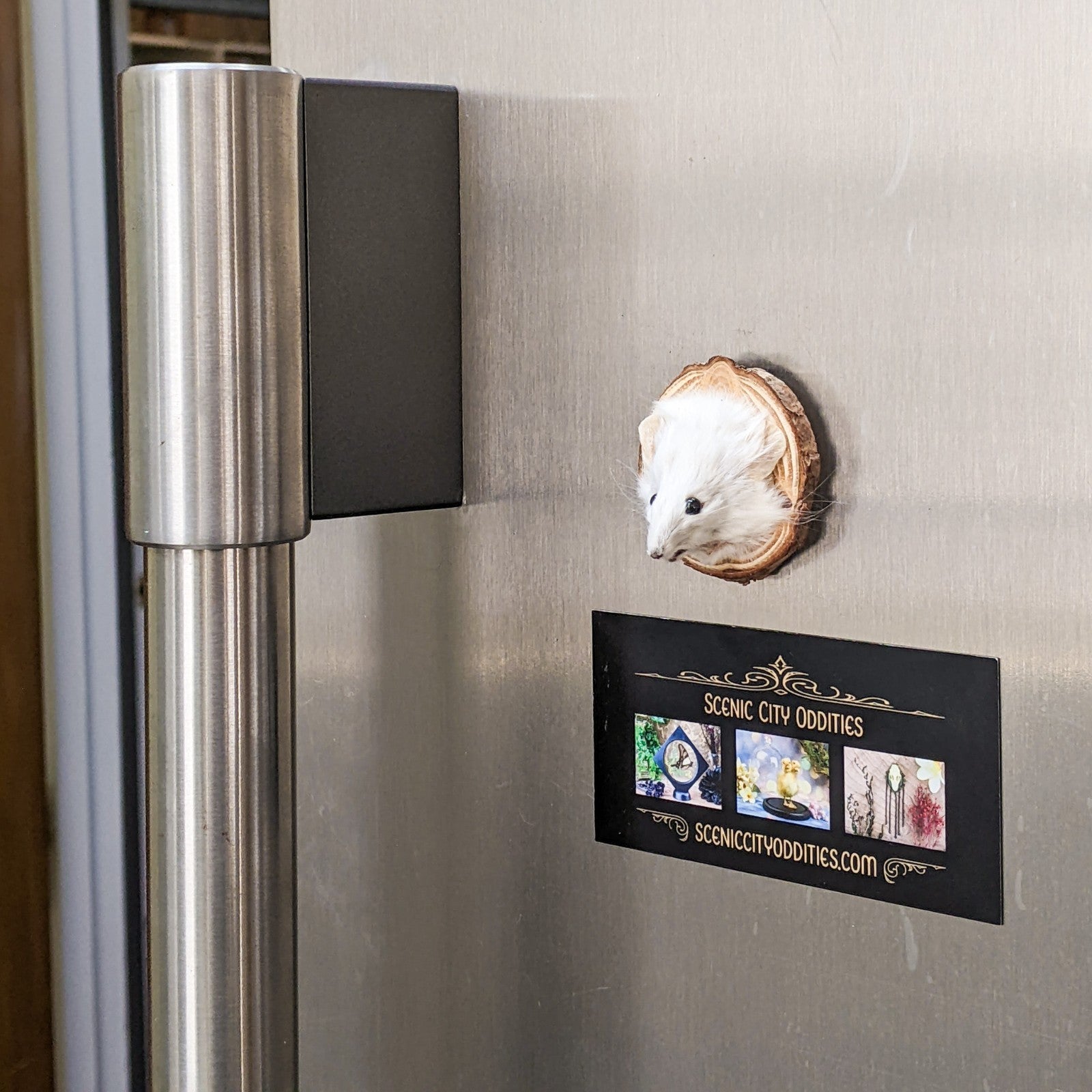 e2a #1 This is an adorable real taxidermy Mouse Head Mount with a wood back and a magnet on the back. This would be a nice conversation piece for you cabinet at work or refrigerator. It will for sure get some attention! Nice little gift for your odd friend! Little "Squeeky" has lost her head! Approx 1 3/4" x 1 3/4" x 1"