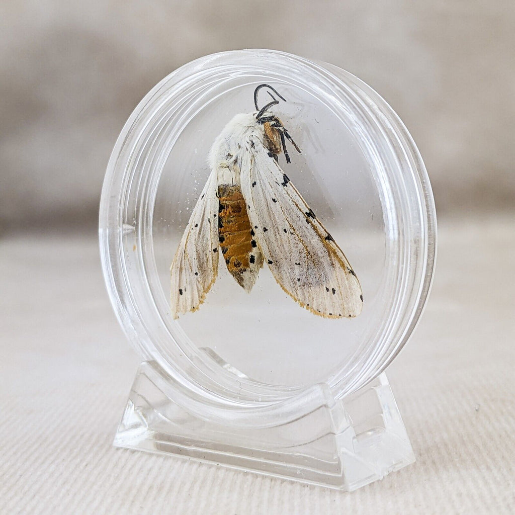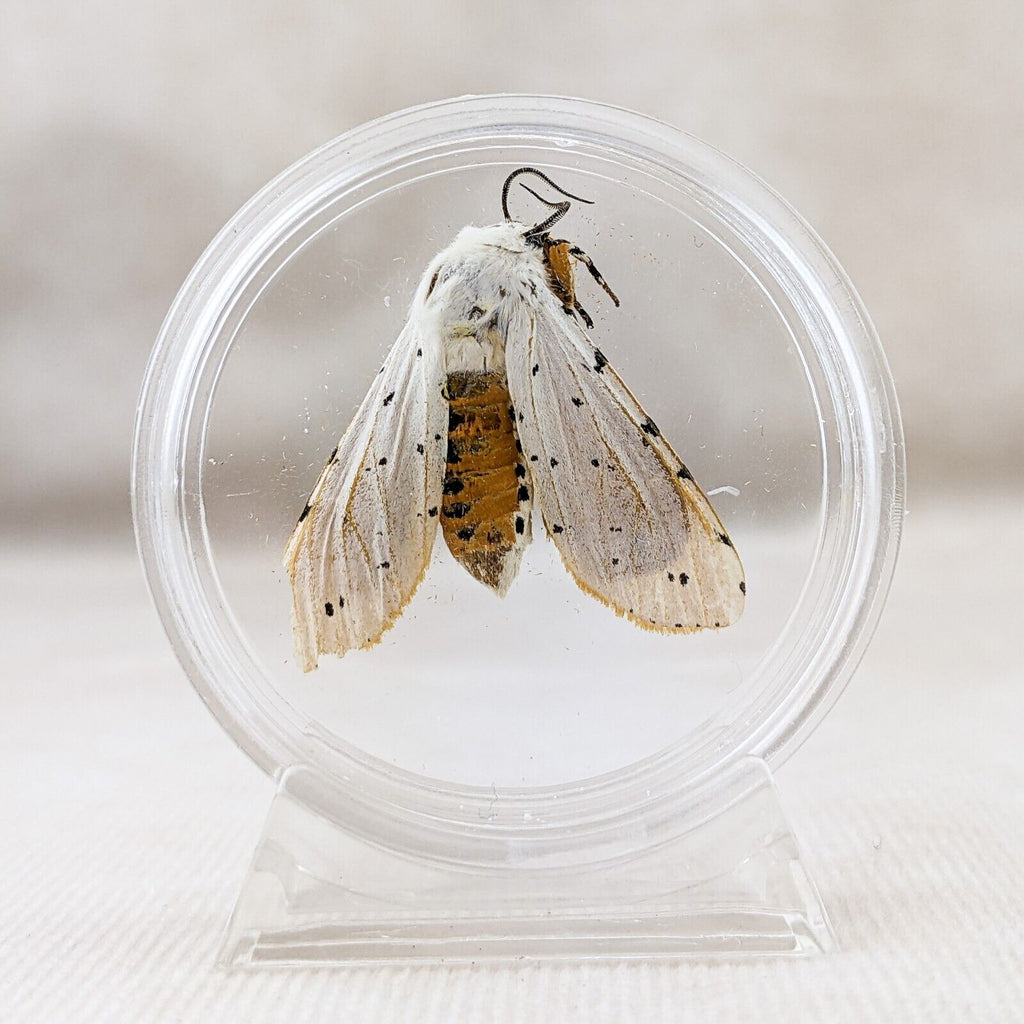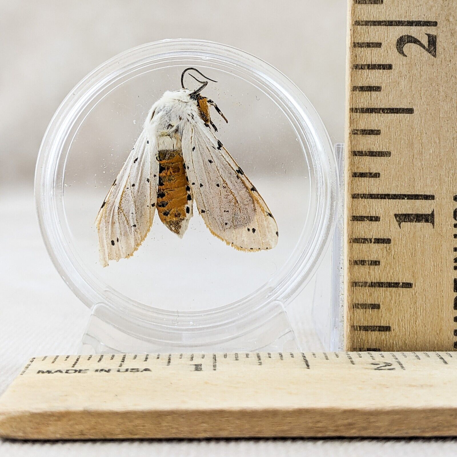 P60b #  This is a very nice display of a Salt Marsh Moth in an acrylic case with a removable acrylic stand.  Nice addition to any collection or a great starter piece!