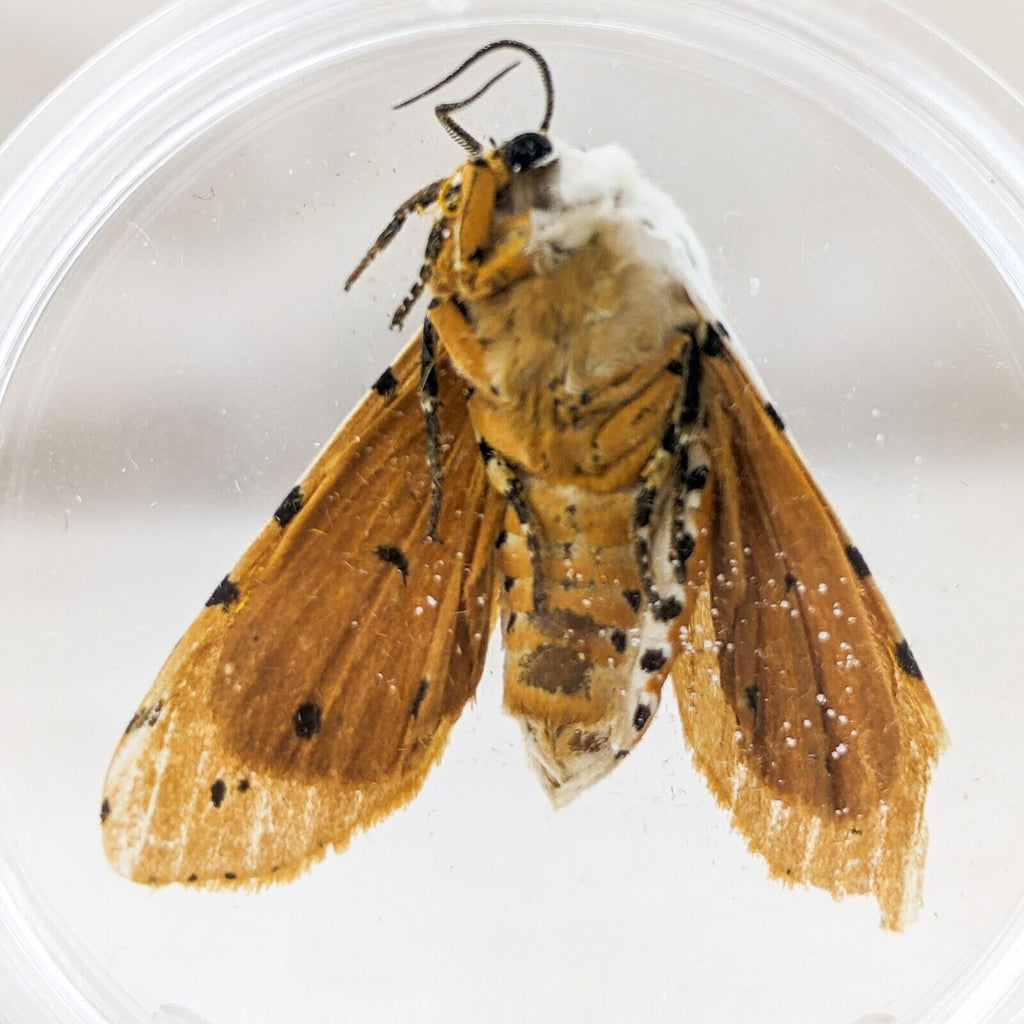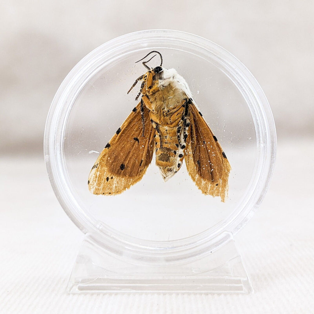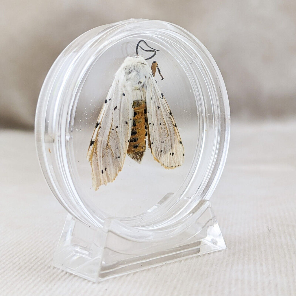 P60b #  This is a very nice display of a Salt Marsh Moth in an acrylic case with a removable acrylic stand.  Nice addition to any collection or a great starter piece!
