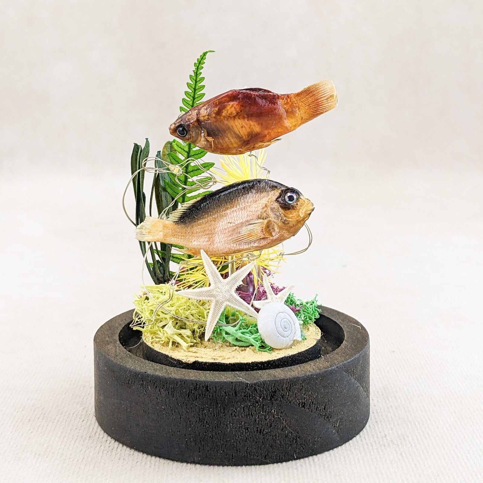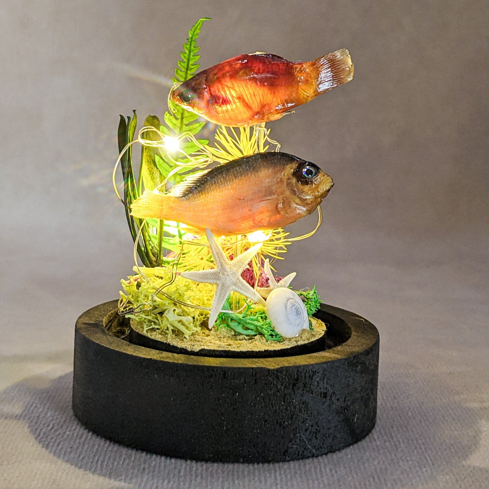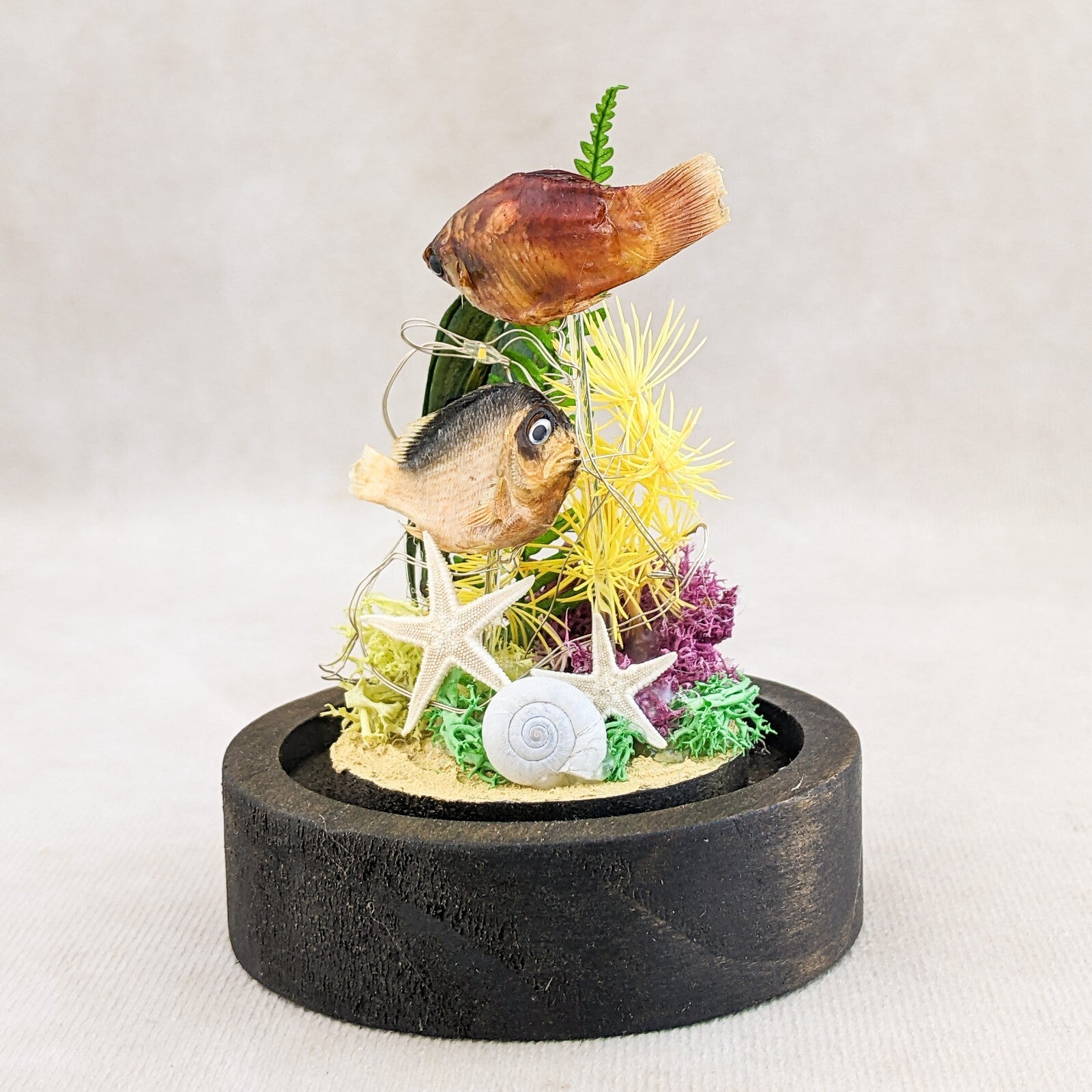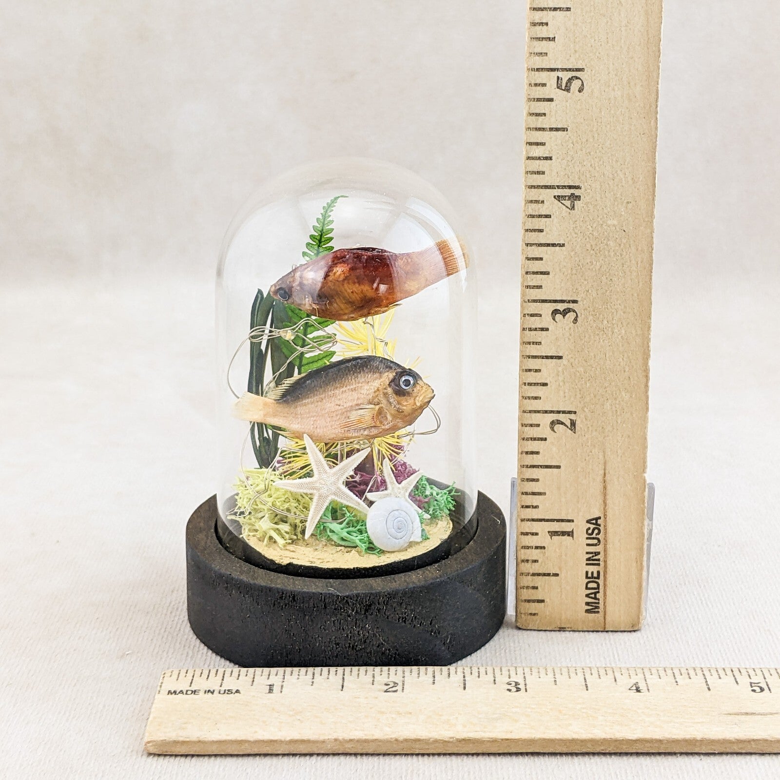 Encased in a miniature glass dome with stained brown, wood base, this captivating display features two real taxidermy beautiful fish posed mid-swim in their own tiny undersea world that lights up. The sea floor is covered in soft faux sand, creating a realistic ocean bed, while the surrounding environment is brought to life with preserved aquatic plants, vibrant corals, coloful moss, shells, and two delicate little starfish. The light up switch is at the bottom of the base.