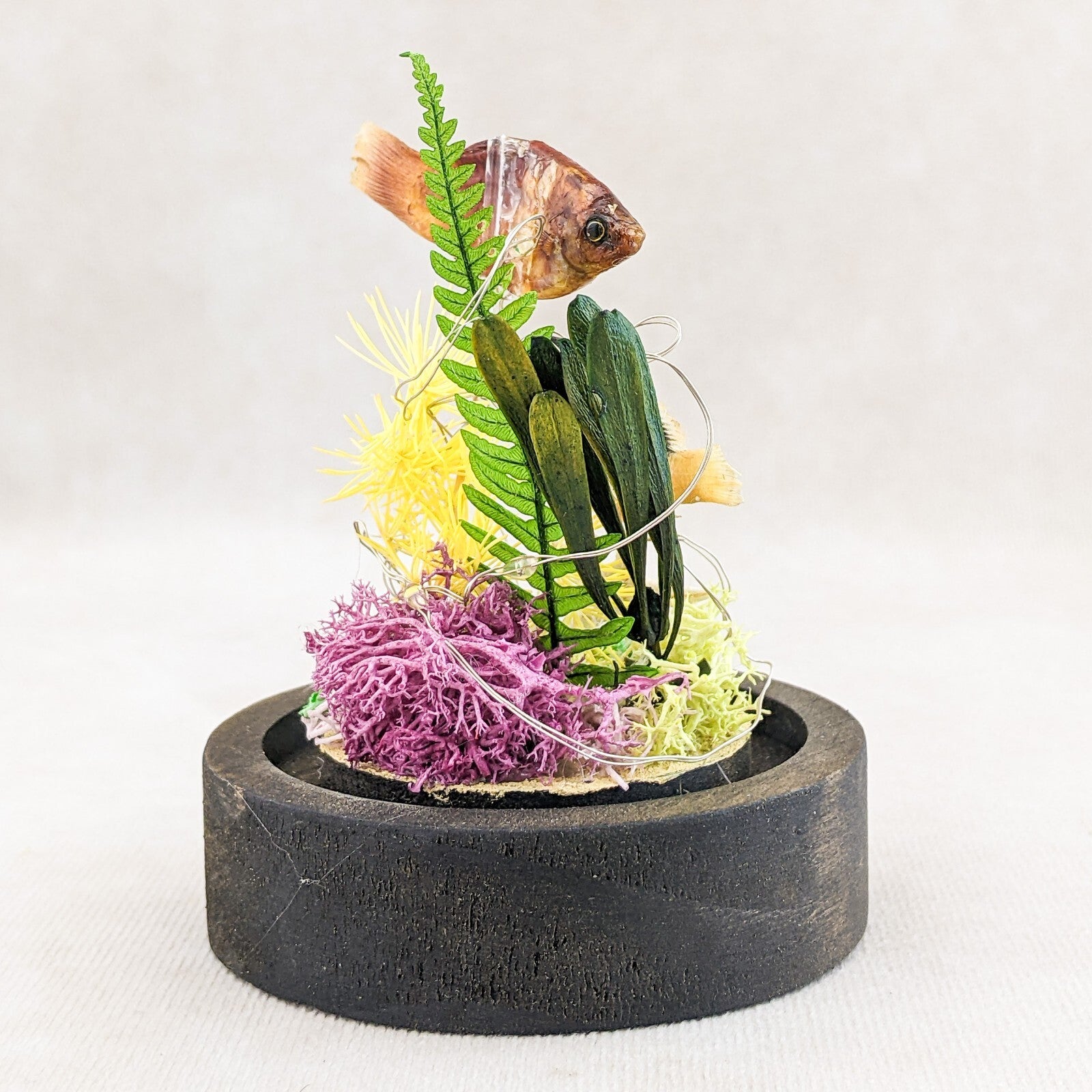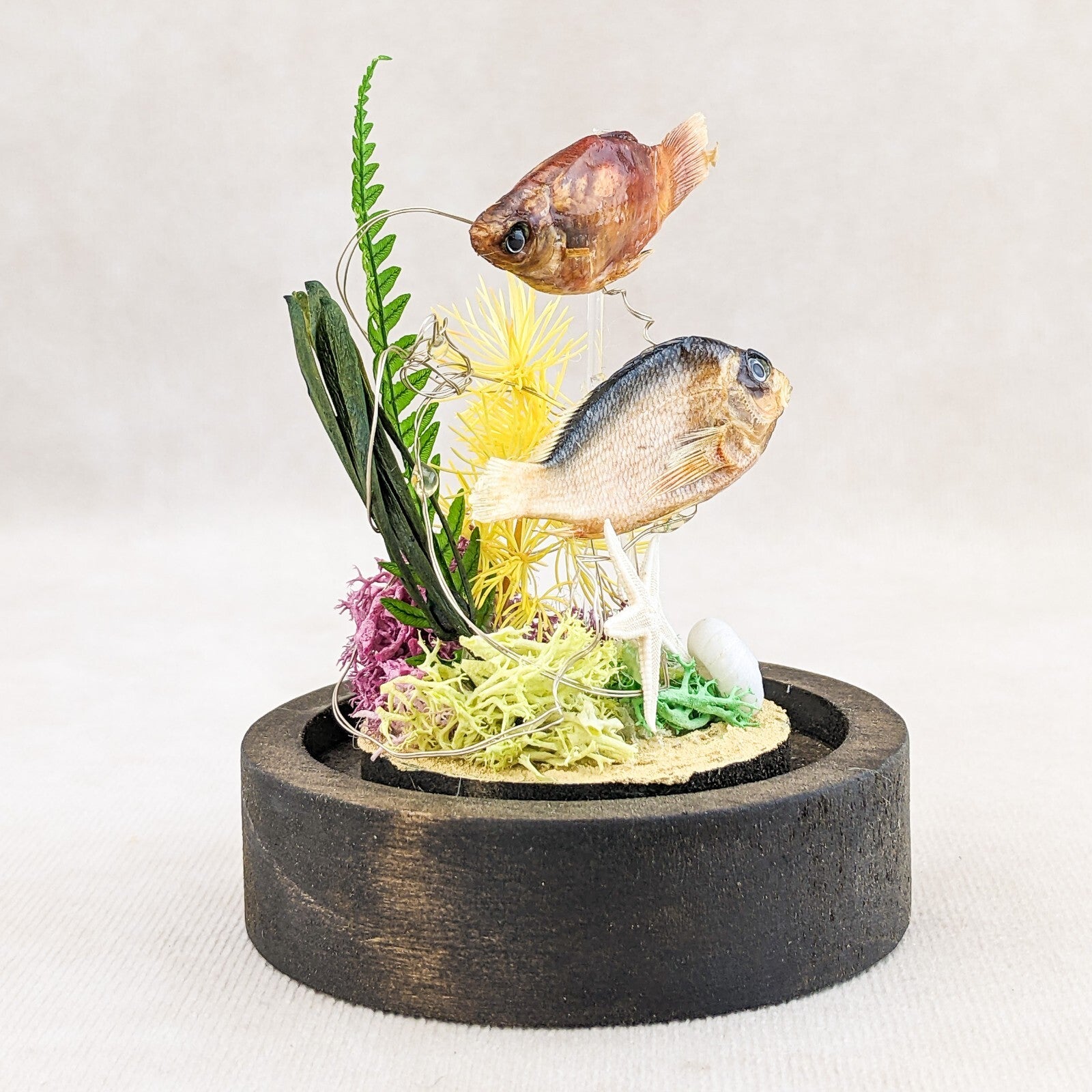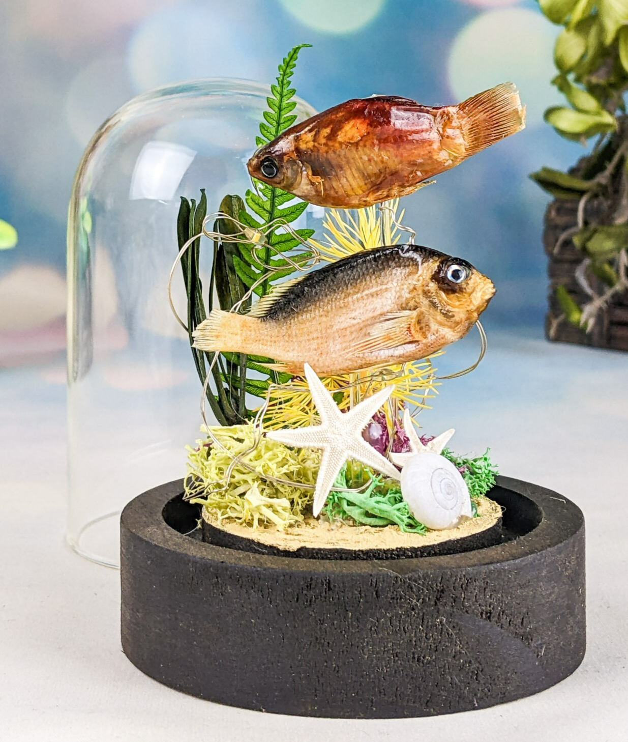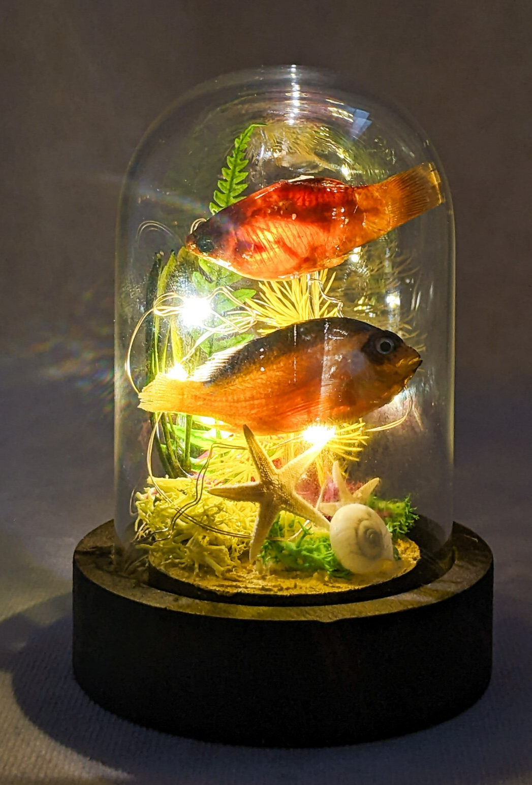Encased in a miniature glass dome with stained brown, wood base, this captivating display features two real taxidermy beautiful fish posed mid-swim in their own tiny undersea world that lights up. The sea floor is covered in soft faux sand, creating a realistic ocean bed, while the surrounding environment is brought to life with preserved aquatic plants, vibrant corals, coloful moss, shells, and two delicate little starfish. The light up switch is at the bottom of the base.