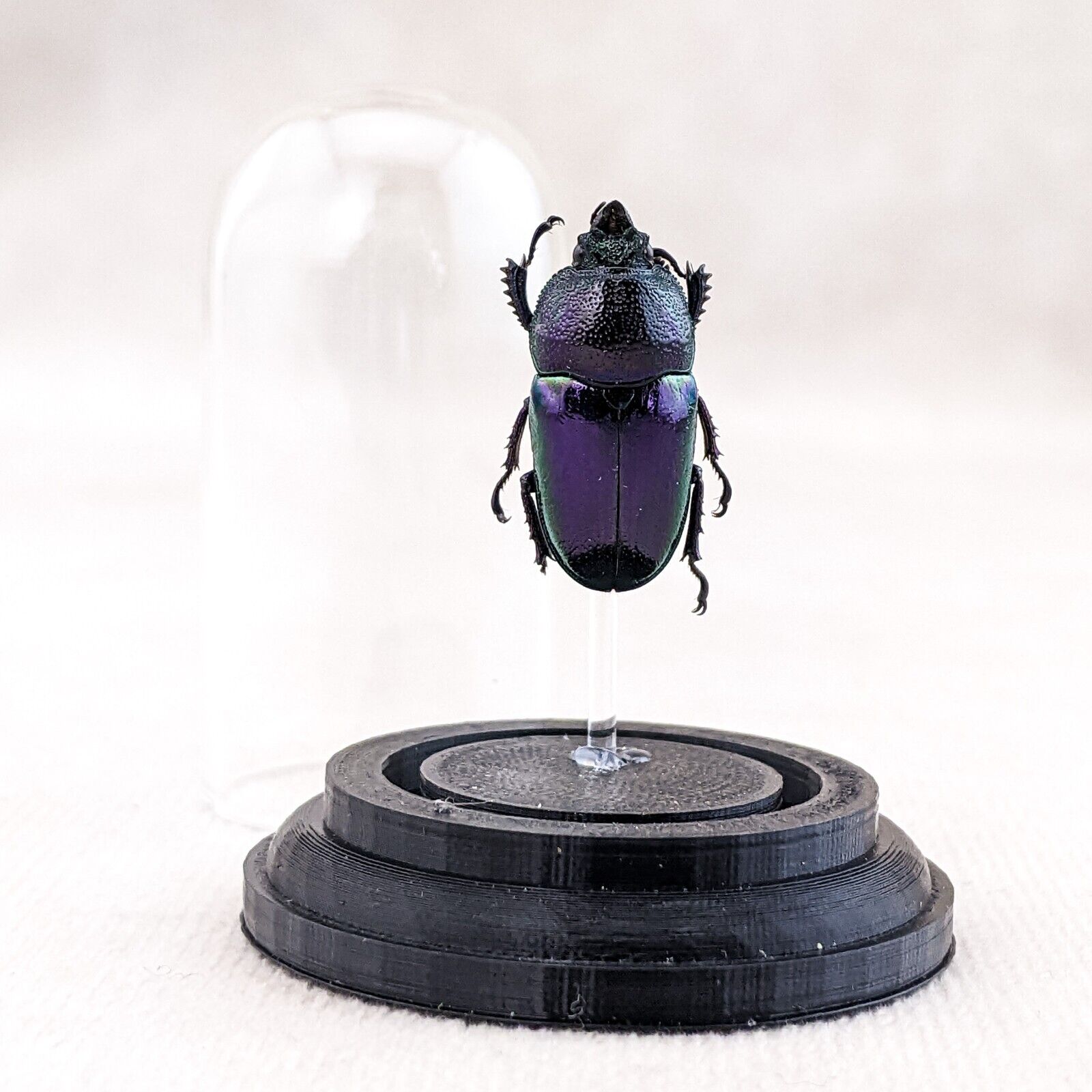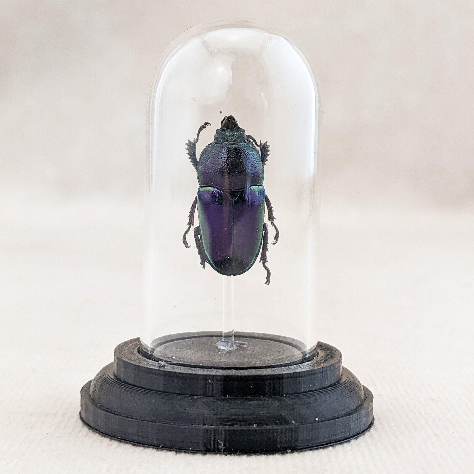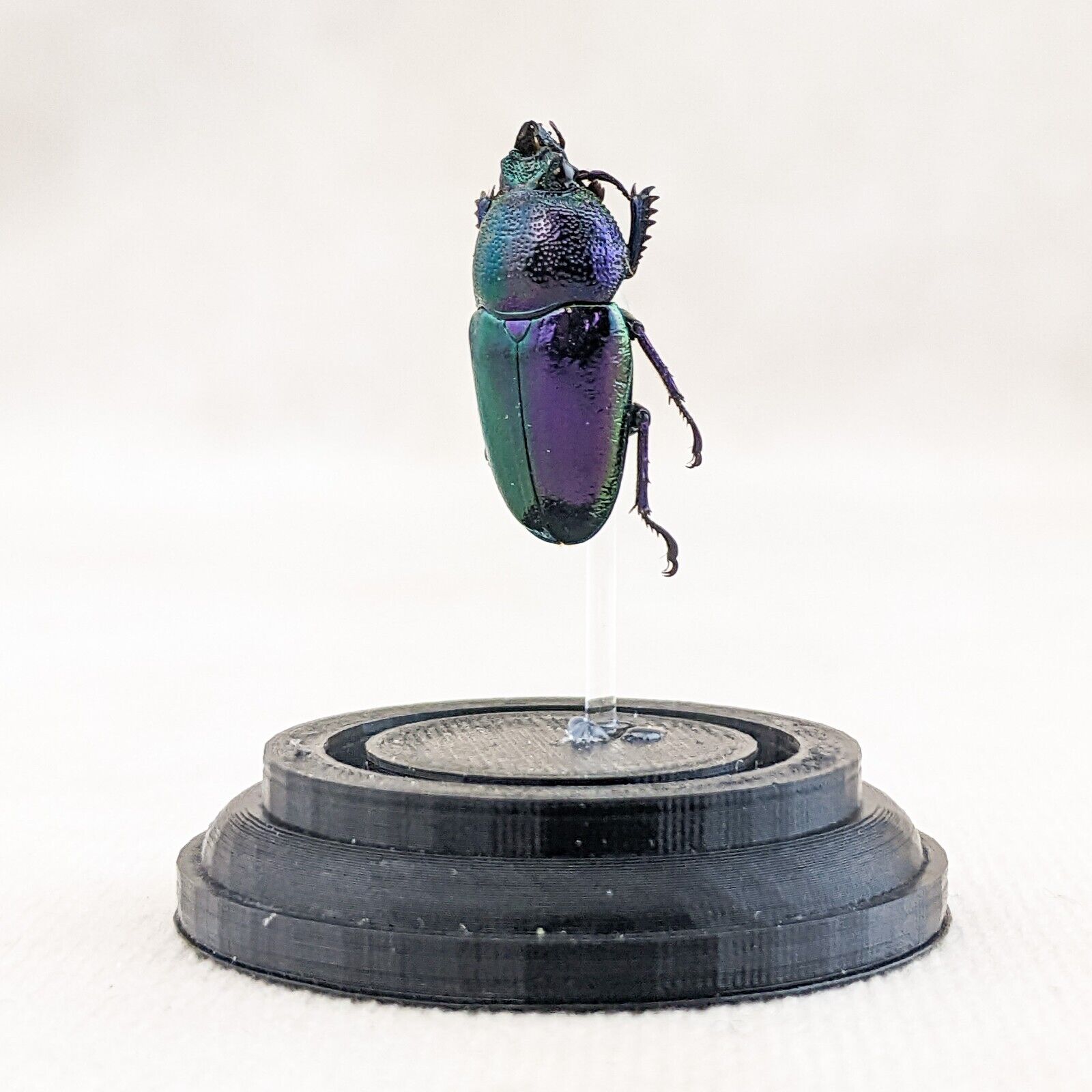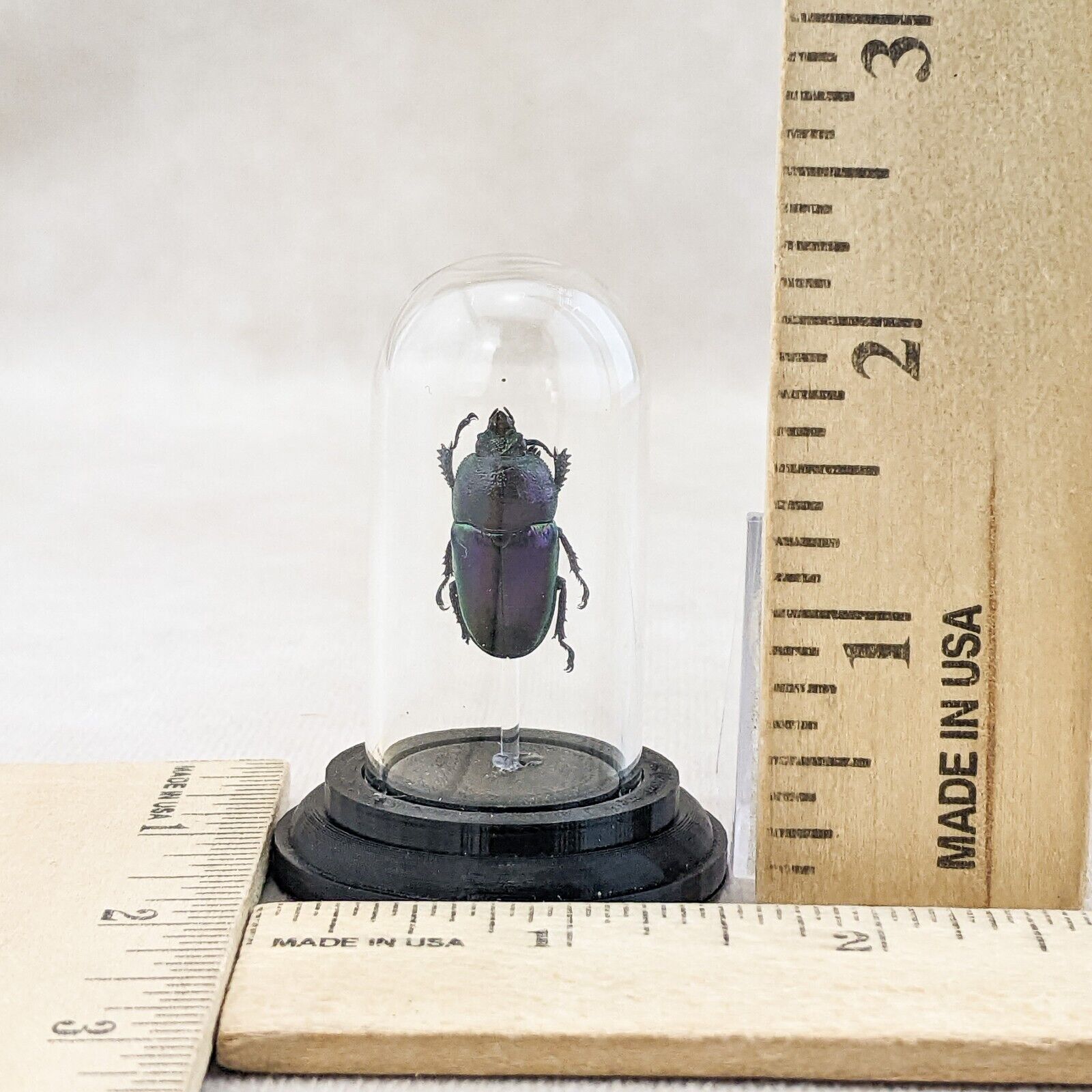 A24d #2  Beautiful Coloring-purple!  This is a very nice Mount Arfak Female stag beetle (Lamprina Adolphinae-species) specimen showcased nicely in a display dome to add to your collection!   The dome will keep her safe and clean for years to come.  This display is approx. 1 3/4" x 1 1/2" x 2 1/4" and is a glass dome with clear bottom.  The beetle is attached to a post for easy viewing.   This is a great specimen to start your collection with!